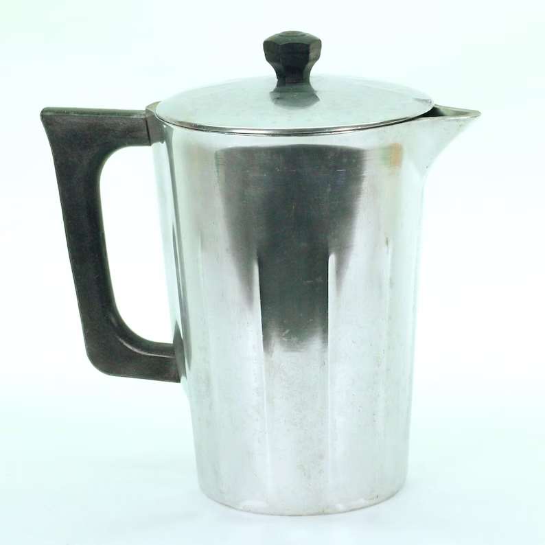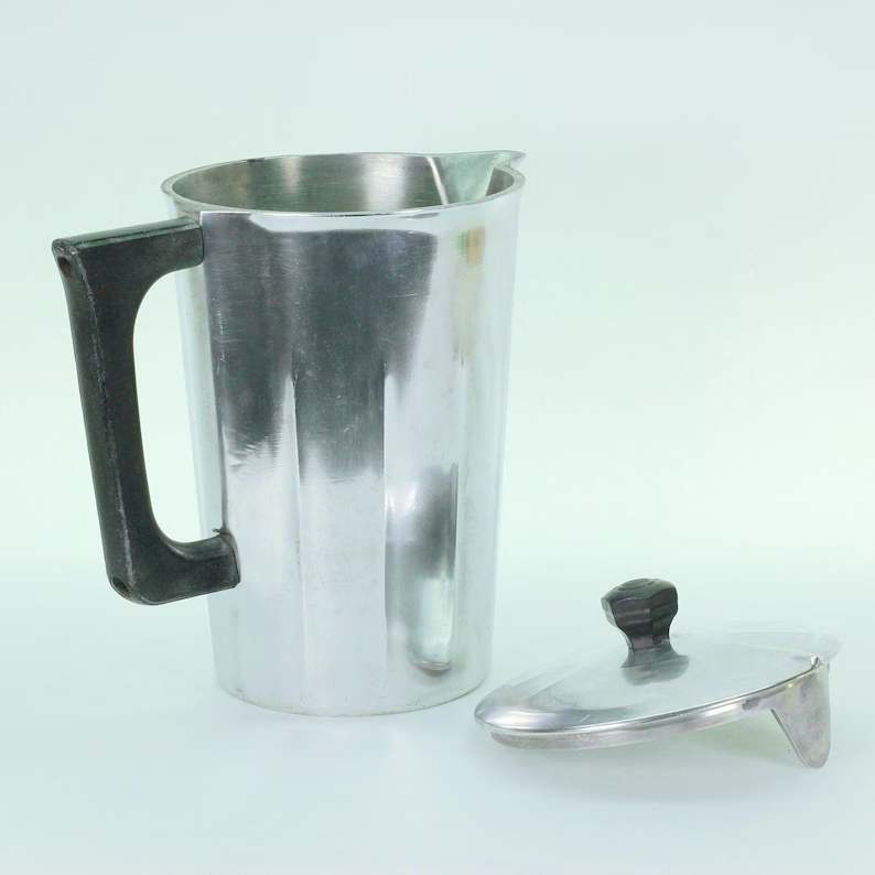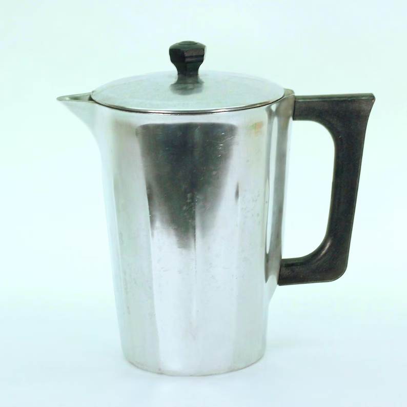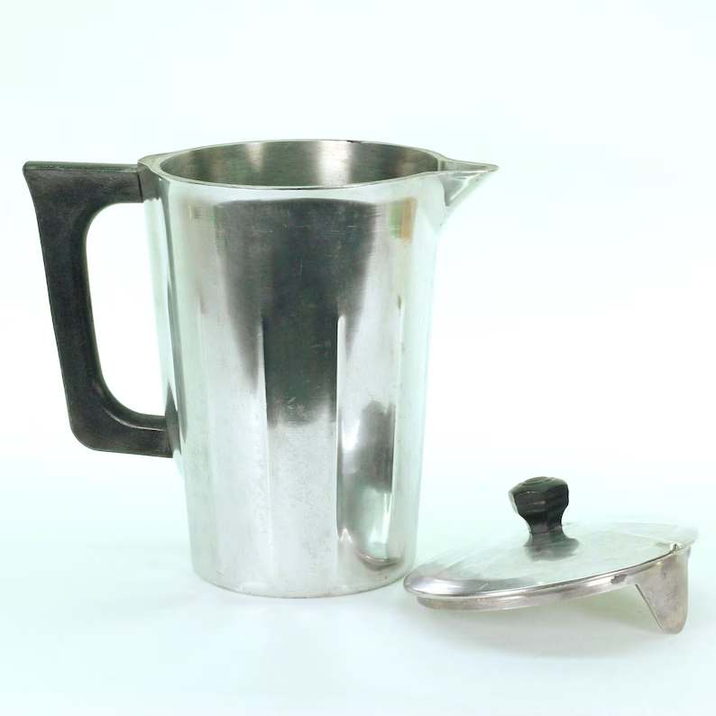 Serve your coffee mid-century style! This vintage aluminum Household Institute coffee pot wasn’t designed to brew — it was made to serve and keep coffee hot at the table. Before the era of plug-in percolators and thermal carafes, homemakers warmed these lightweight aluminum servers on the stove, then poured in freshly brewed coffee. The result? Hot coffee that stayed warm through the whole meal without scorching or burning.