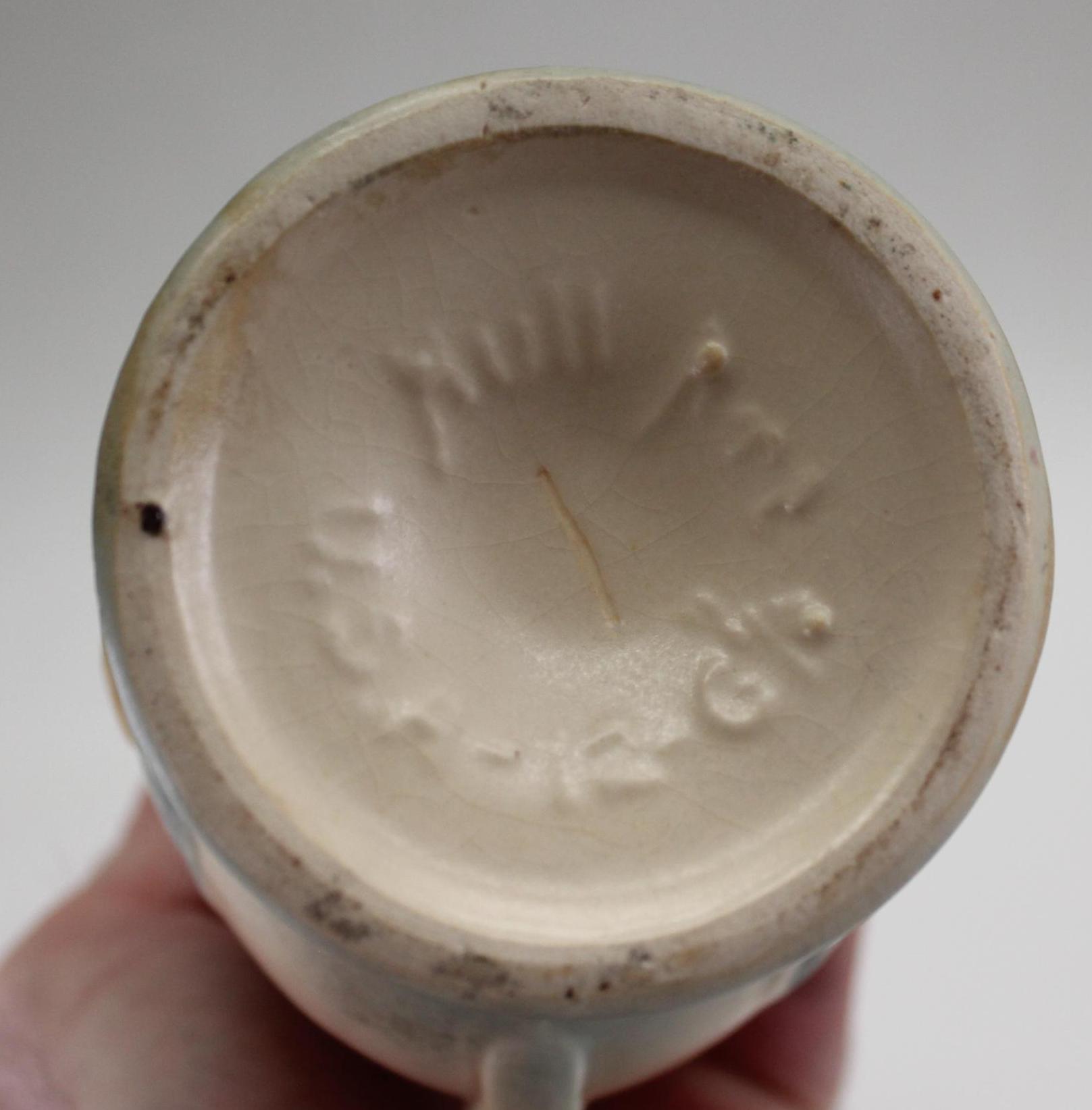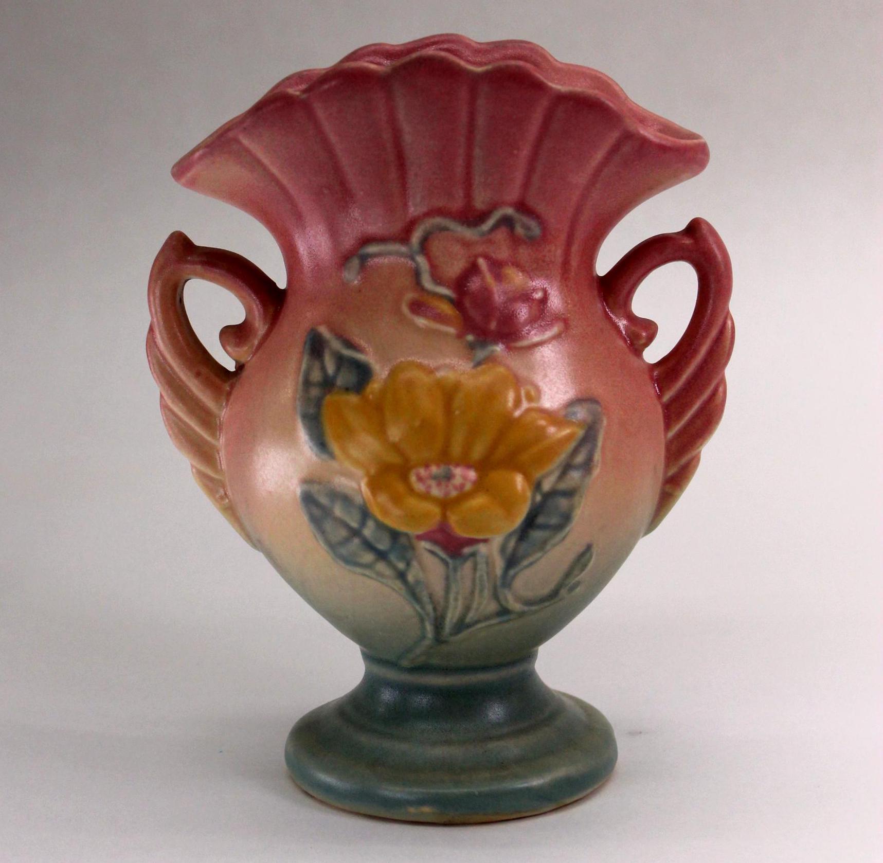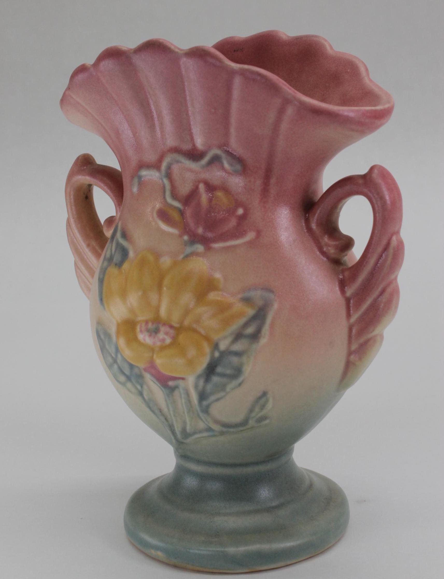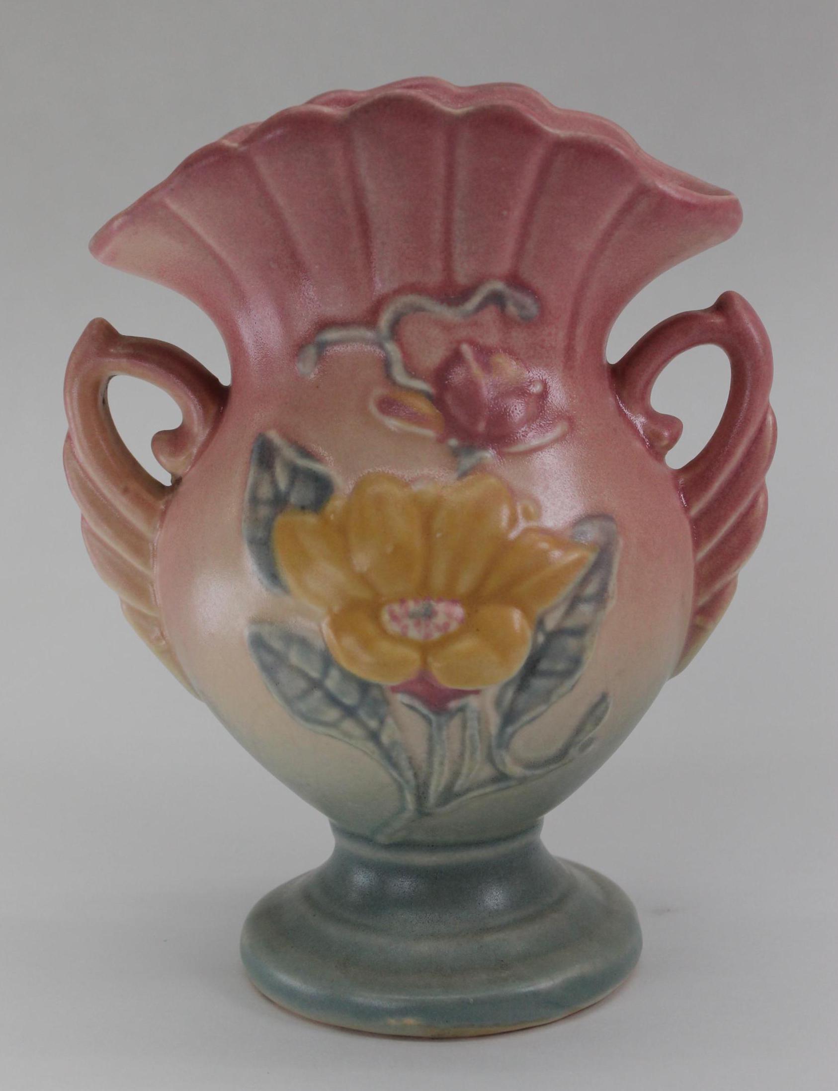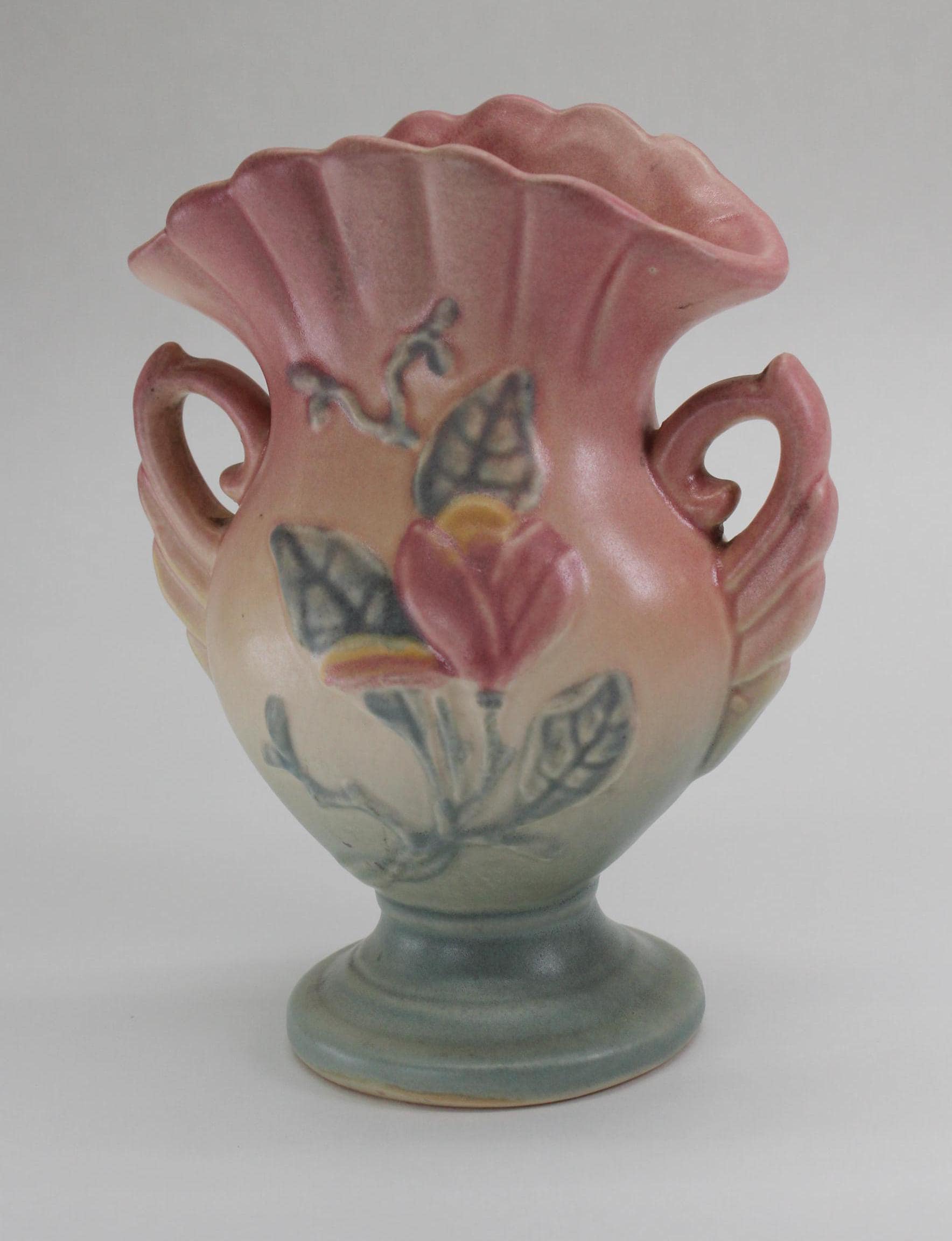 🌸 Whimsical Magnolia series vase by Hull Art Pottery, featuring dramatic fan-shaped rim and fanciful handles reminiscent of flamingo silhouettes. The vessel’s soft, barely-yellow body fades to rose pink at the top and teal blue at the foot, with a different raised magnolia design on each side.