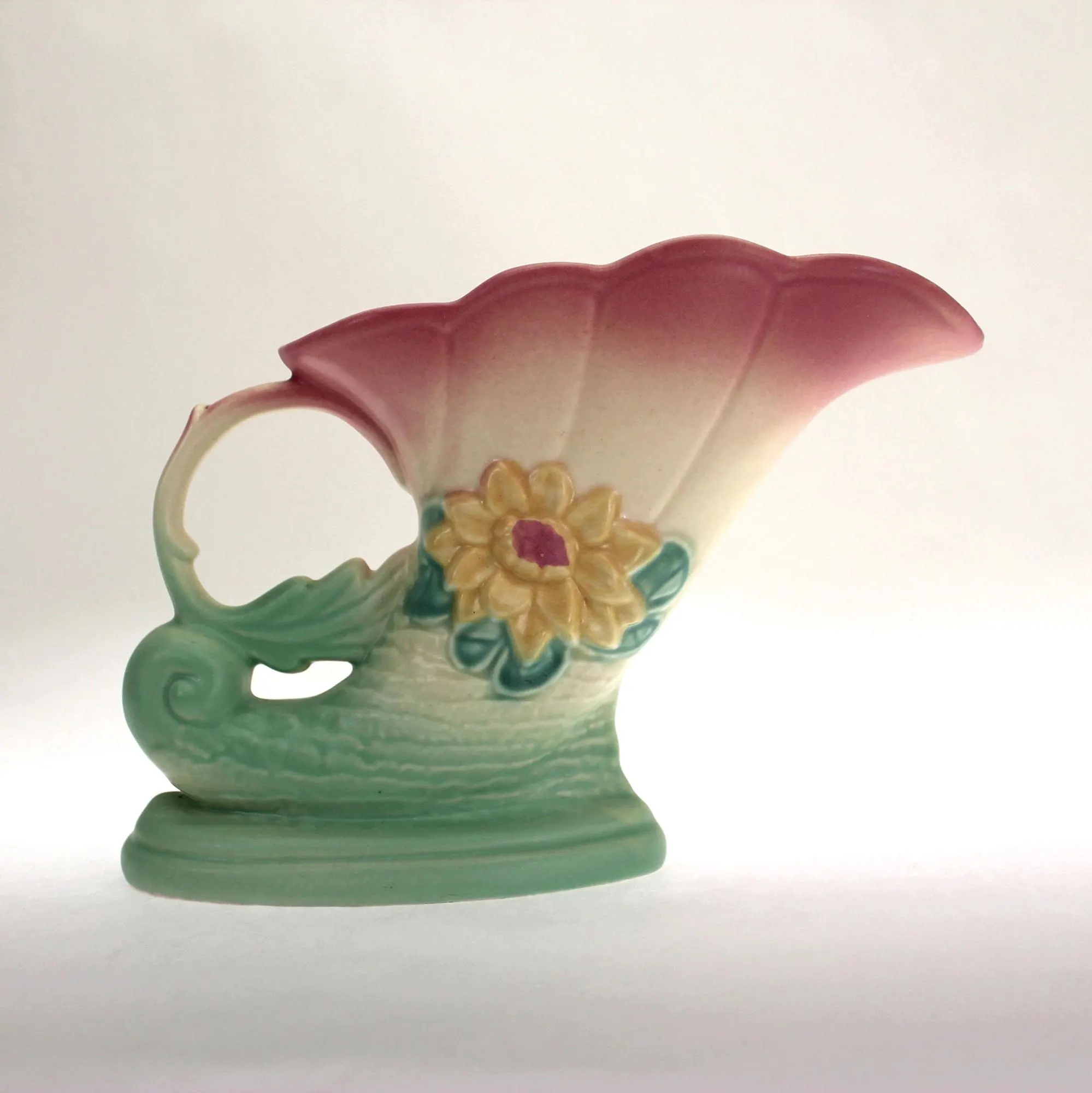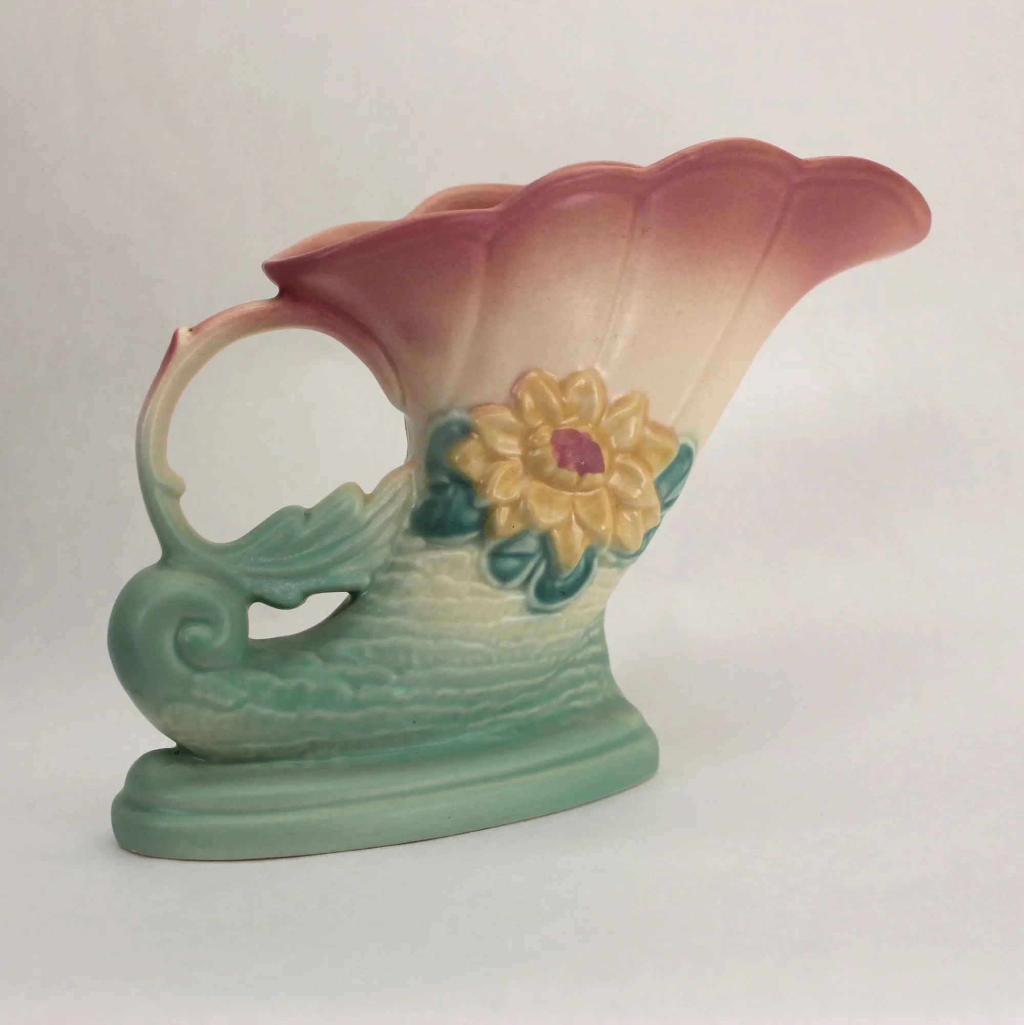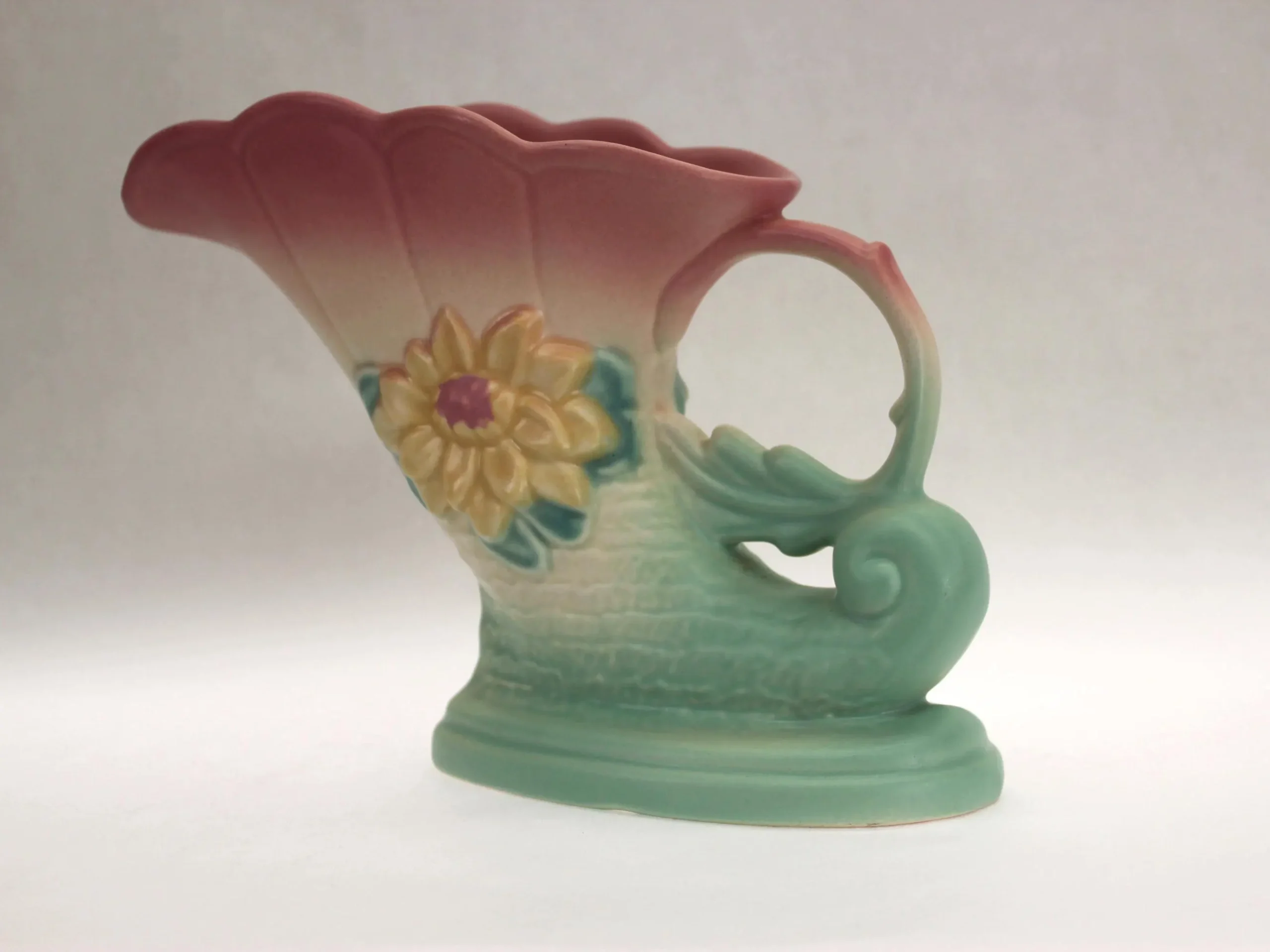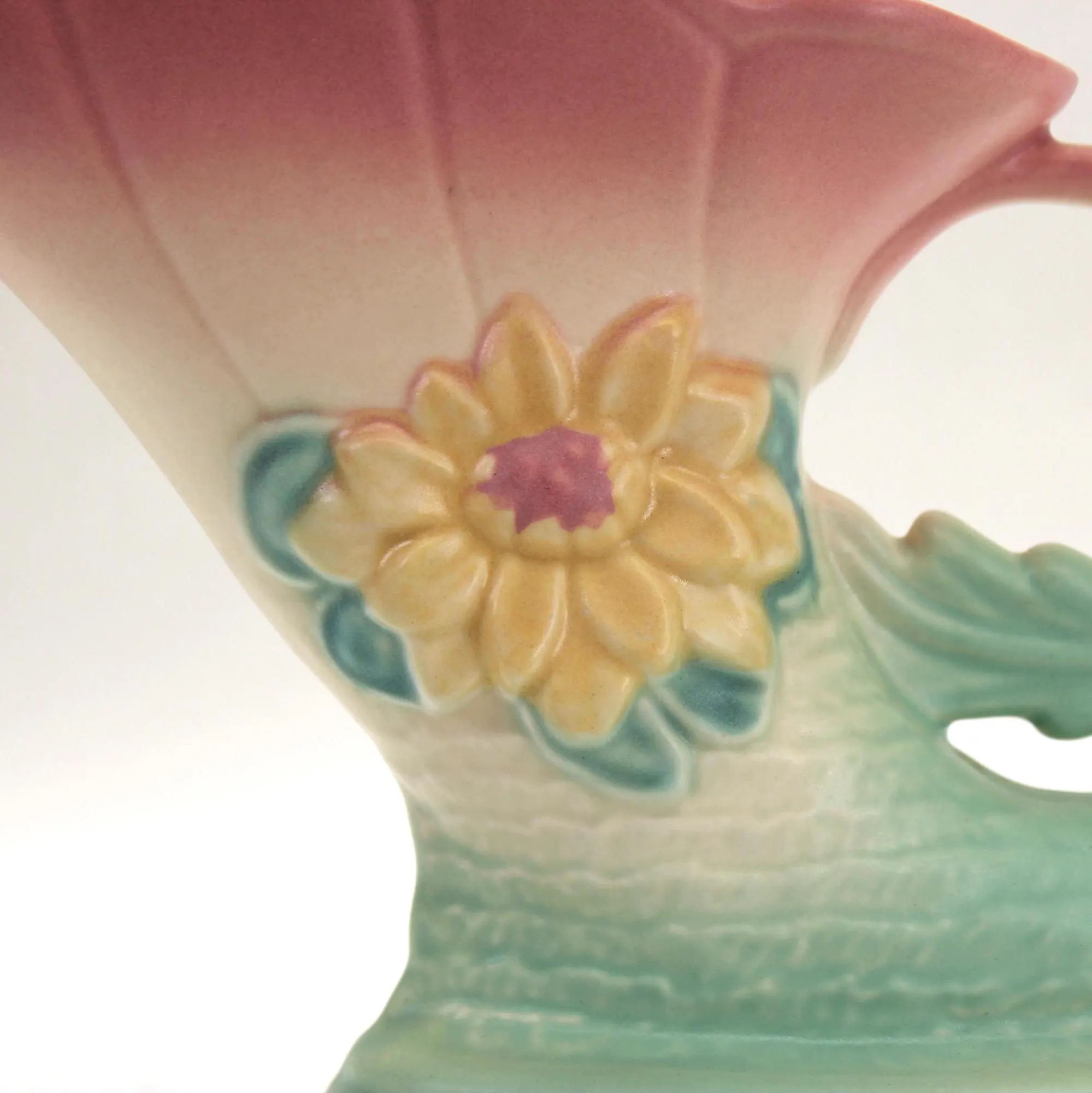 🌸 Elegant Water Lily cornucopia vase by Hull Art Pottery, featuring graceful curves and raised water lily motifs on both sides. The soft pink glaze blends into fresh green at the base, creating a naturalistic garden look that’s instantly inviting.