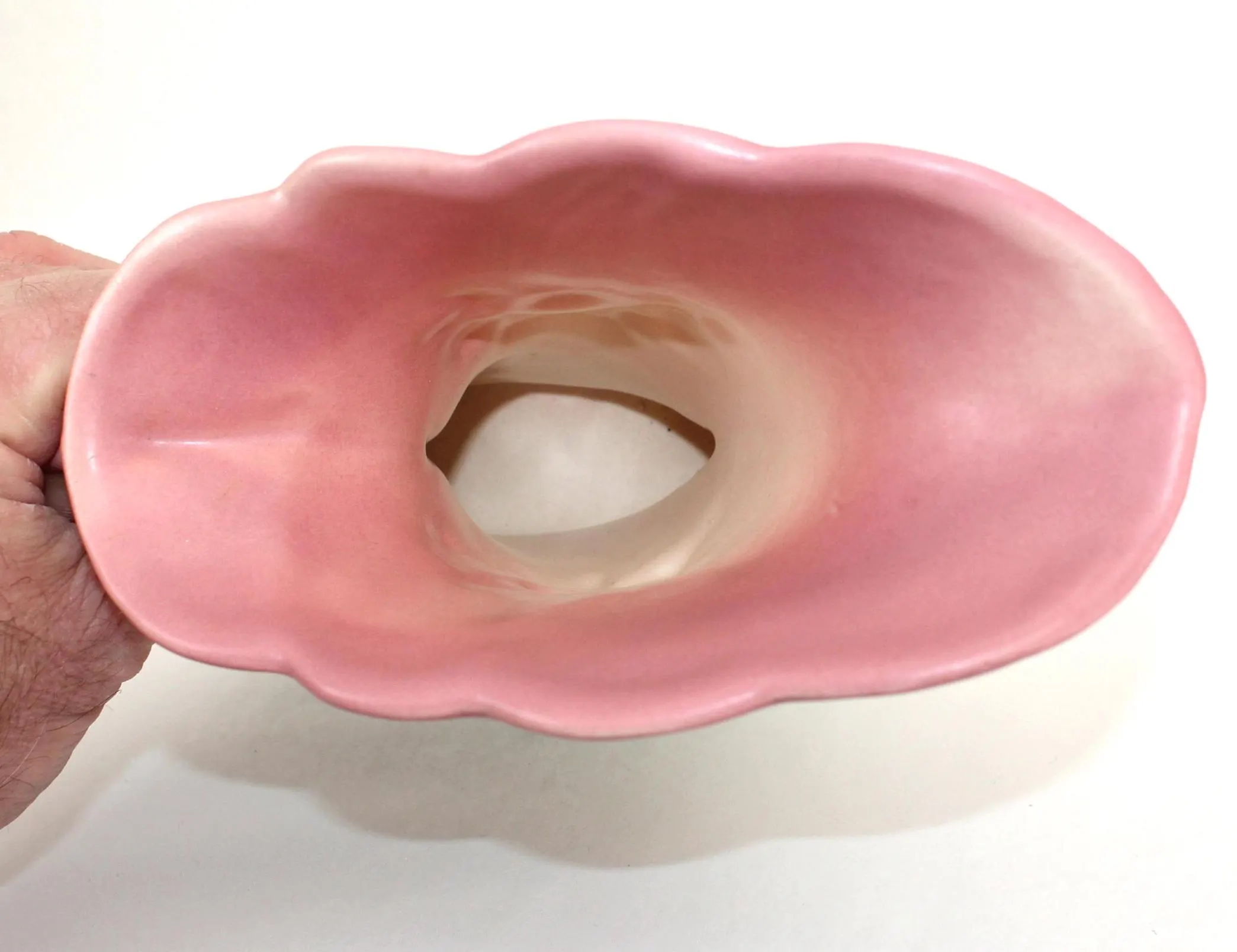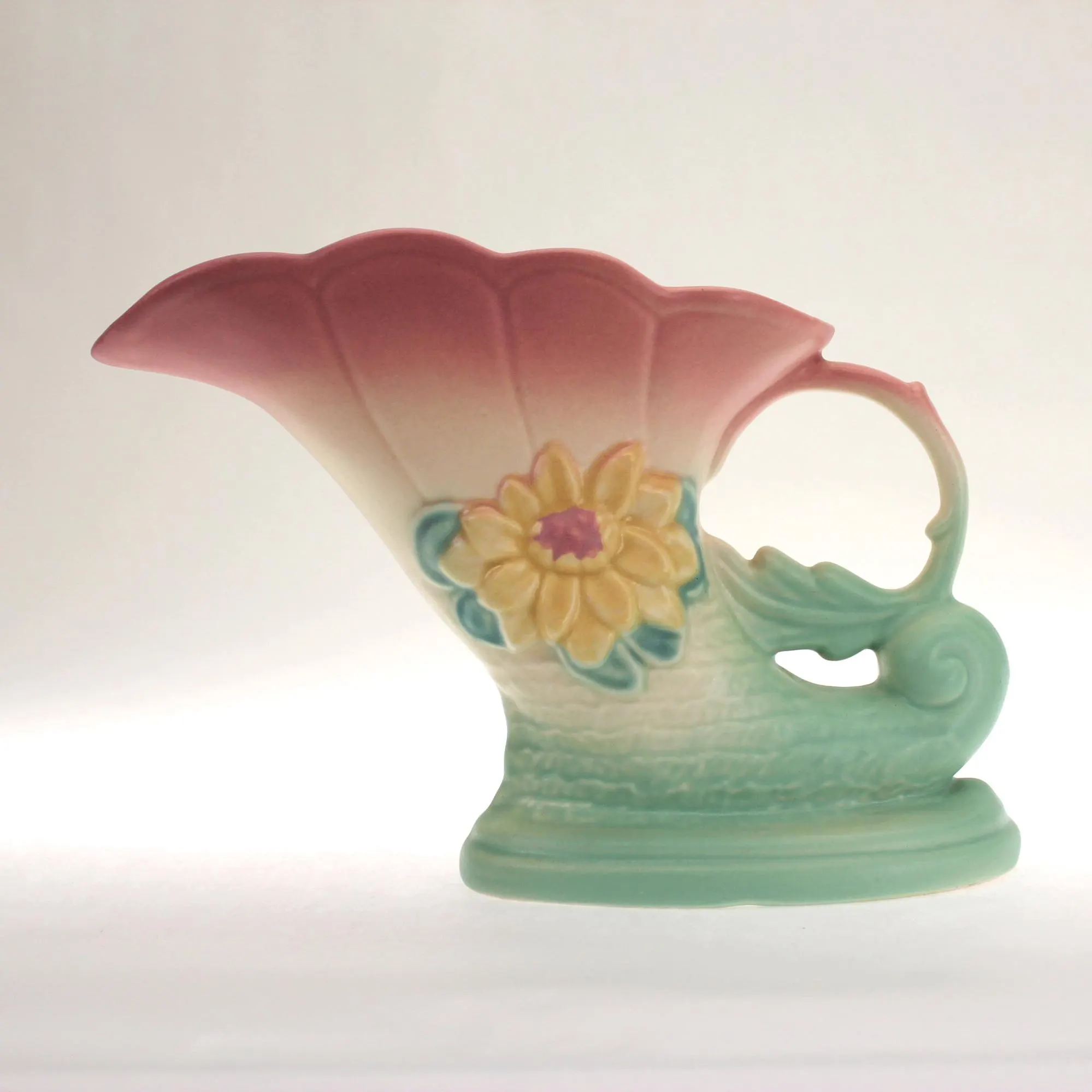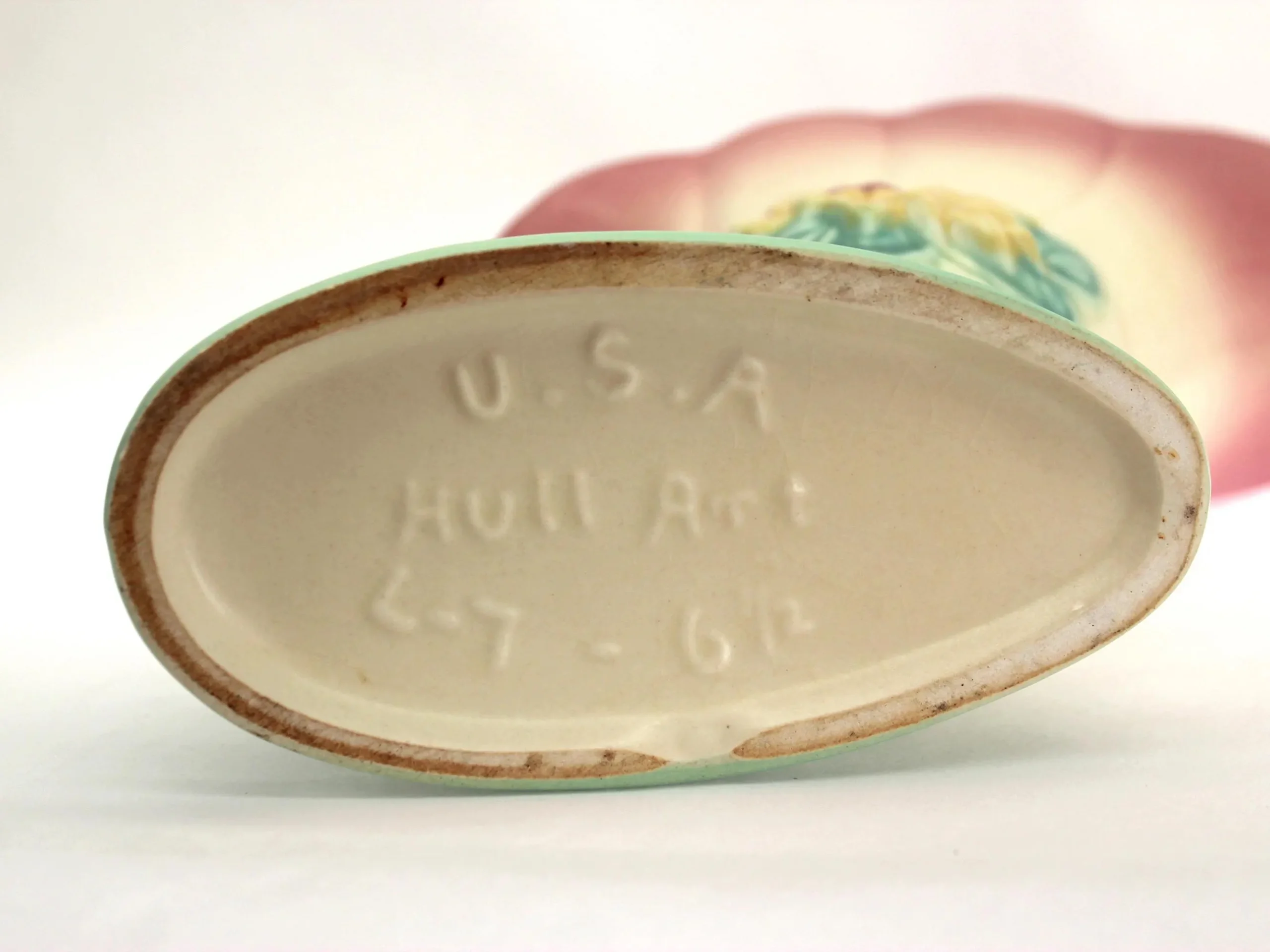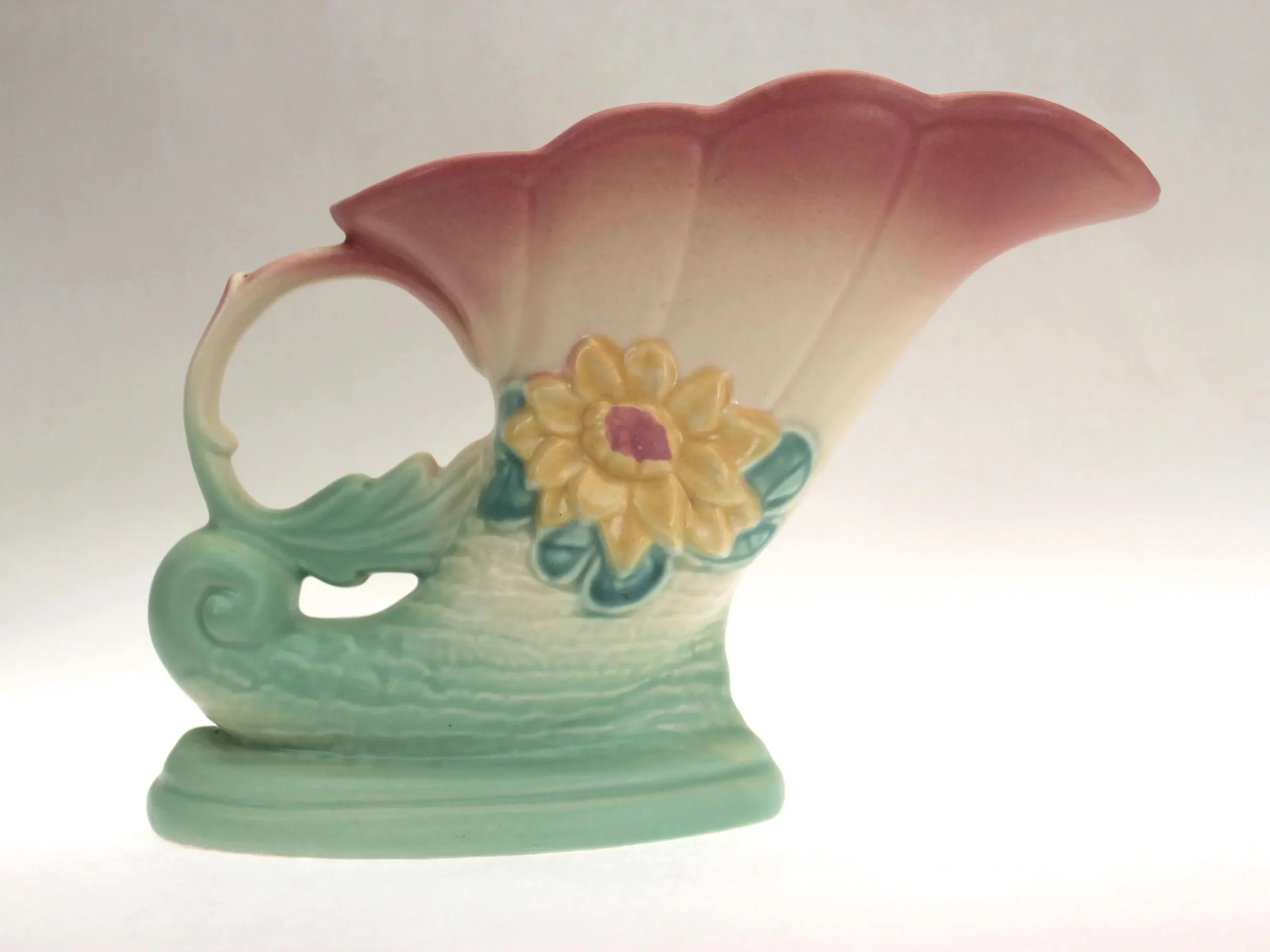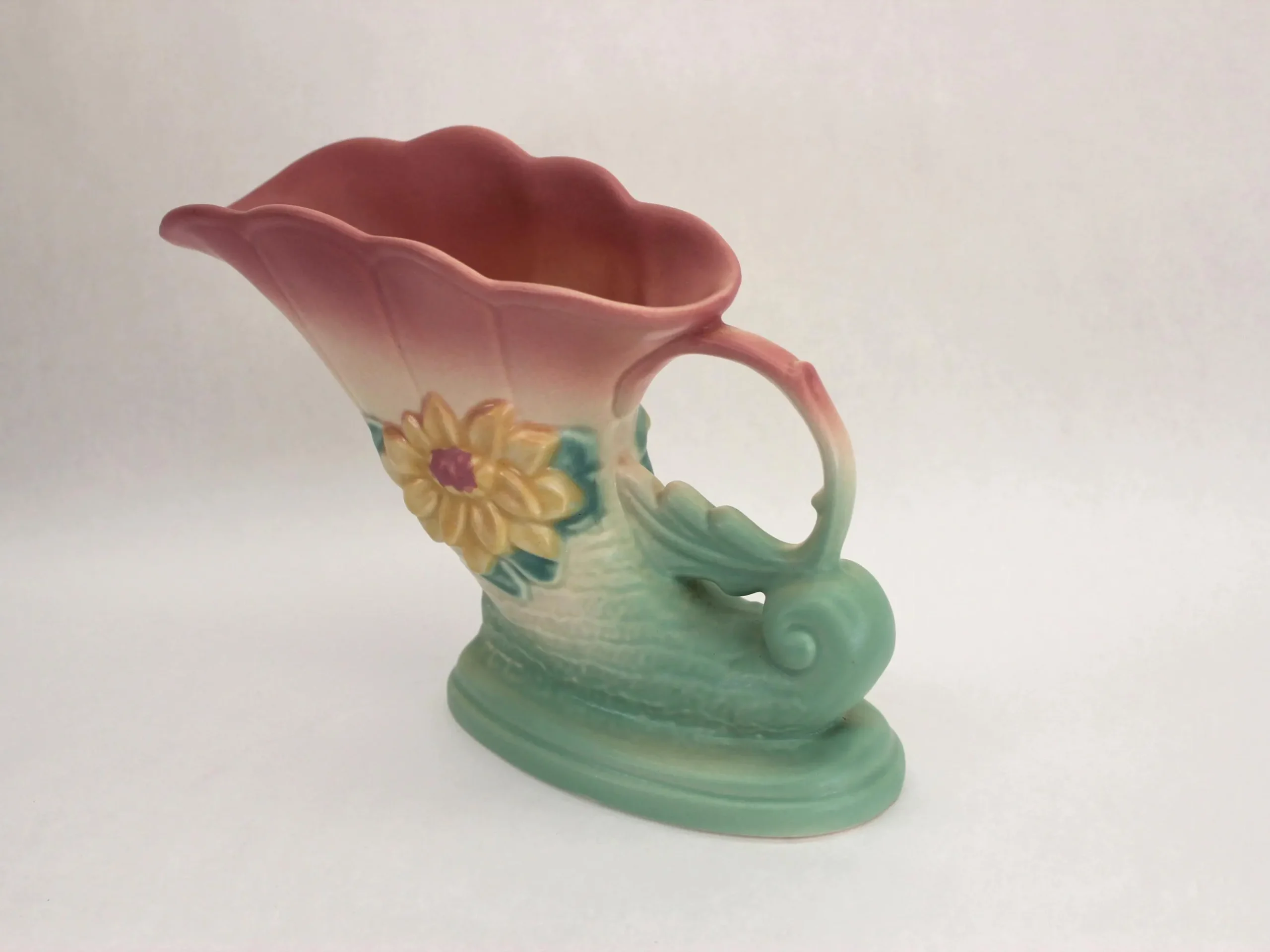 🌸 Elegant Water Lily cornucopia vase by Hull Art Pottery, featuring graceful curves and raised water lily motifs on both sides. The soft pink glaze blends into fresh green at the base, creating a naturalistic garden look that’s instantly inviting.
