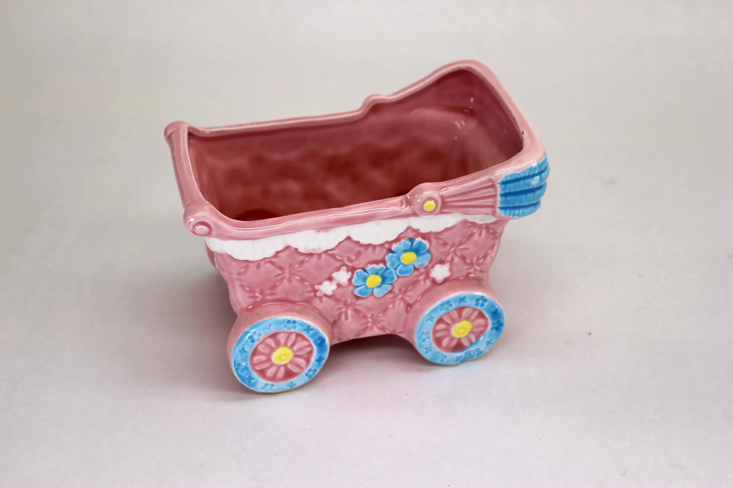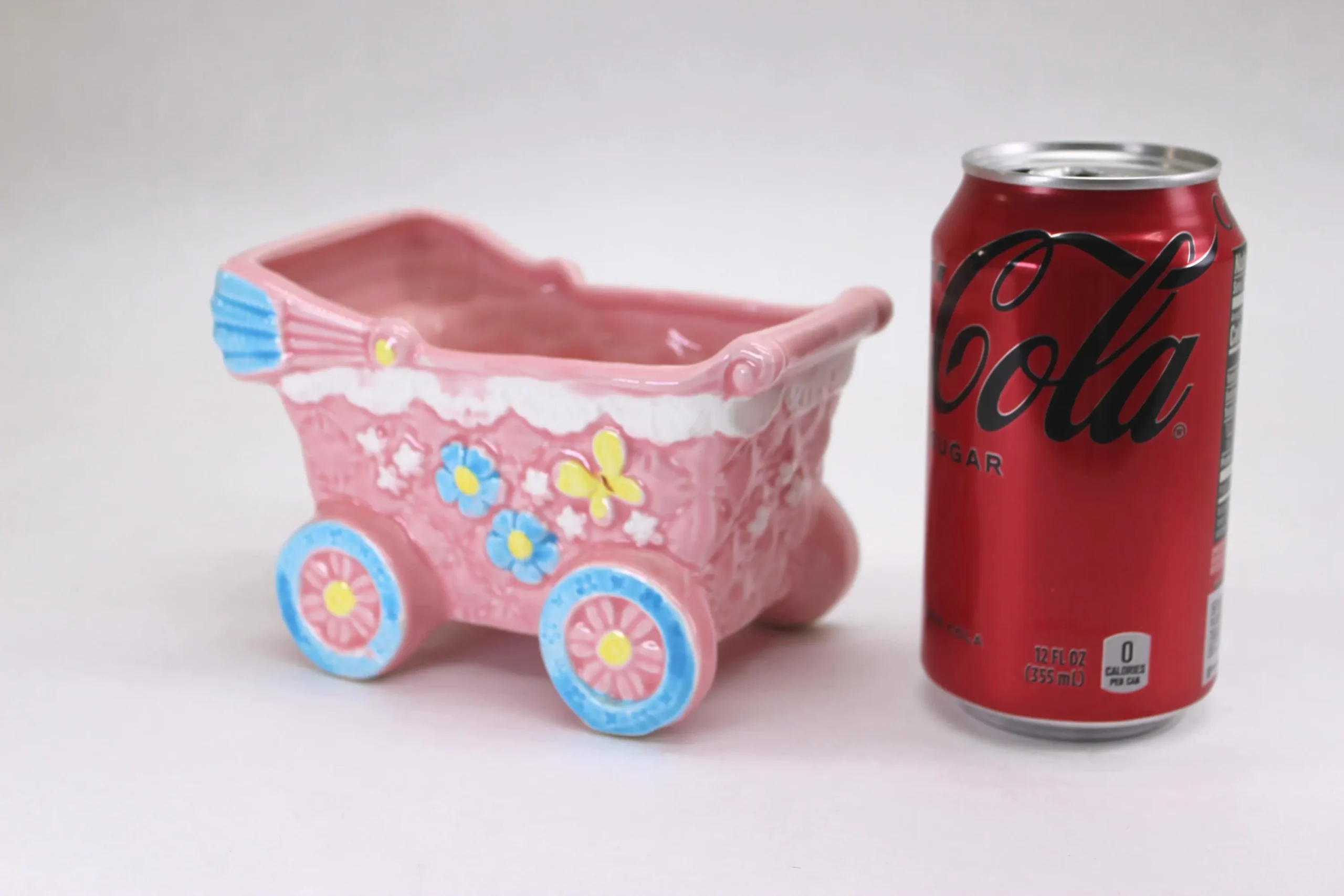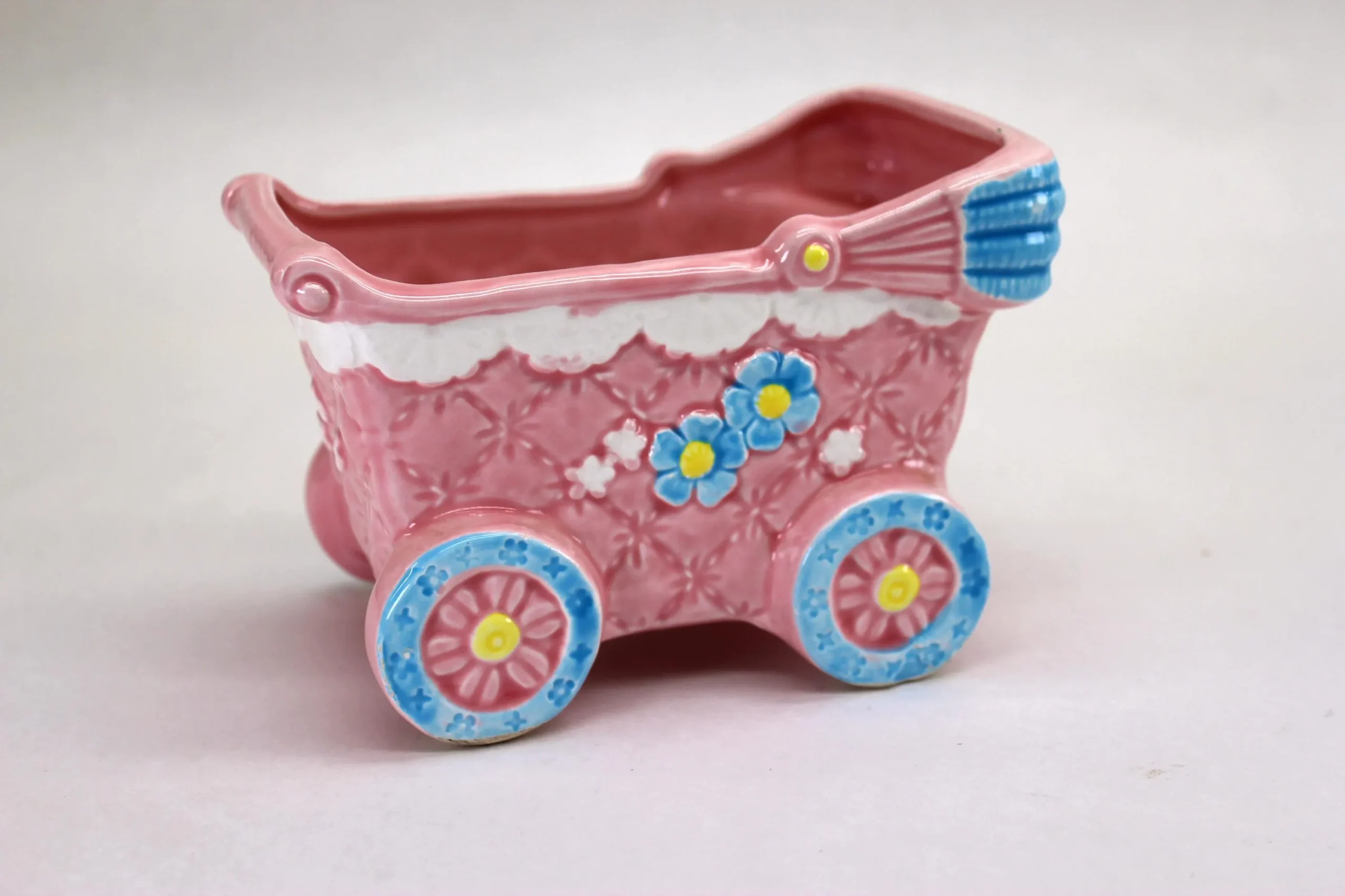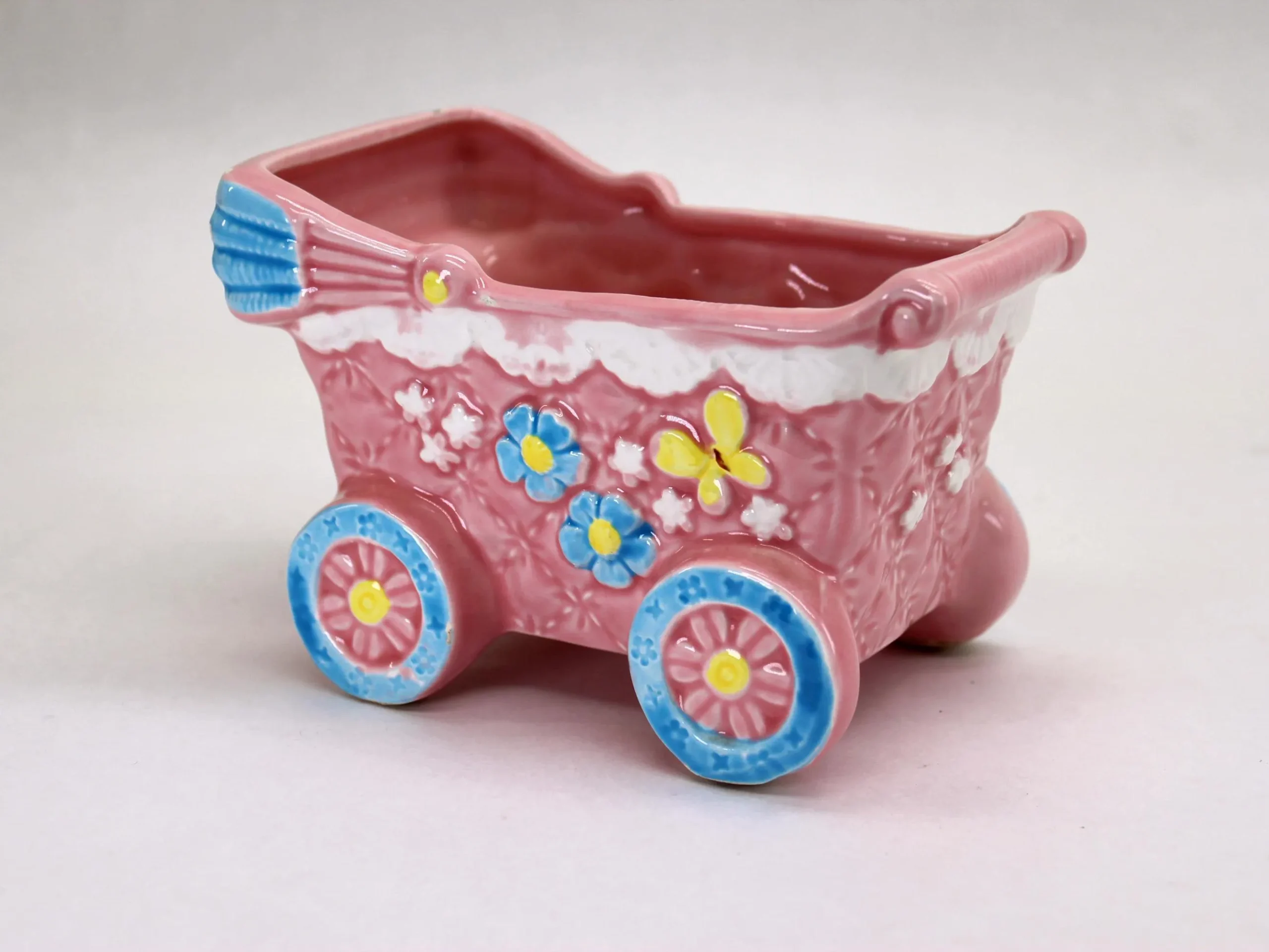 This sweet pink pram has all the markings of a groovy 1960’s carriage, from the ubiquitous 1960’s butterfly to the day-glo daisies! It was imported from Japan by Lefton, and has rich colors and beautiful details. It’s about 4″ tall and 5.5″ long, and would be a sweet welcome for a modern baby!