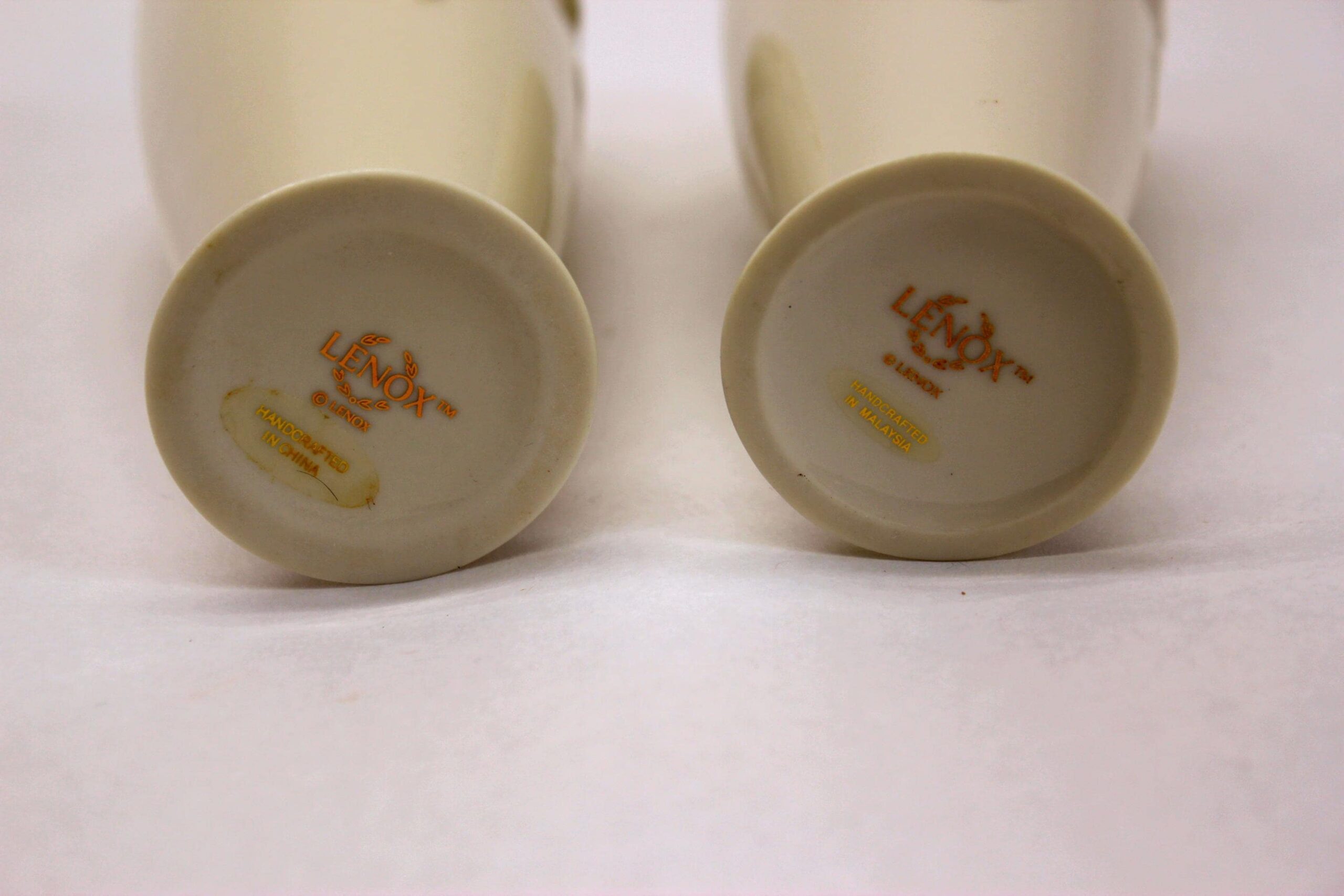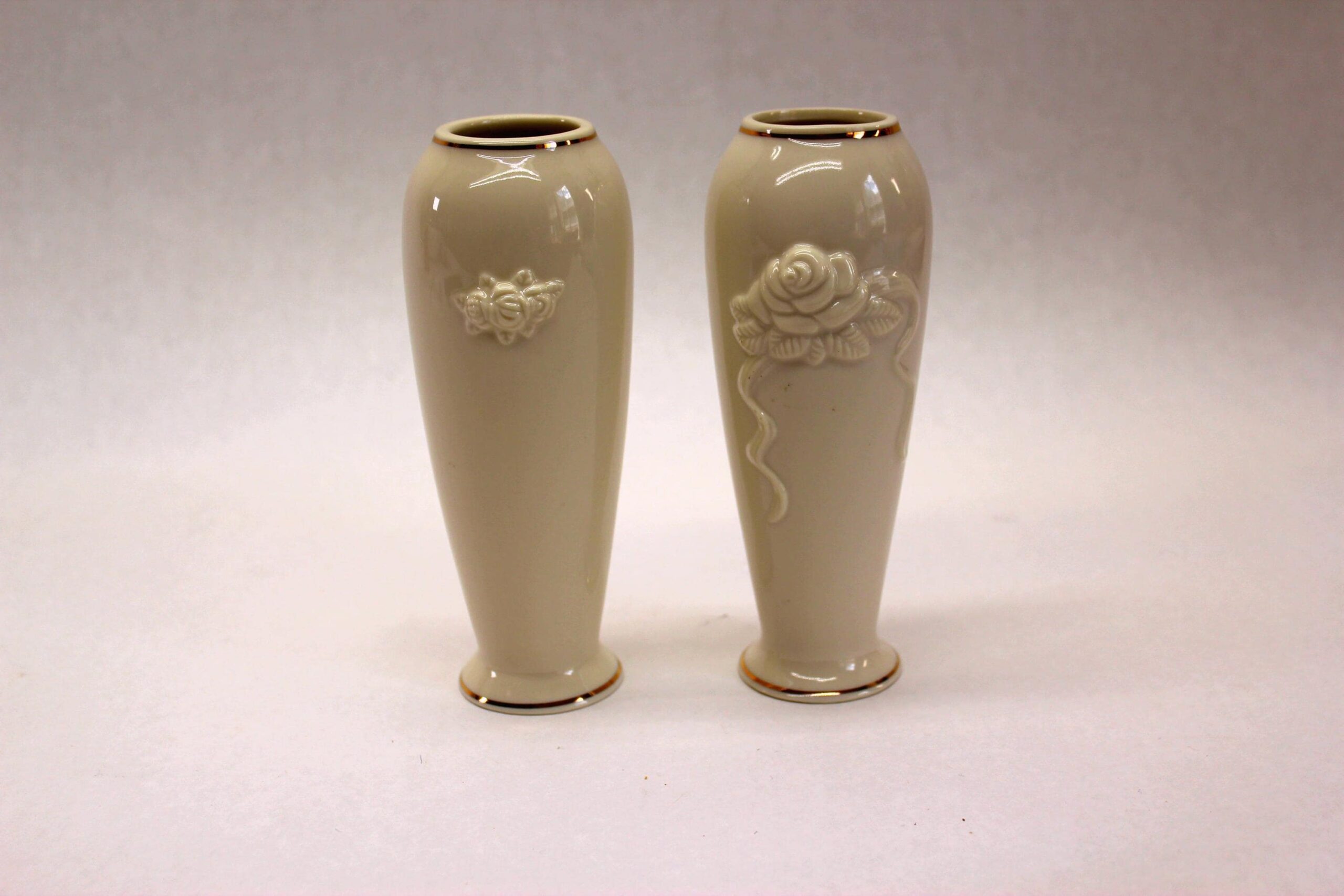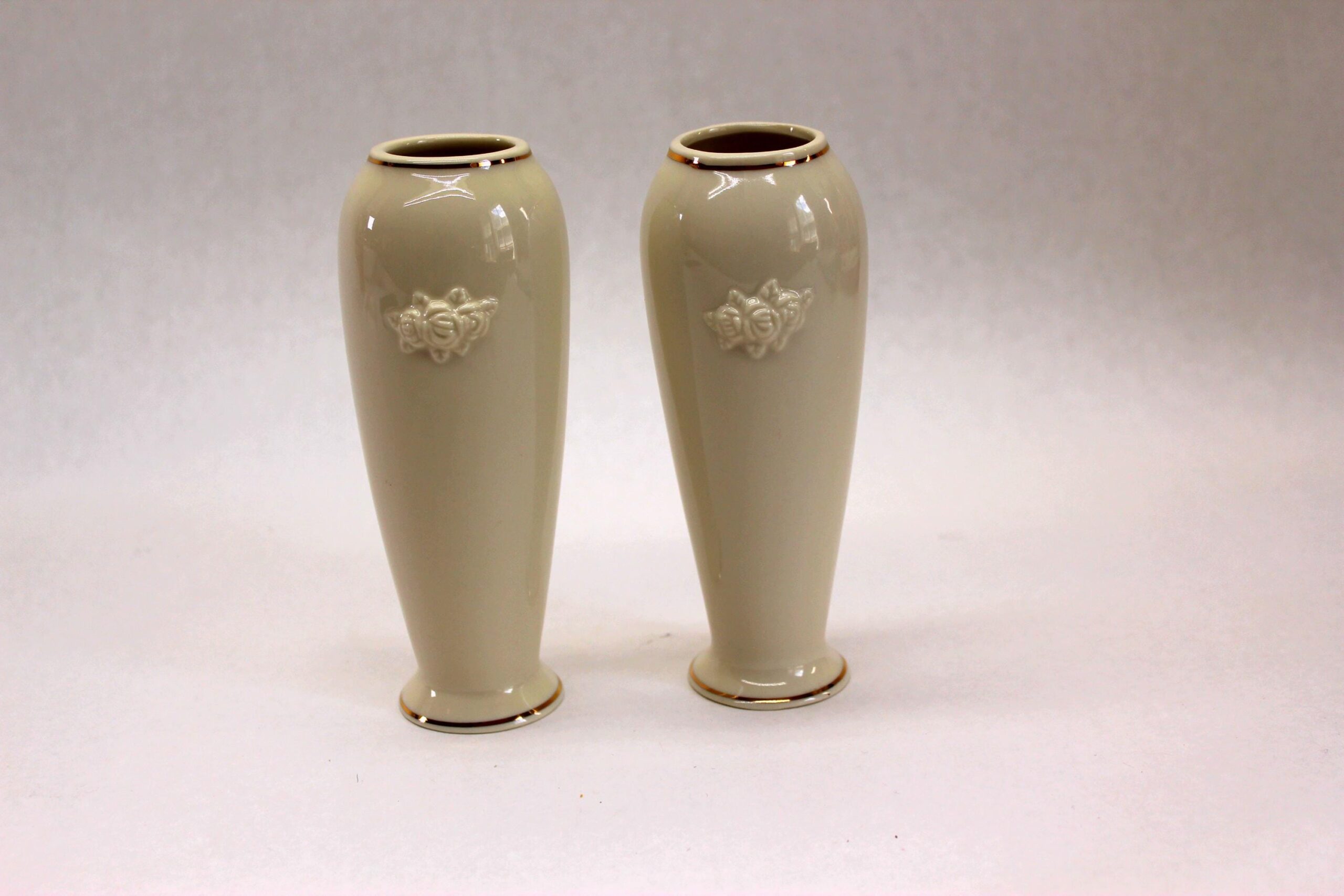 These Lenox bud vases were a ubiquitous bridal gift in the 1980's and 1990's, when department stores had huge china departments with wedding registries and samples of every china pattern known to man! They are a dainty 6" tall. This bride may have gotten 2 of the same vase- but I'm selling them as a pair because I think it gives them more stature! Ships free in the US.