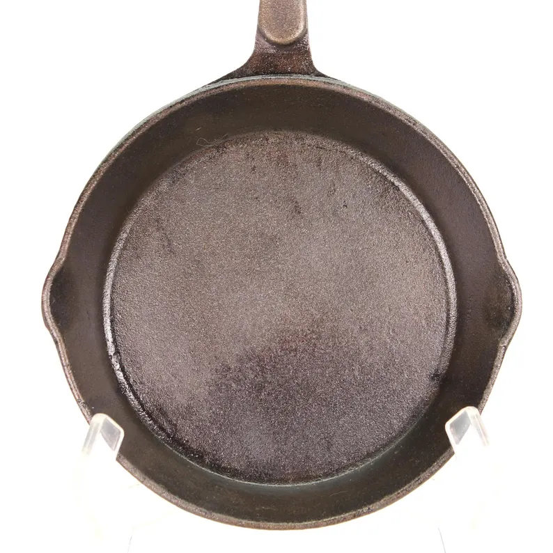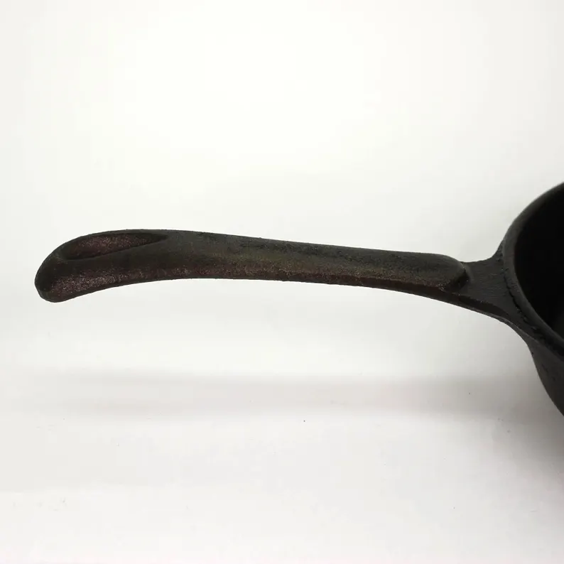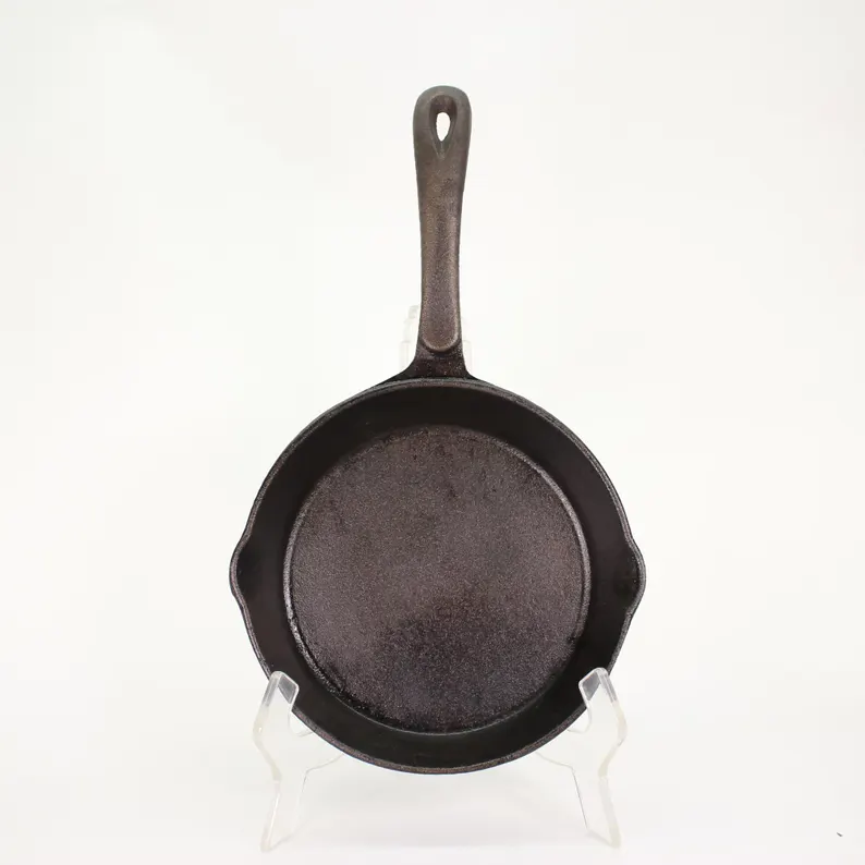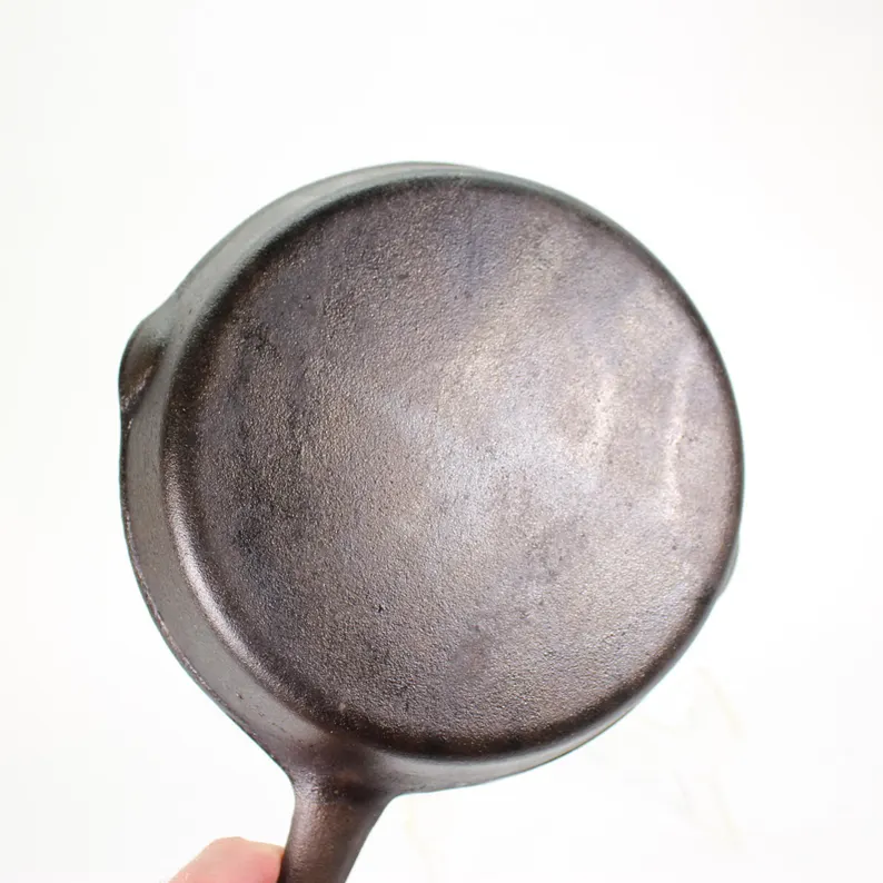 This unmarked Lodge skillet was made in the USA between the 1980s and early 2000s. Lodge produced many pieces without their logo during this period, often for hardware and department store sales. This pan features the classic Lodge teardrop handle, double pour spouts, and a durable pebbled interior.