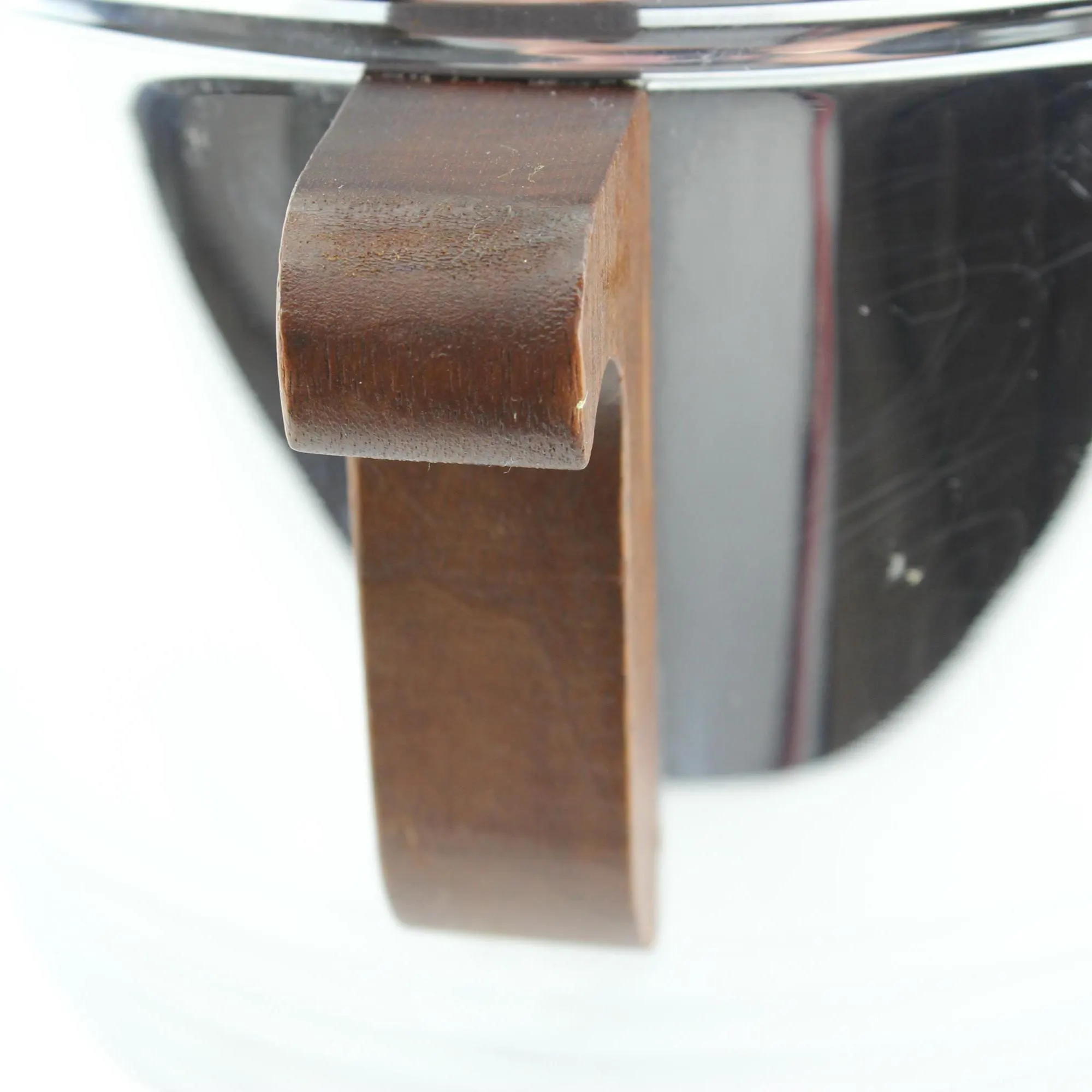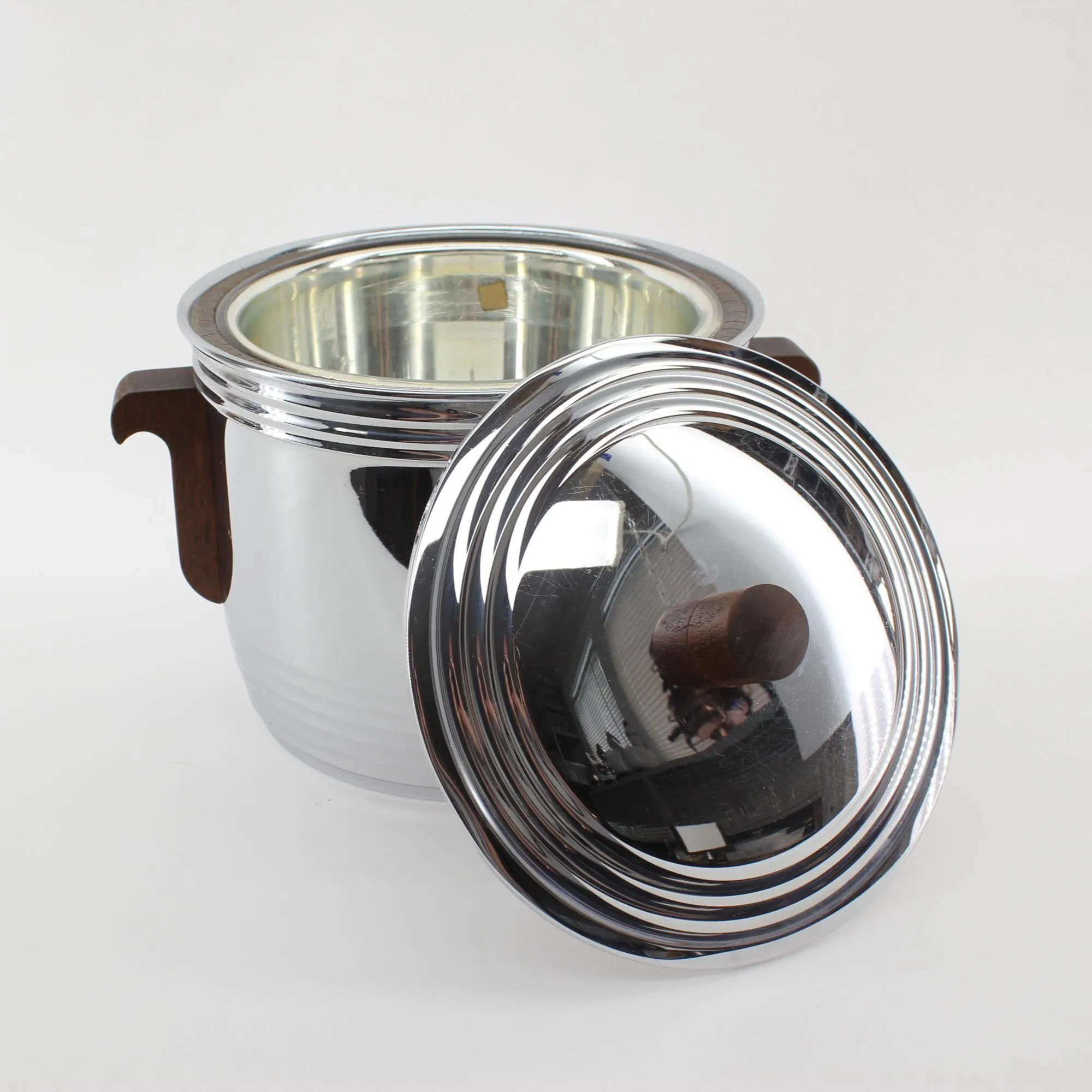 🍸Step into your swankiest mid-century dreams with this dazzling chrome ice bucket by Manning-Bowman, crafted in Meriden, Connecticut during the golden age of American entertaining. With its mirrored glass interior, natural cork insulation, and sculptural walnut handles, this piece was made for serious cocktail culture—and it shows.