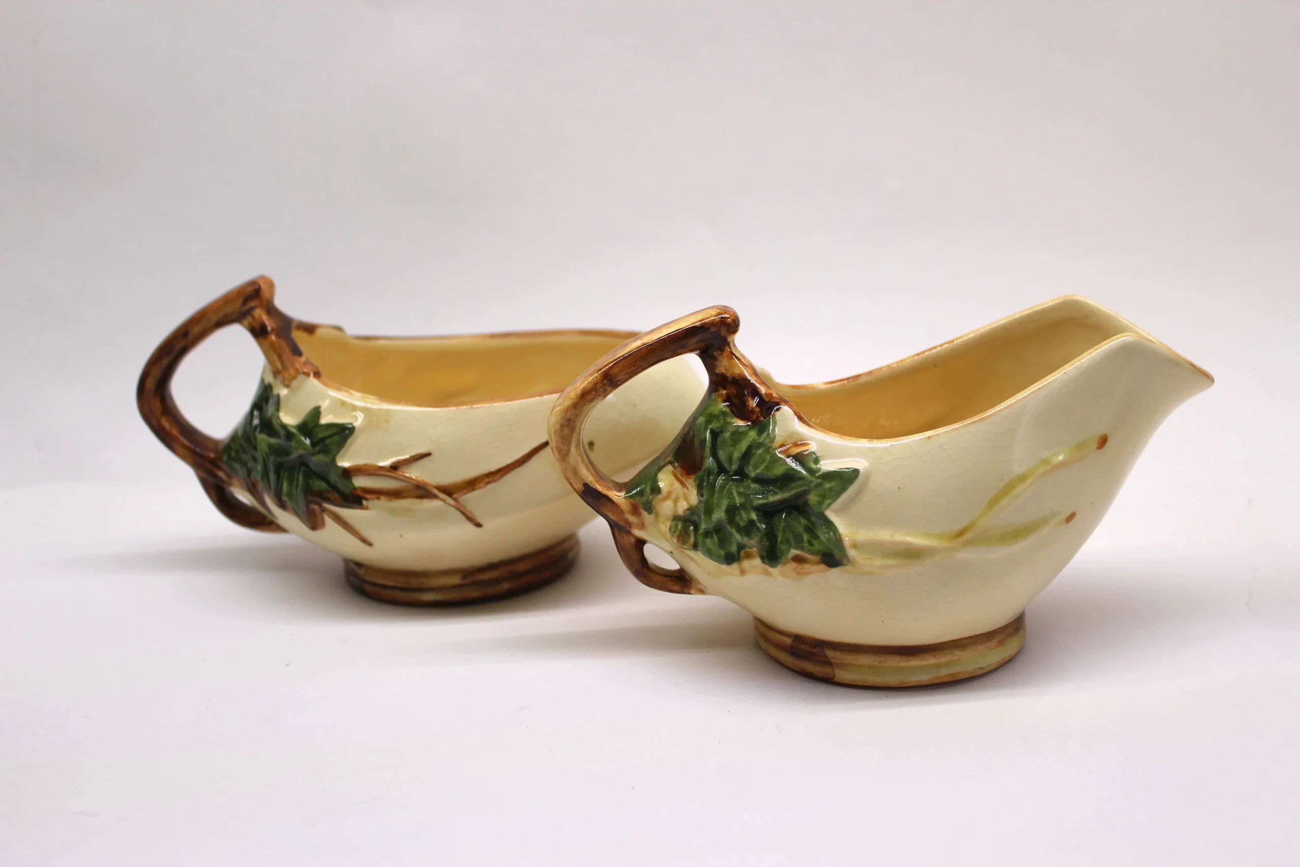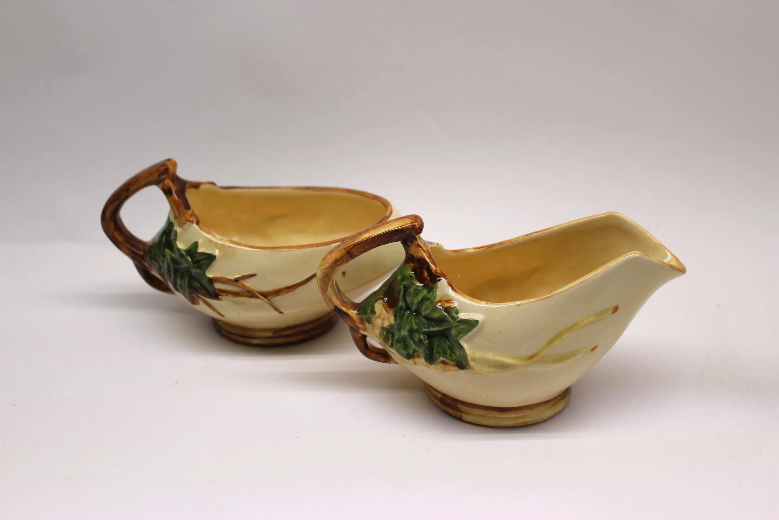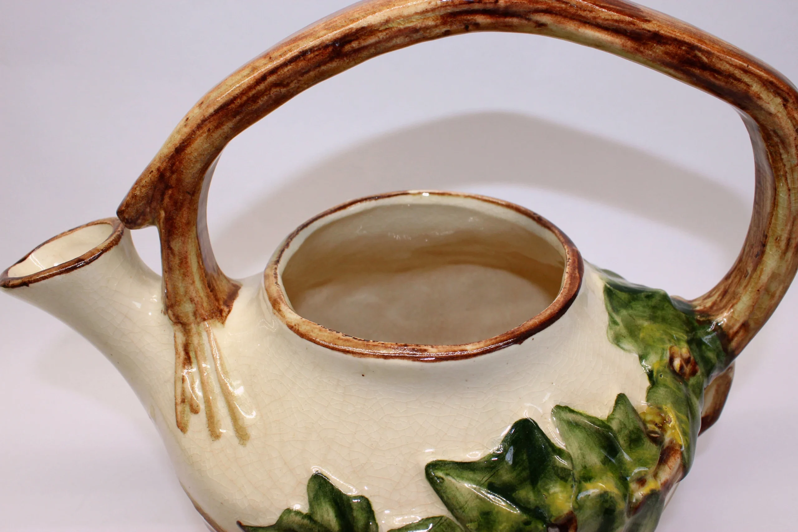 This beautiful McCoy set sat proudly on the top shelf of Aunt Nen’s sideboard at her house, then Momma’s house, and then my house…. and probably the farm in New Iberia before that! It includes the teapot with lid, the open sugar bowl with handle, and the creamer. Other than allover crazing of the glaze which is common among vintage McCoy, the only other damage is a small chip in the handle of the creamer, which I’ve tried to show in the last photo. The color and detail of this set is amazing and it’s long been one of my favorite McCoy patterns! Pot is 8″ from handle to spout and the stands 10″ from base to the top of the handle.