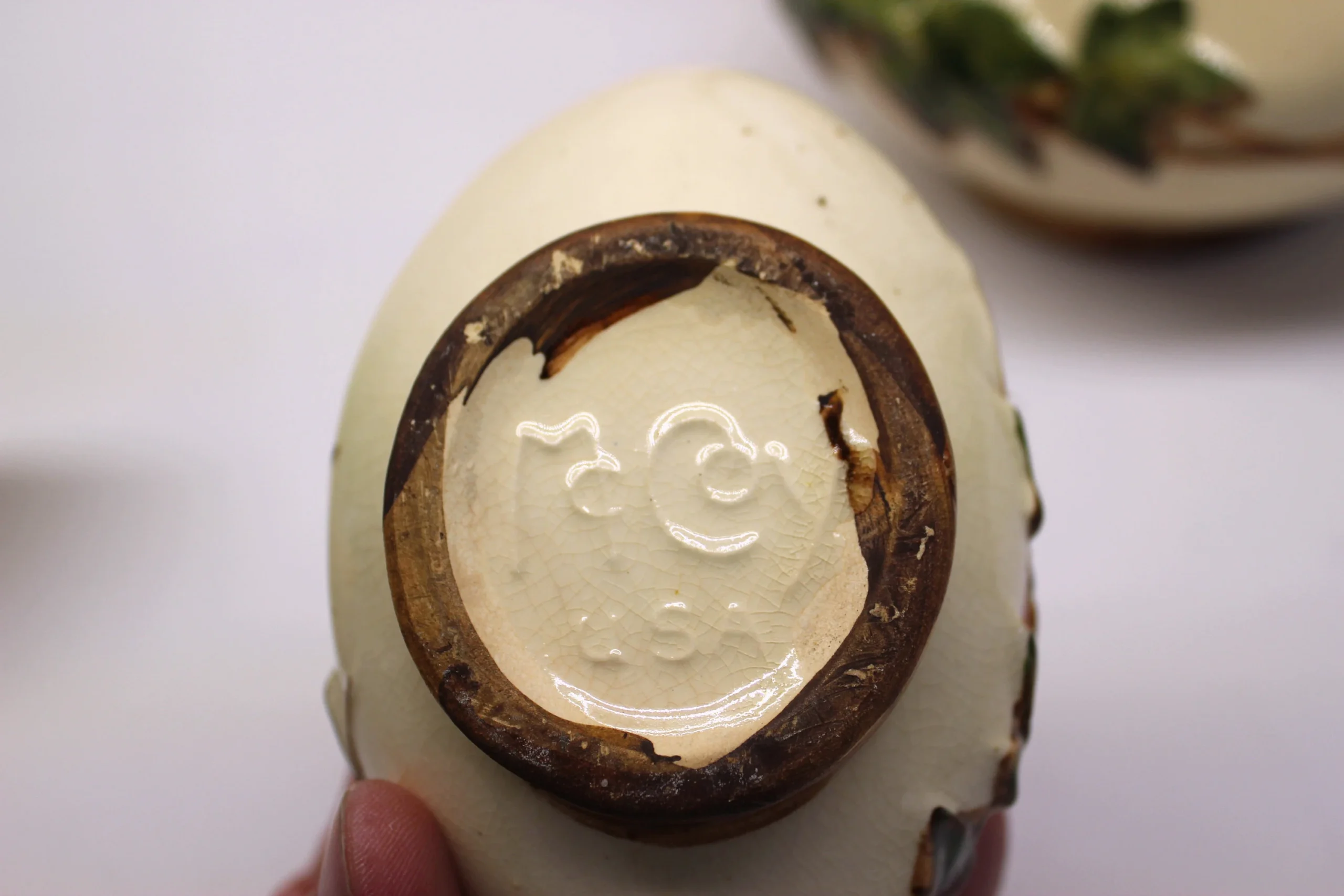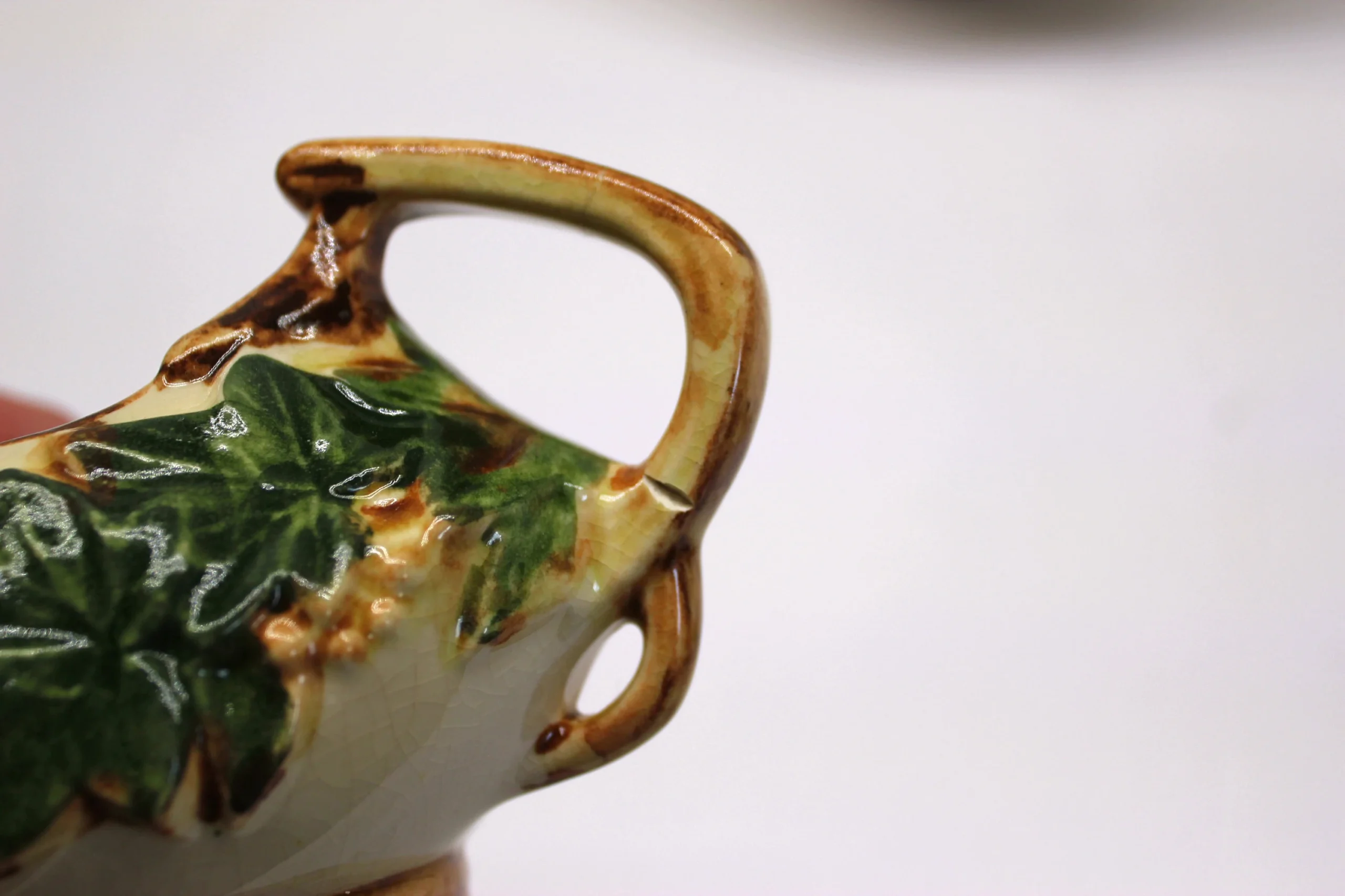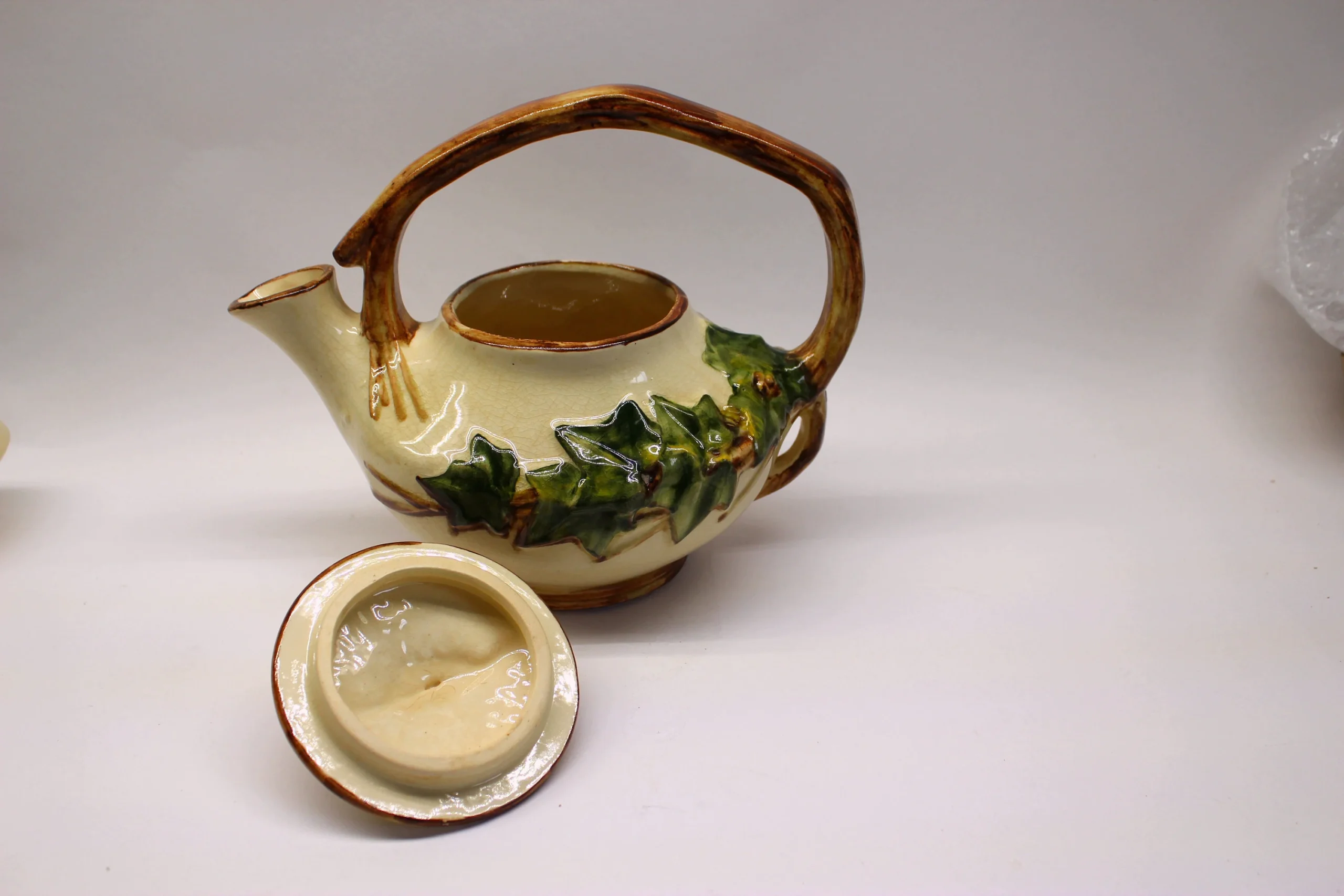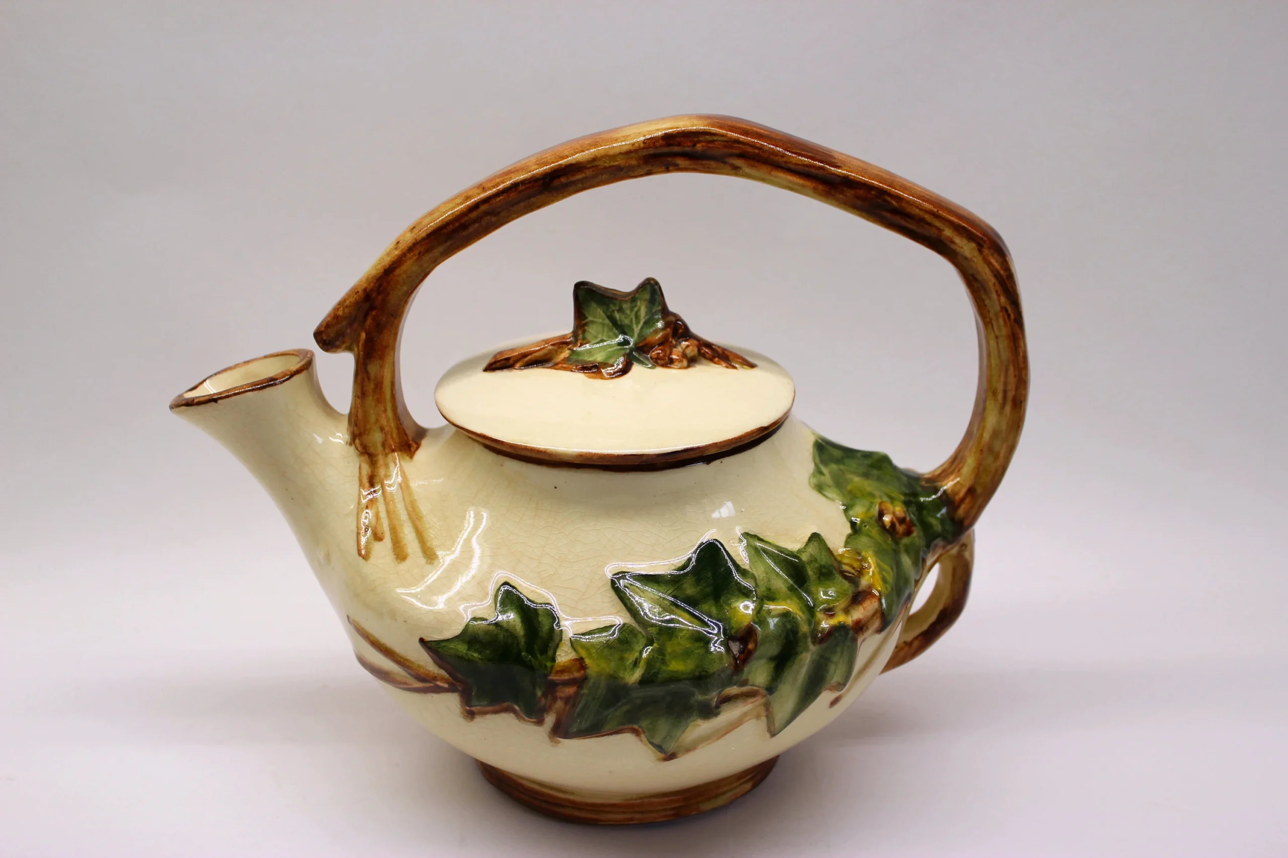 This beautiful McCoy set sat proudly on the top shelf of Aunt Nen’s sideboard at her house, then Momma’s house, and then my house…. and probably the farm in New Iberia before that! It includes the teapot with lid, the open sugar bowl with handle, and the creamer. Other than allover crazing of the glaze which is common among vintage McCoy, the only other damage is a small chip in the handle of the creamer, which I’ve tried to show in the last photo. The color and detail of this set is amazing and it’s long been one of my favorite McCoy patterns! Pot is 8″ from handle to spout and the stands 10″ from base to the top of the handle.