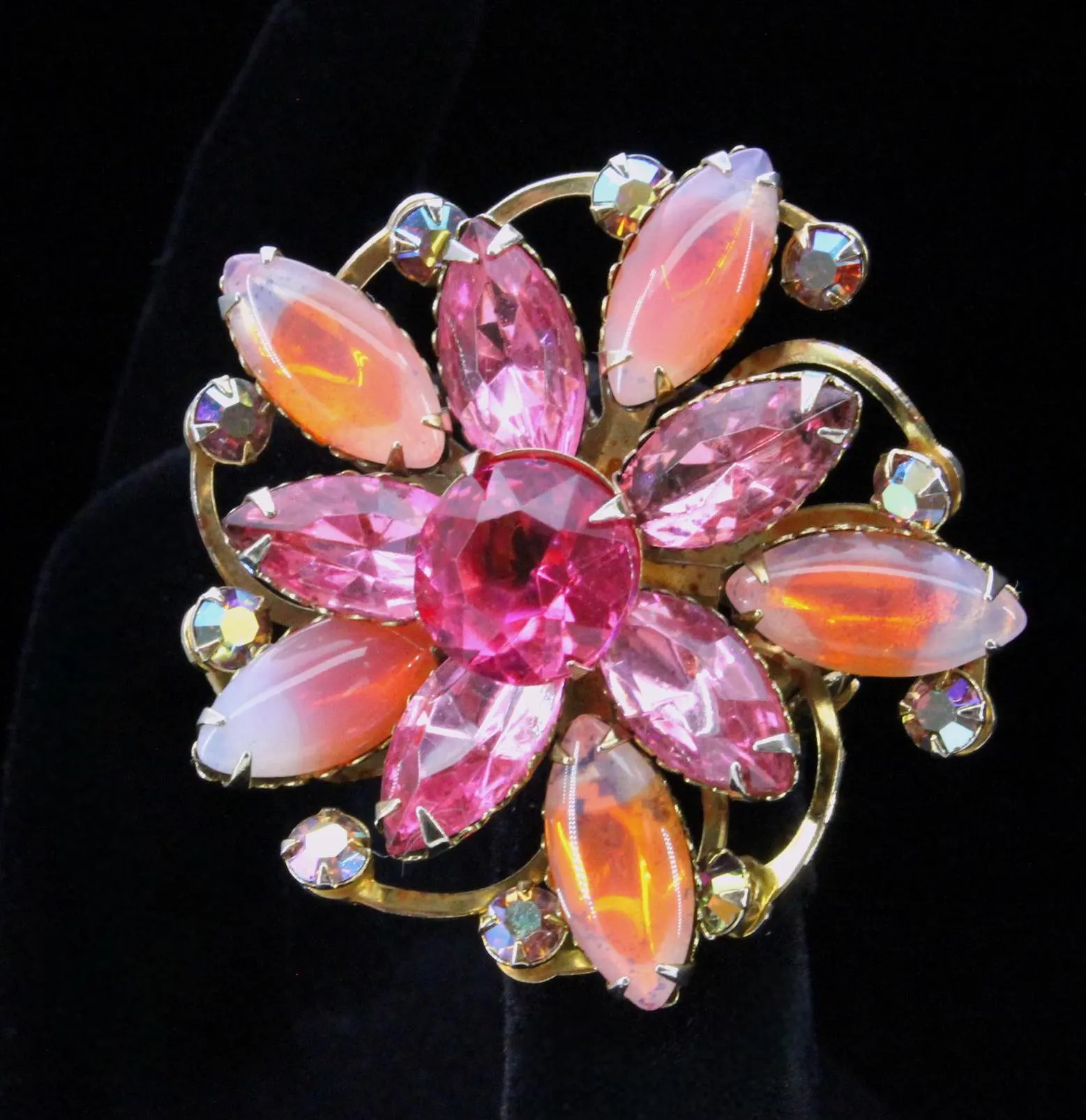 2. Pink and Peach Rhinestone Brooch. 1-3/4″ diameter.