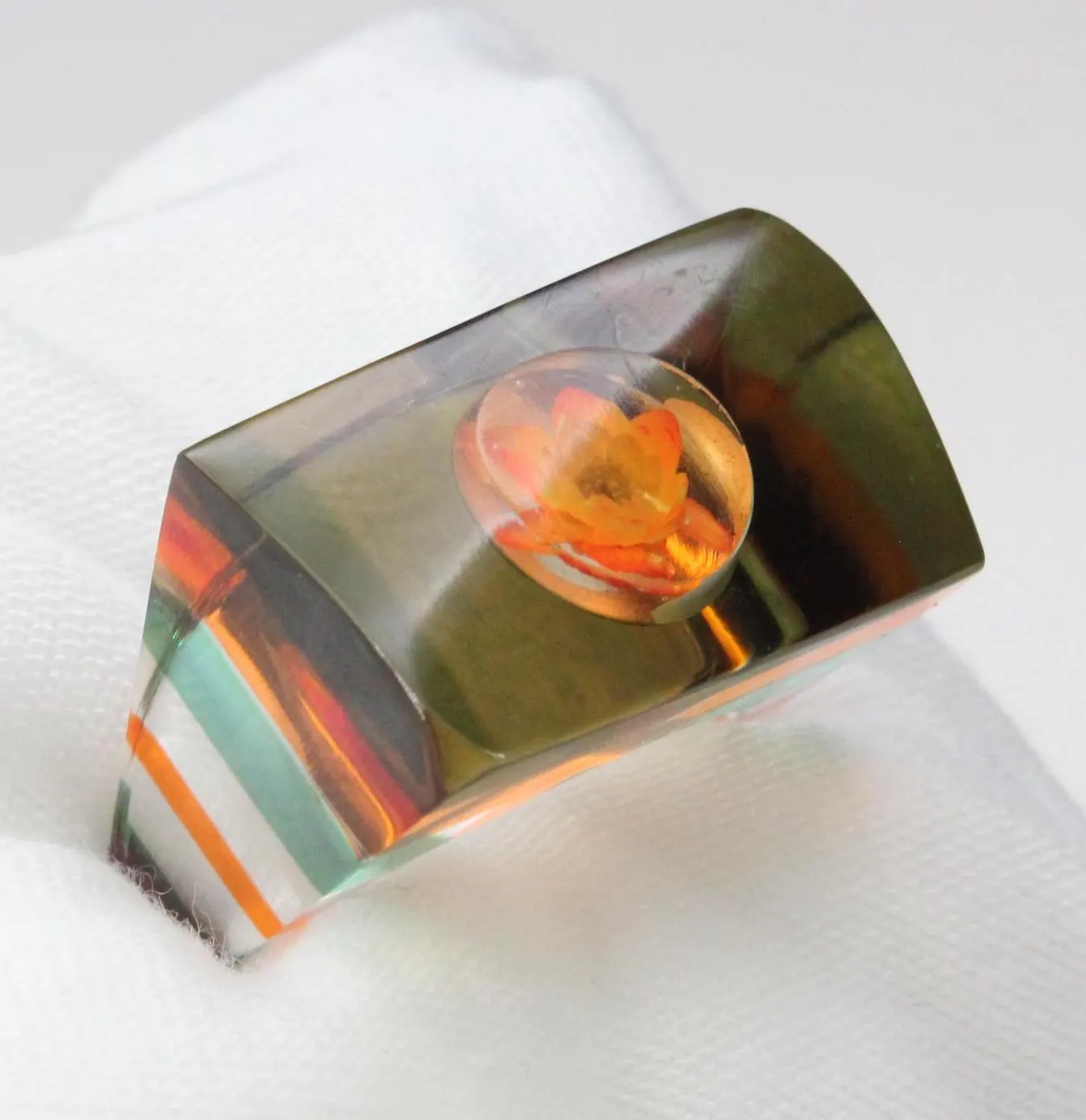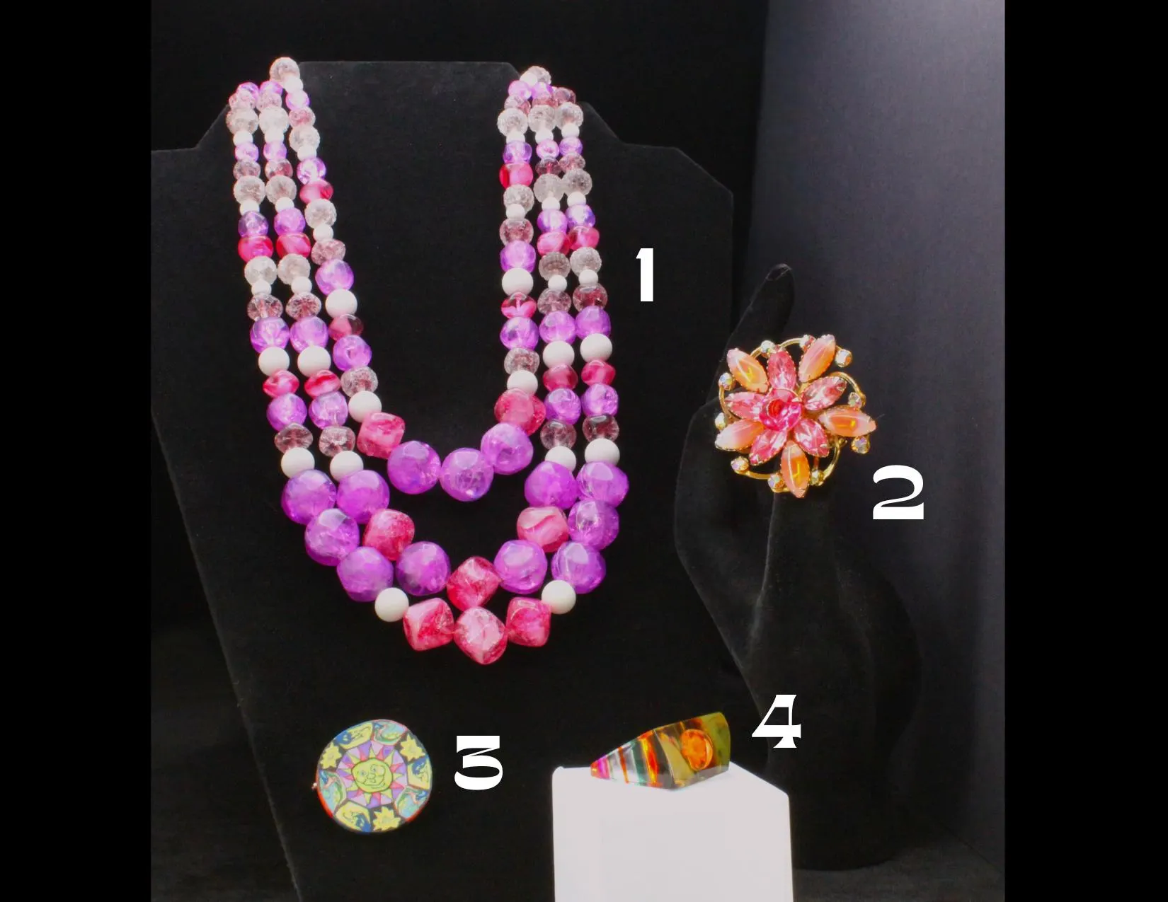 Here’s a colorful assortment of vintage styles that will bring a pop of style to any wardrobe. From the Hattie Carnegie-styled beaded necklace (the clasp is missing the cabochon) to the gorgeous lucite ring, there’s color, fun, and a bit of whimsy for everyone!