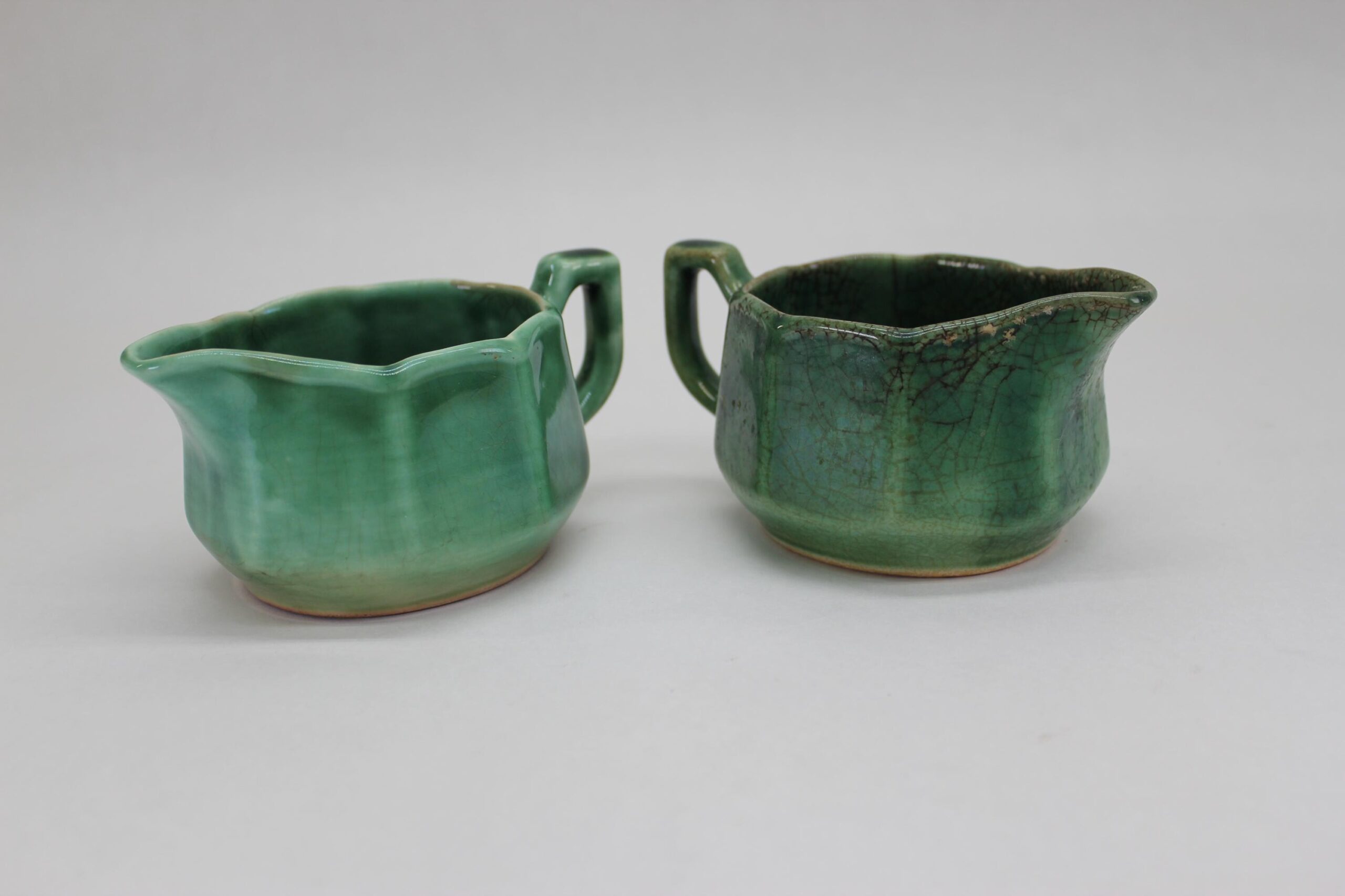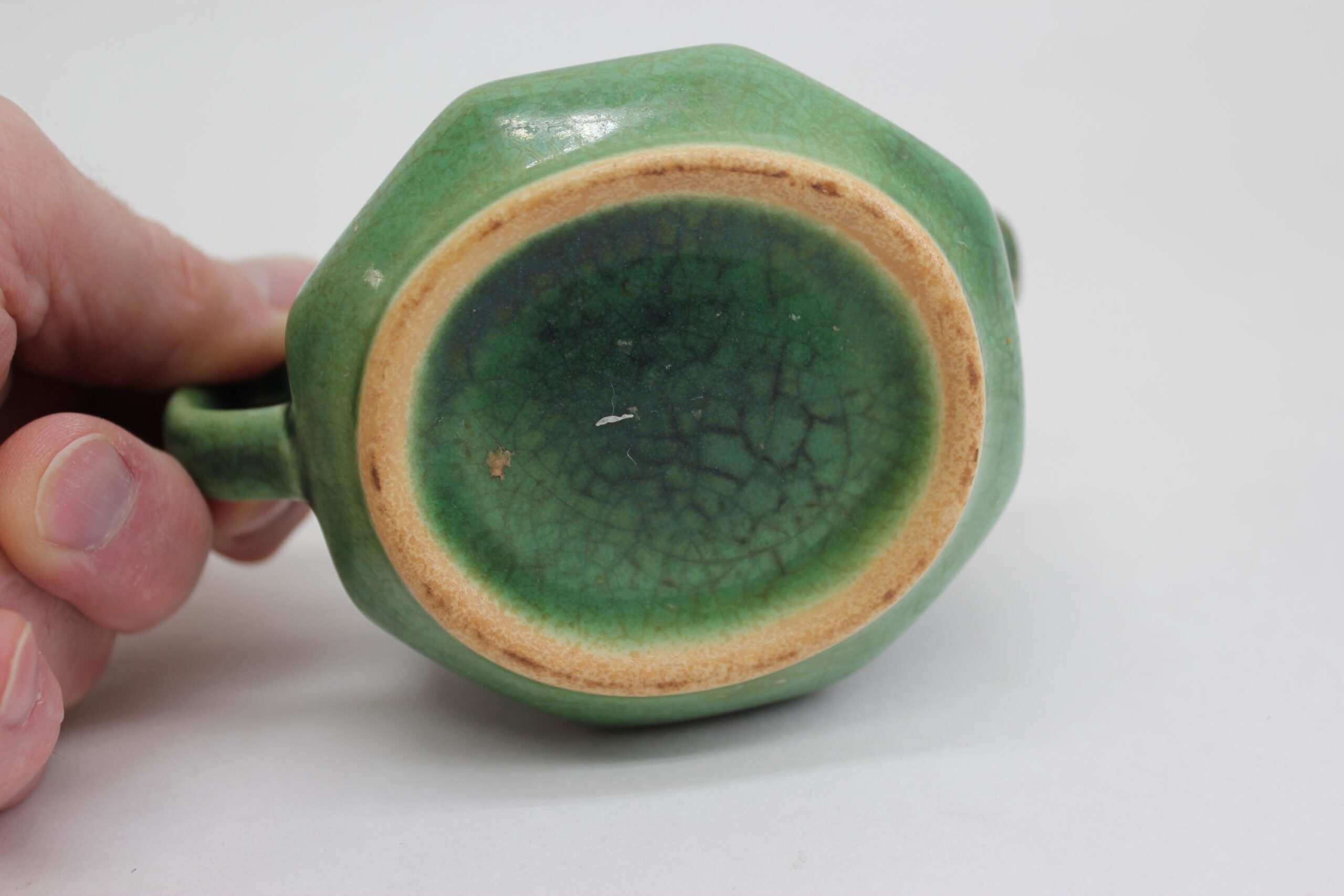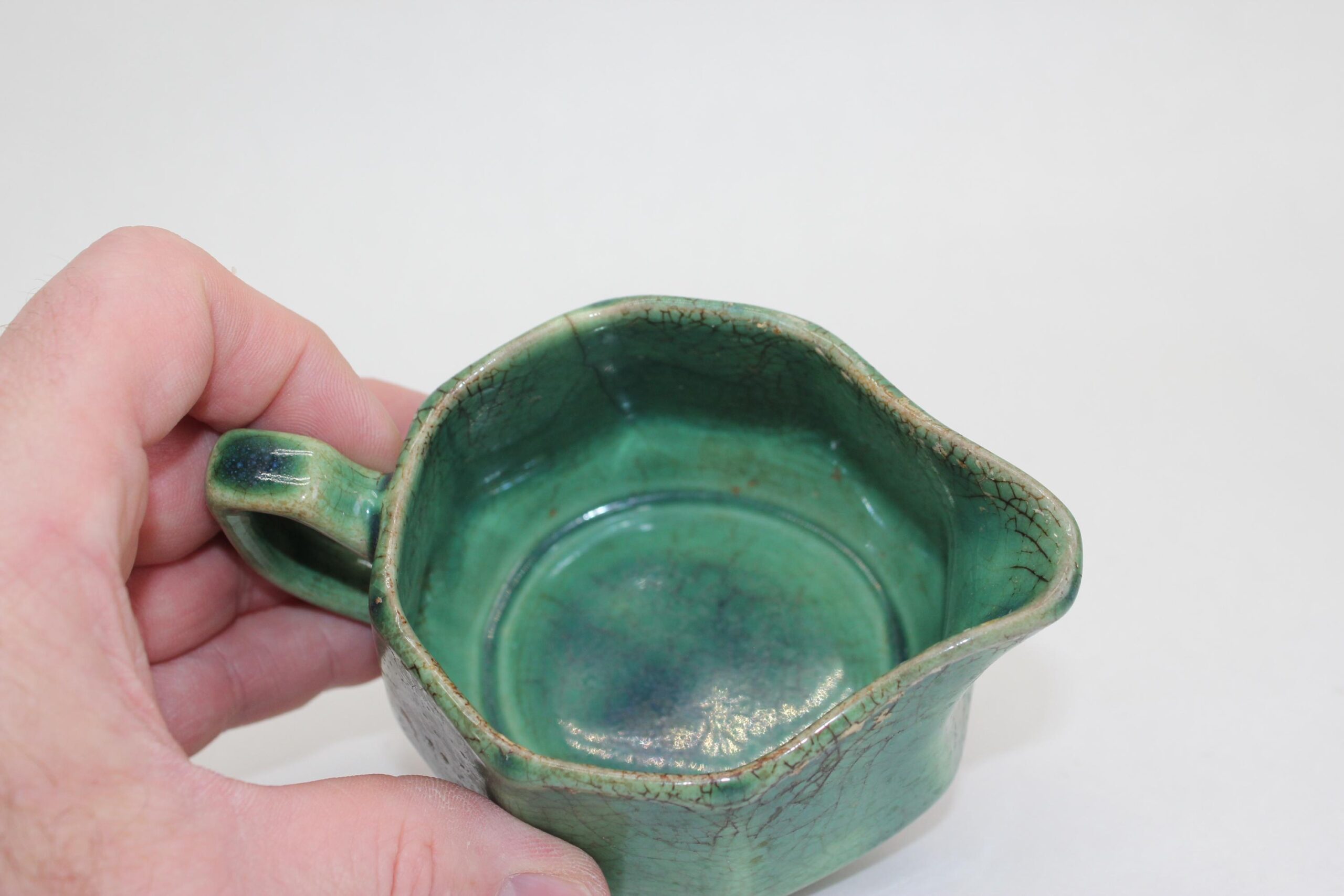 This pair of creamers was made by the Mt Clemens pottery in Michigan, probably sometime in the 1930’s. They represent the best of times, and the worst of times- to borrow a misquote! One is in good condition, with slight crazing as to be expected of glazed pottery of the era. The other was has seen a rougher life, with significant crazing, especially around the spout. They are about 2.25″ tall, and measure 5″ from spout to handle. Sold as a pair only.
