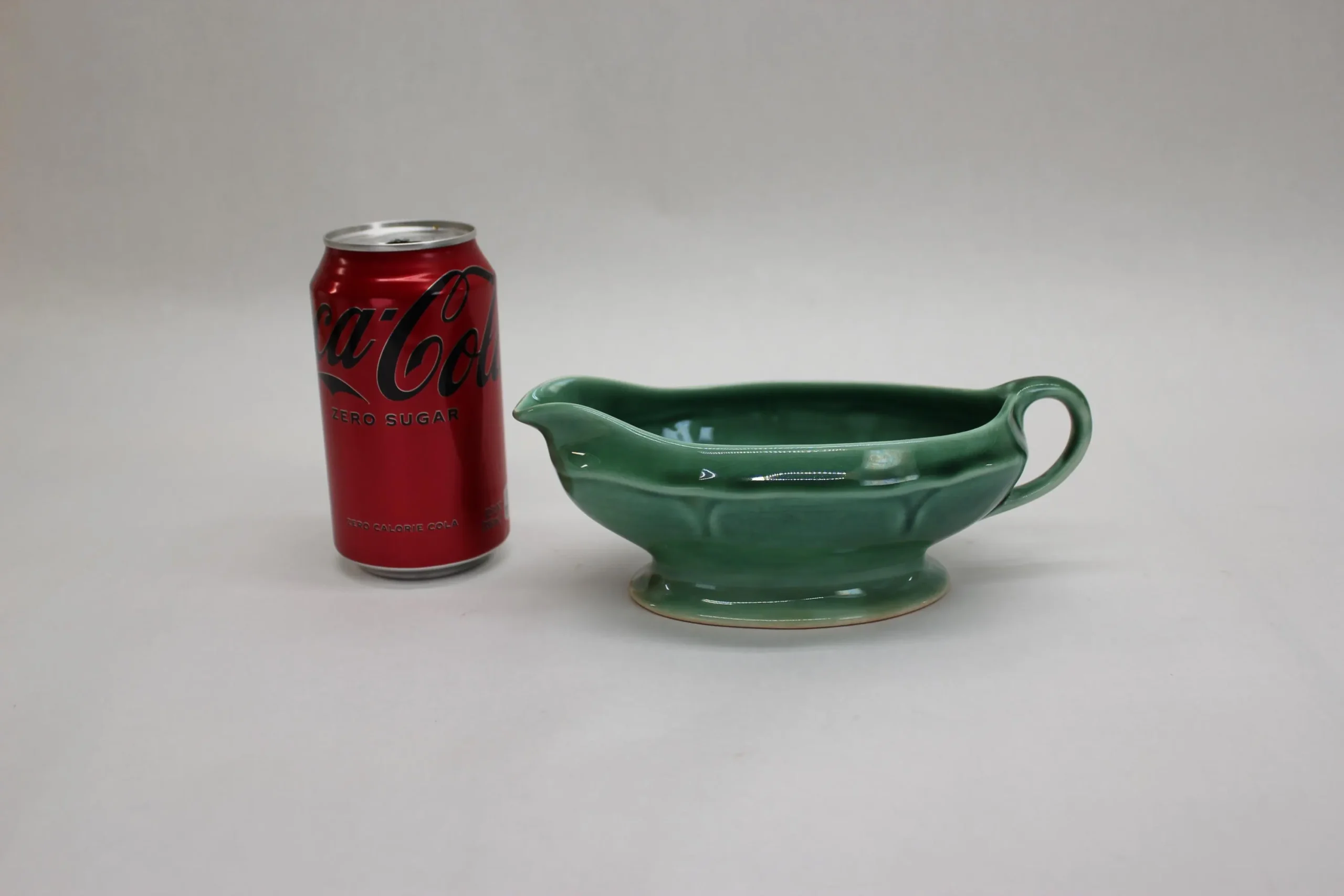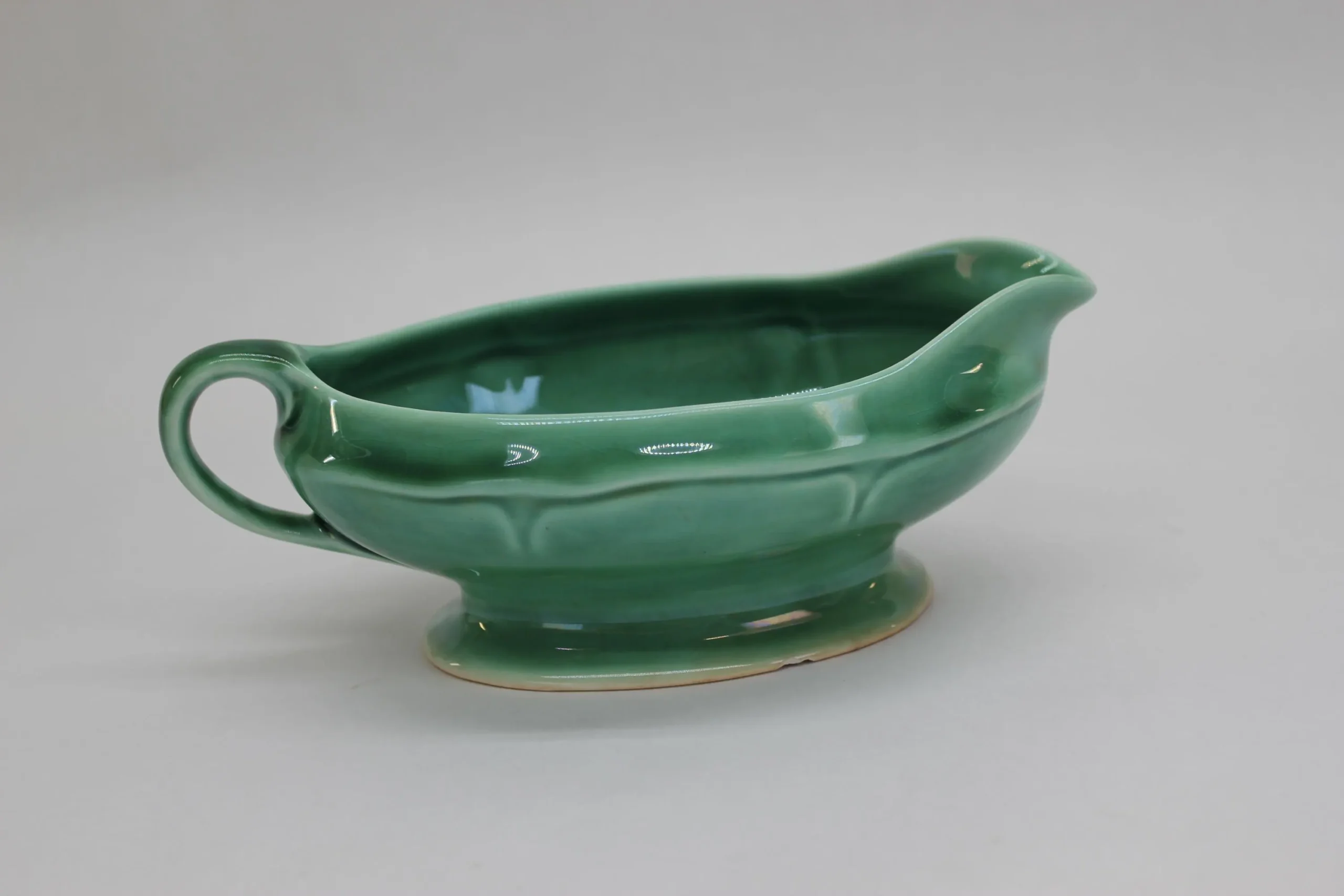 This emerald green gravy boat was made by the Mt Clemens pottery in Michigan, probably sometime in the 1930’s. It’s a classic shape and beautiful color, with some slight crazing on the inside and even less on the exterior. The gravy boat measures 7 3/4″ x 4″ x 2 3/4″ deep, including the handle. There is a tiny chip in the foot which can barely be seen in the 2nd photo.