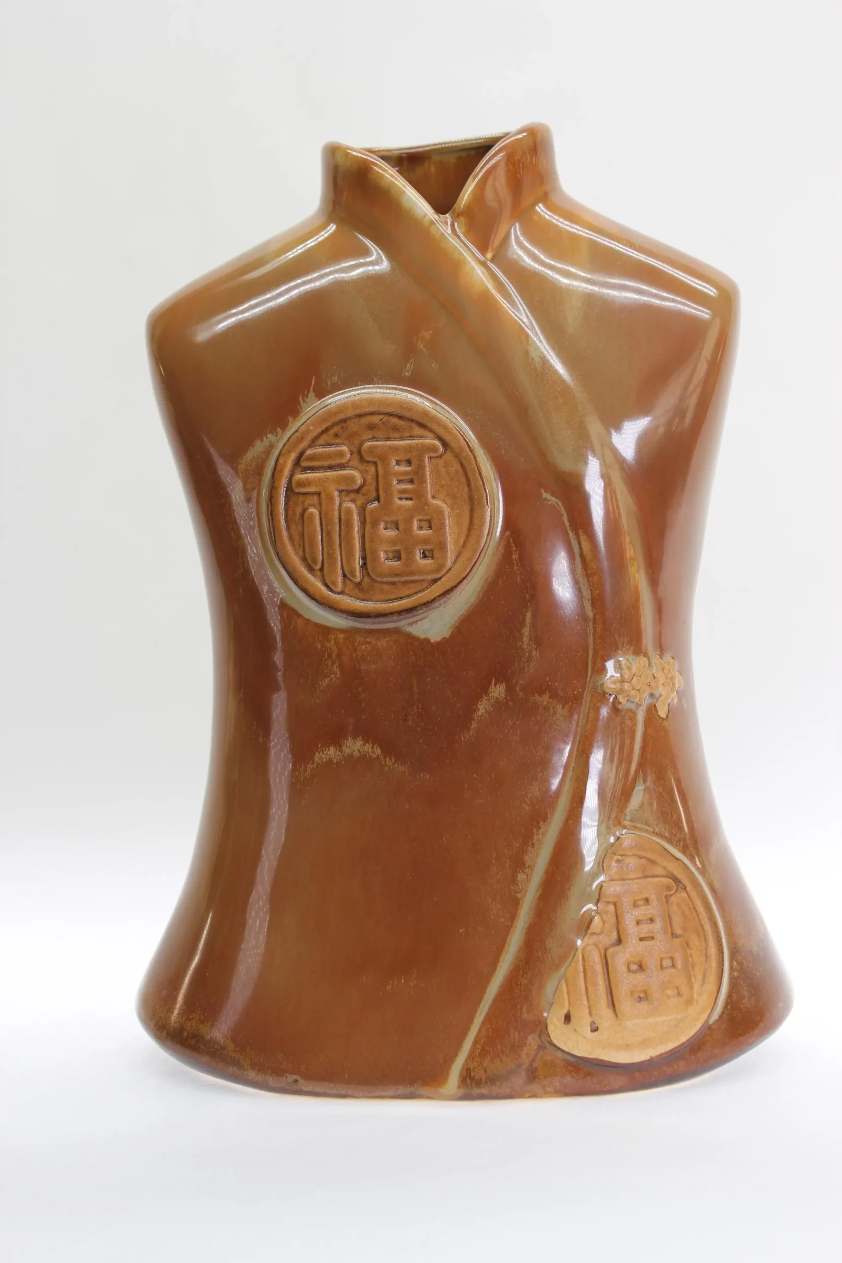 I don’t know a lot about this kimono-shaped vase aside from the remnants of a sticker on the bottom that indicates it’s part of a line called “Mystic Passages.” I’m not sure who manufactured the line, or where it was sold, but the item stood out as high-quality, well-designed, and it jus looked like something Aunt Nen might have had in her house! It stands about 10-1/2″ tall from the base to the neck, and measures about 7″ wide at the “hips.” The finish is a rich mocha color, with striations in the glaze that make it almost look like it’s carved from stone. It’s in excellent shape with no chips, cracks, damage, or flaws, and it’s heavy weight just begs to be filled with a handful or gladiolus or other long-stemmed flowers! Free shipping in the US.