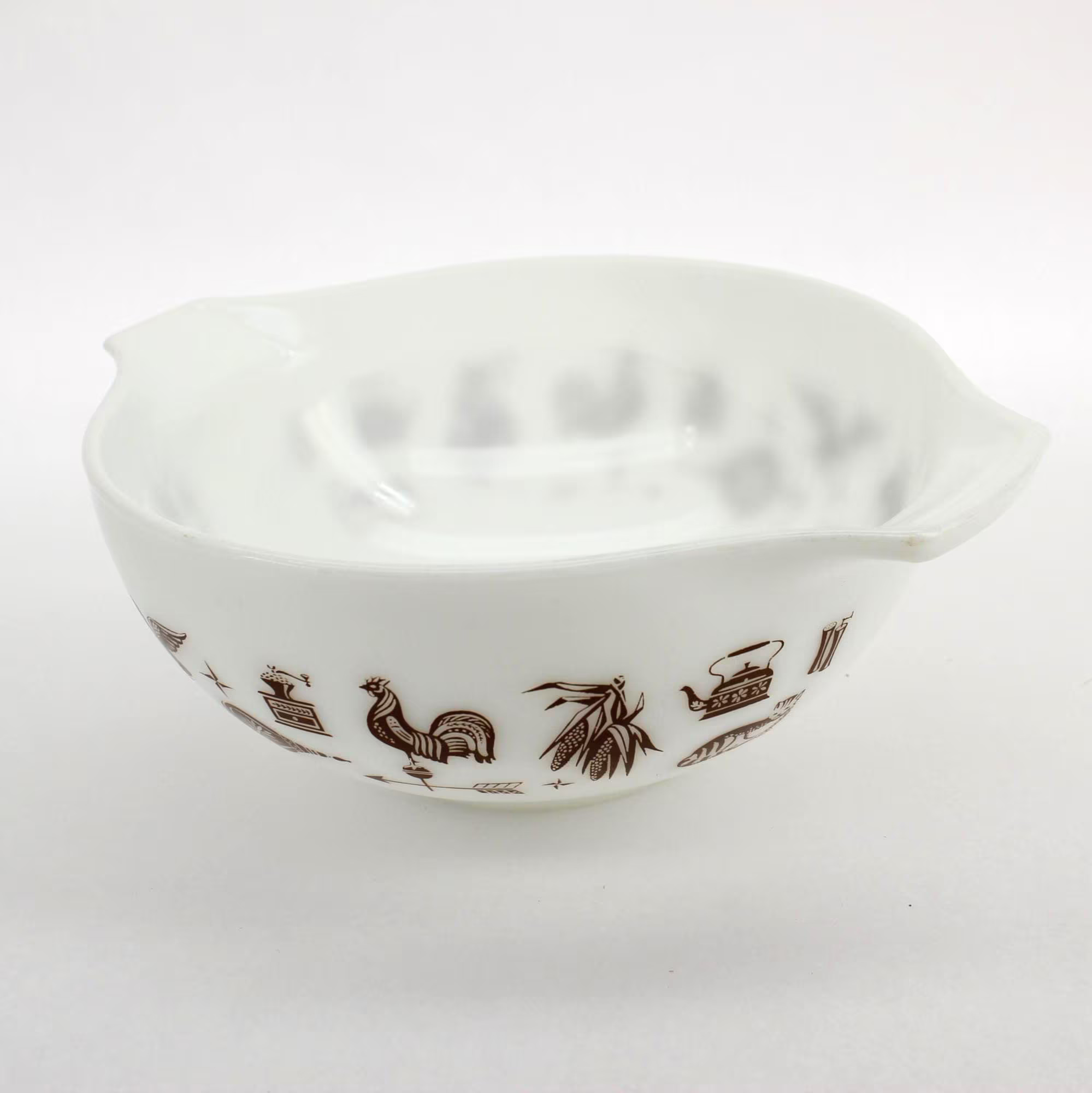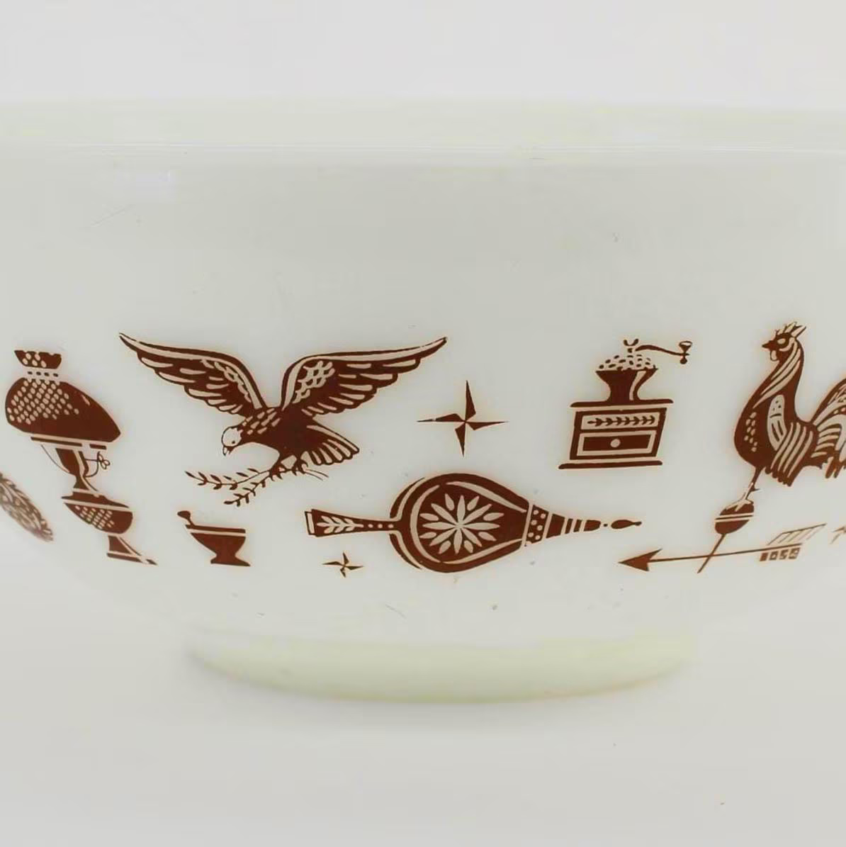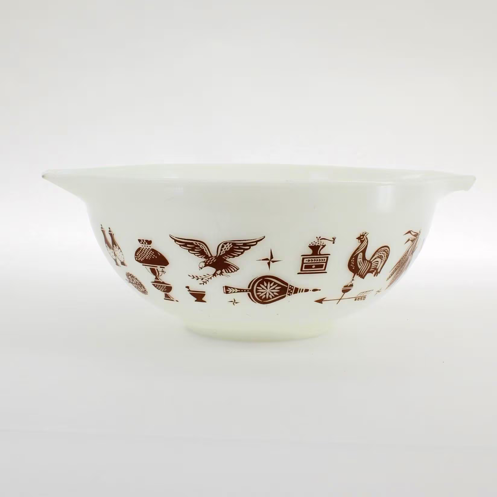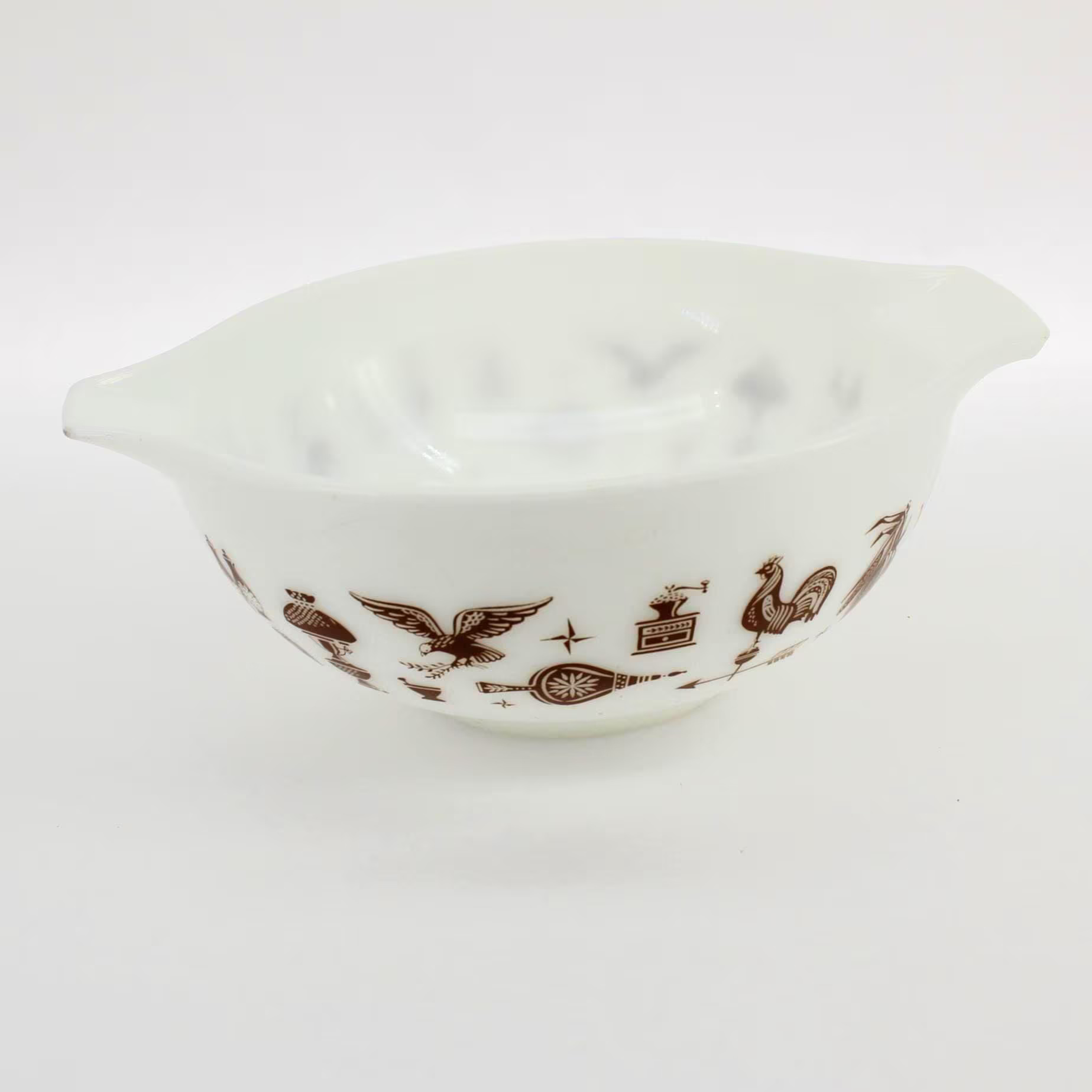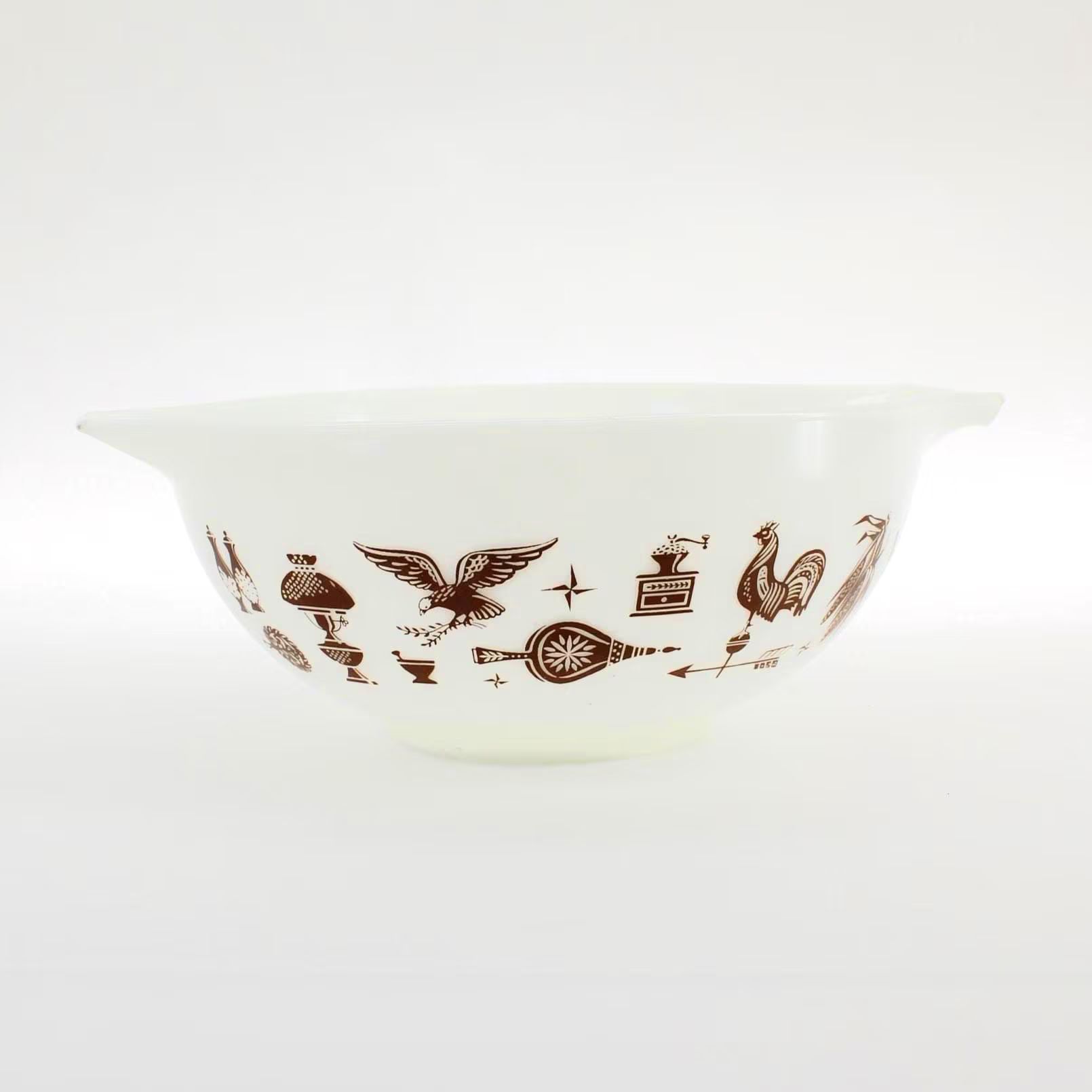 This VINTAGE Pyrex Cinderella mixing bowl features the Early American pattern — a nostalgic nod to Americana with classic copper-brown motifs including eagles, weather vanes, coffee grinders, and roosters. Produced between 1962 and 1971, this 2½ quart #443 bowl was part of a two-tone nesting set designed to reflect the country’s heritage.