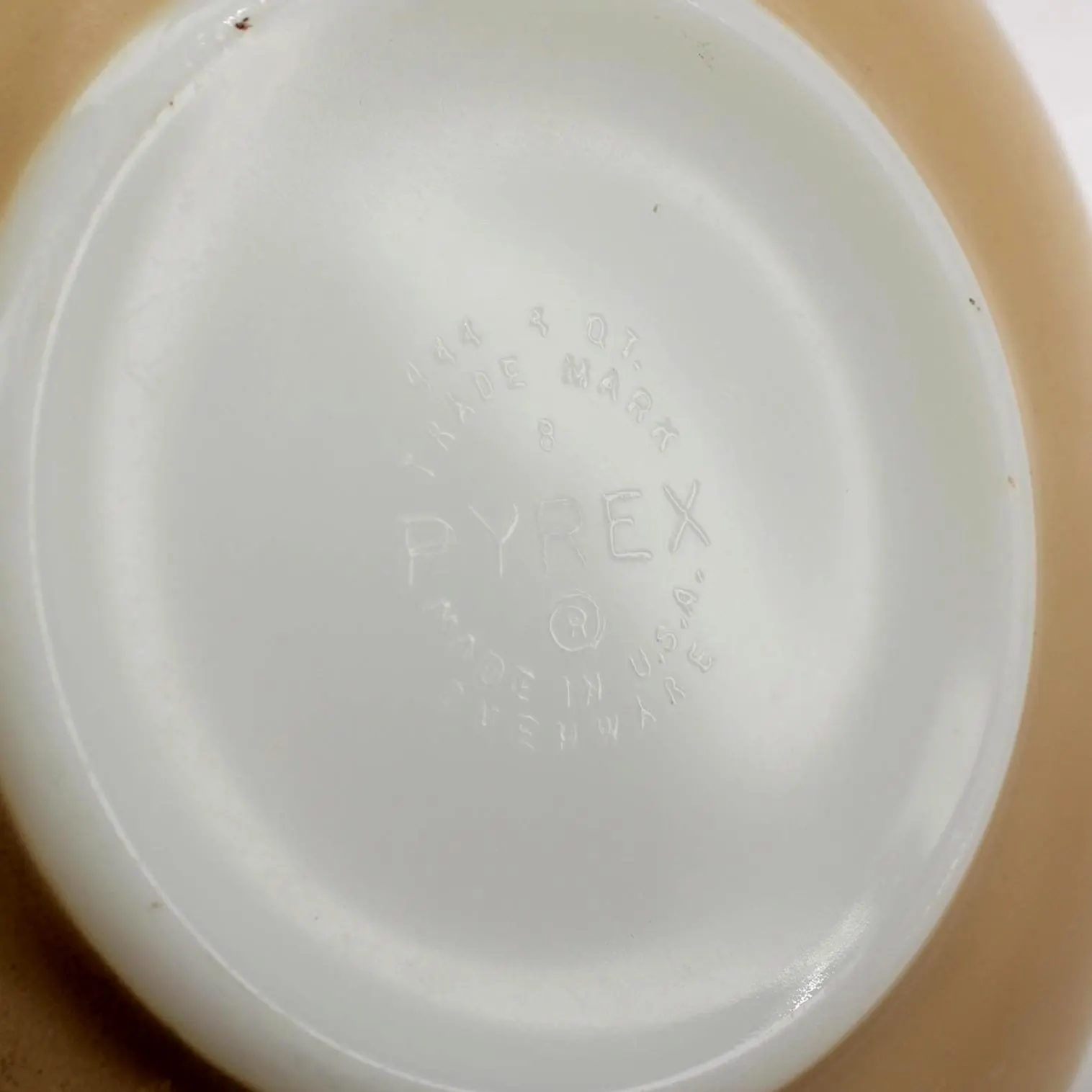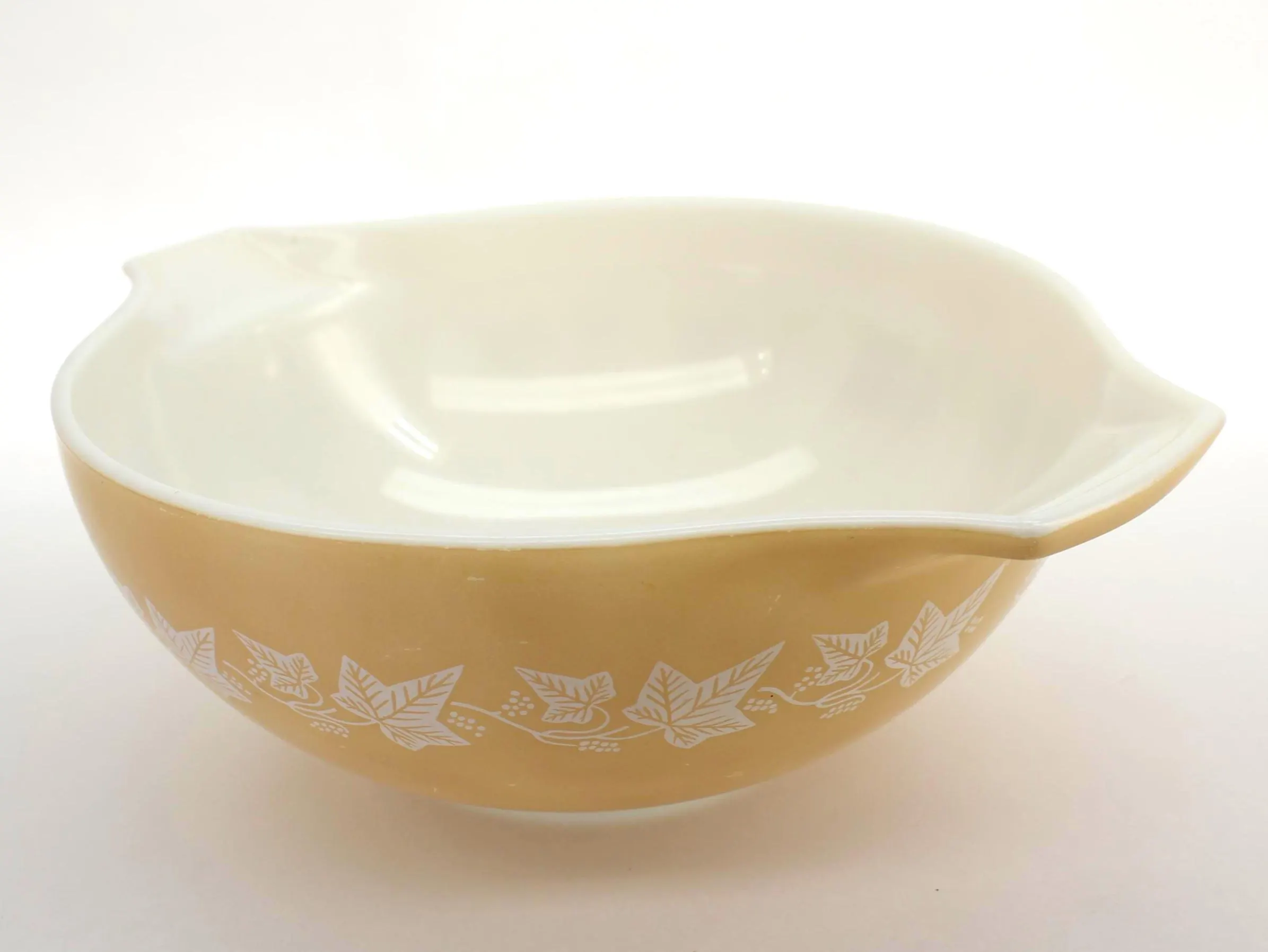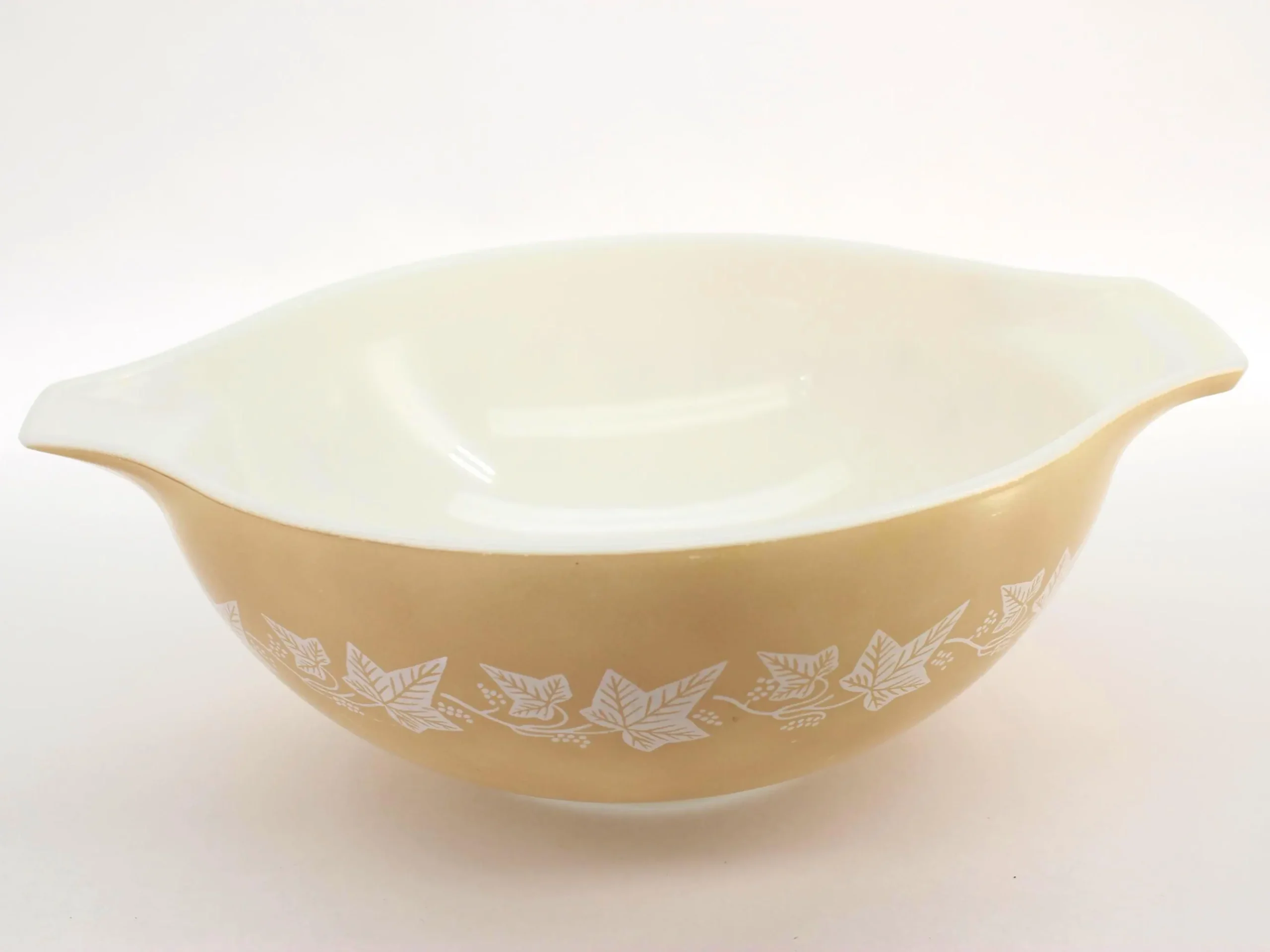 This VINTAGE 4-quart Cinderella mixing bowl in the Sandalwood pattern is the largest of the set — a true mid-century kitchen staple. With its soft tan body and crisp white stylized leaves, this generously sized bowl offers both function and timeless beauty.