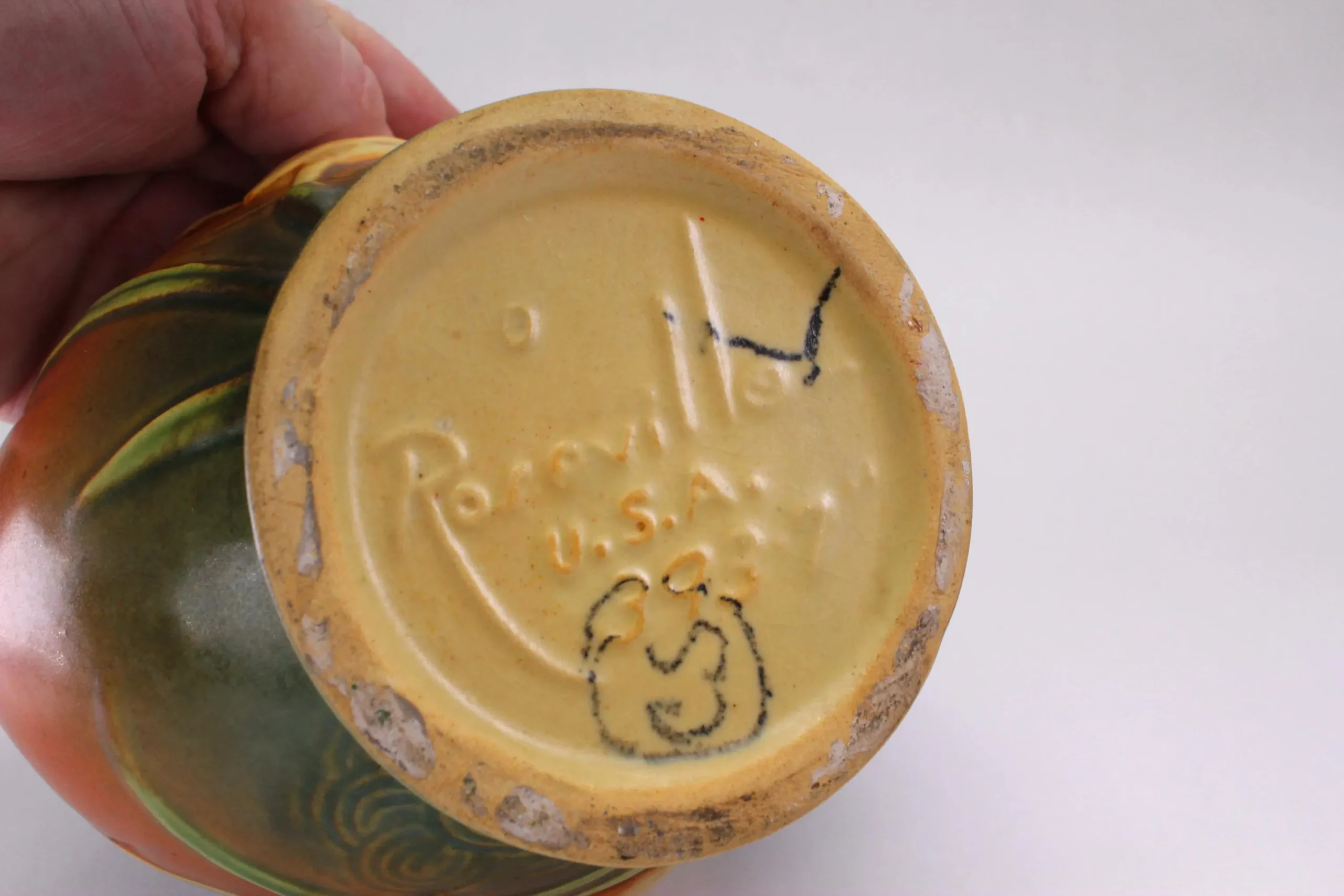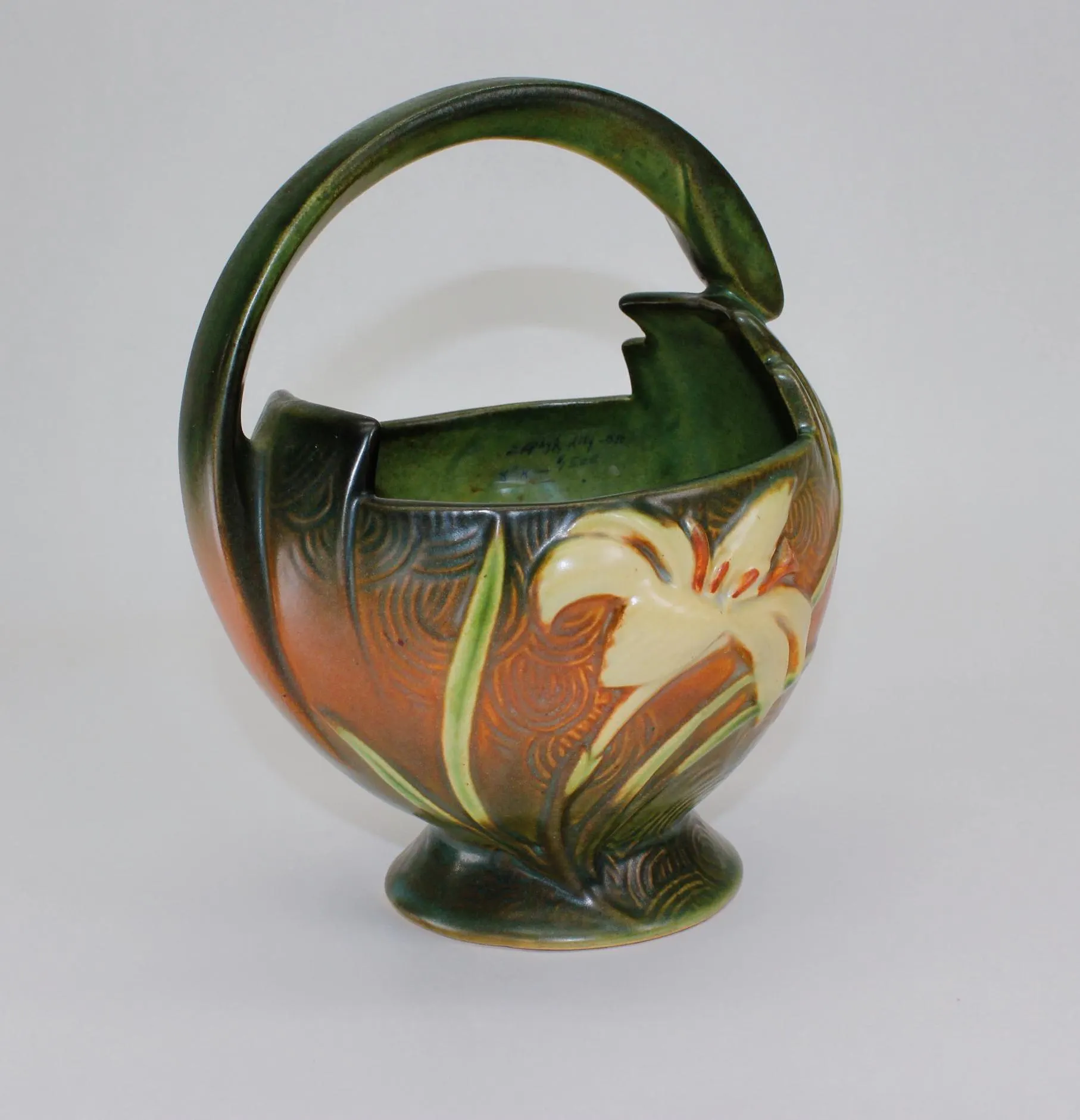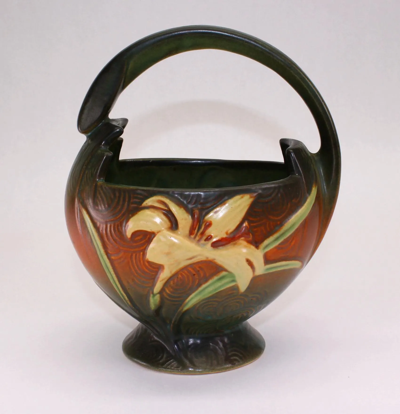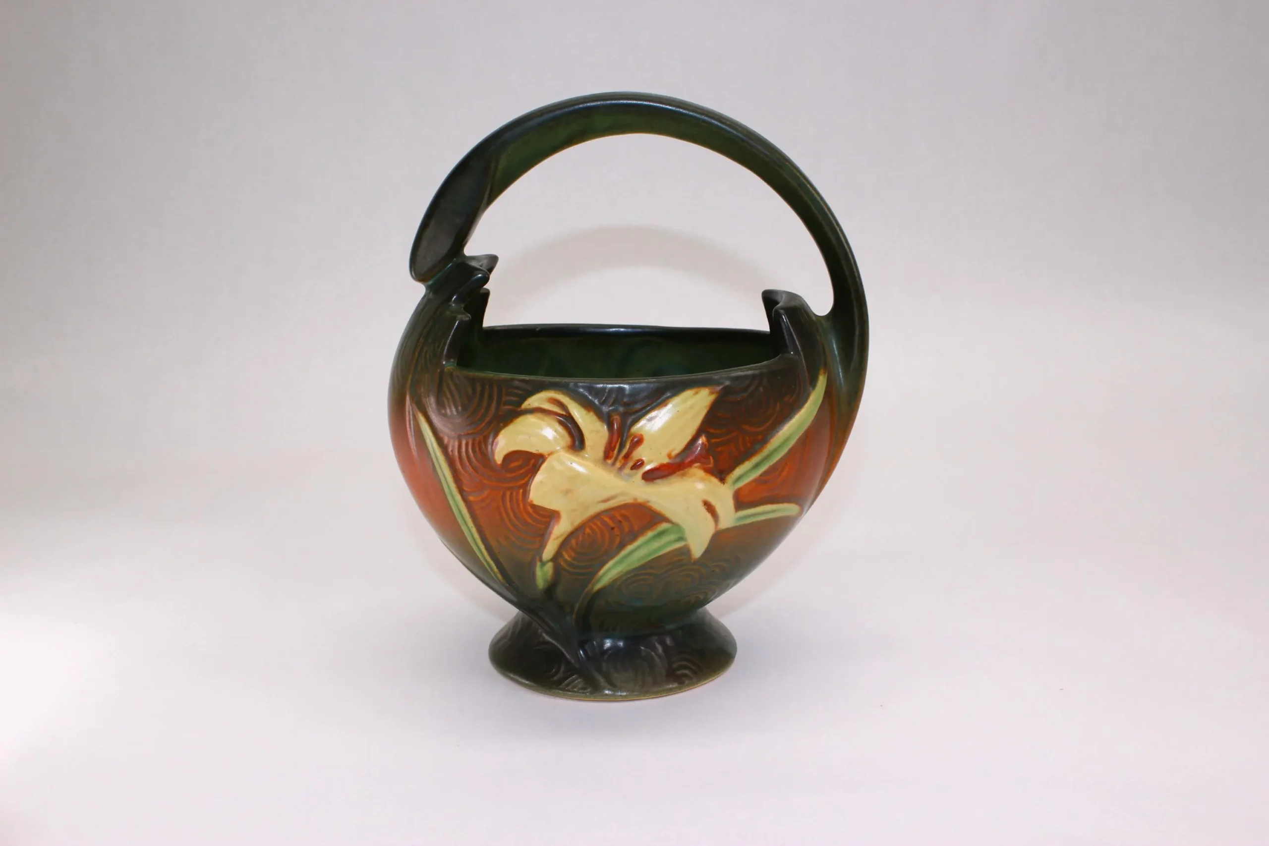 The Zephyr Lily pattern was made around 1946 and included a number of shapes, including this beautiful basket with an offset, art deco inspired handle. Both sides feature a detailed yellow lily, each with the concentric swirls of the background pattern that look to me like rippling water. It’s in excellent condition with no chips or cracks; there is some slight crazing of the glaze, less than generally seen on a piece this age. Ships free in the continental US. Signature Gift Wrap available- please select option at checkout.
