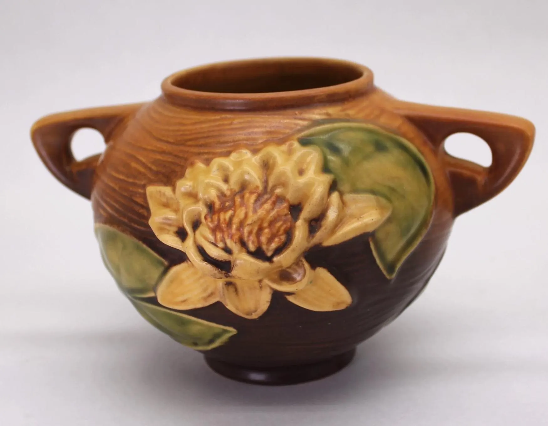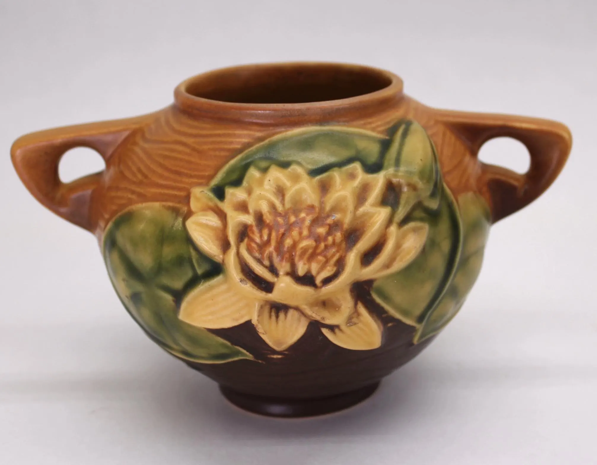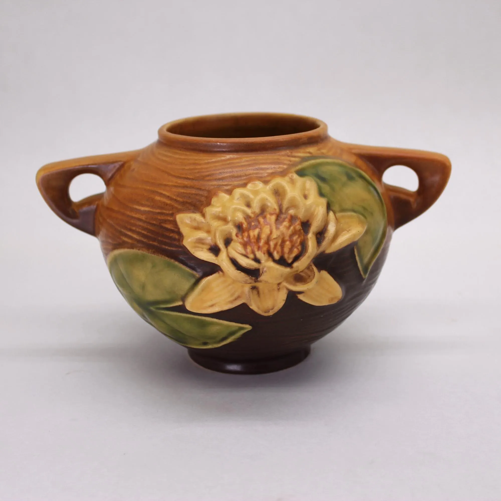 Roseville introduced the Water Lily pattern in 1943, and made and assortment of vases and planters in various shapes and sizes. This beautiful squat vase is about 4″ tall and measures 7.5″ from handle to handle. The details of the lily pads and flowers is amazing, and the glazes are in excellent condition with no crazing or cracks. It appears there may have been one small chip on the foot that was expertly corrected at some point in the past; it is barely visible in the last few photos. Add this piece to your collection today! Ships free in the continental US. Signature Gift Wrap available- please select option at checkout.