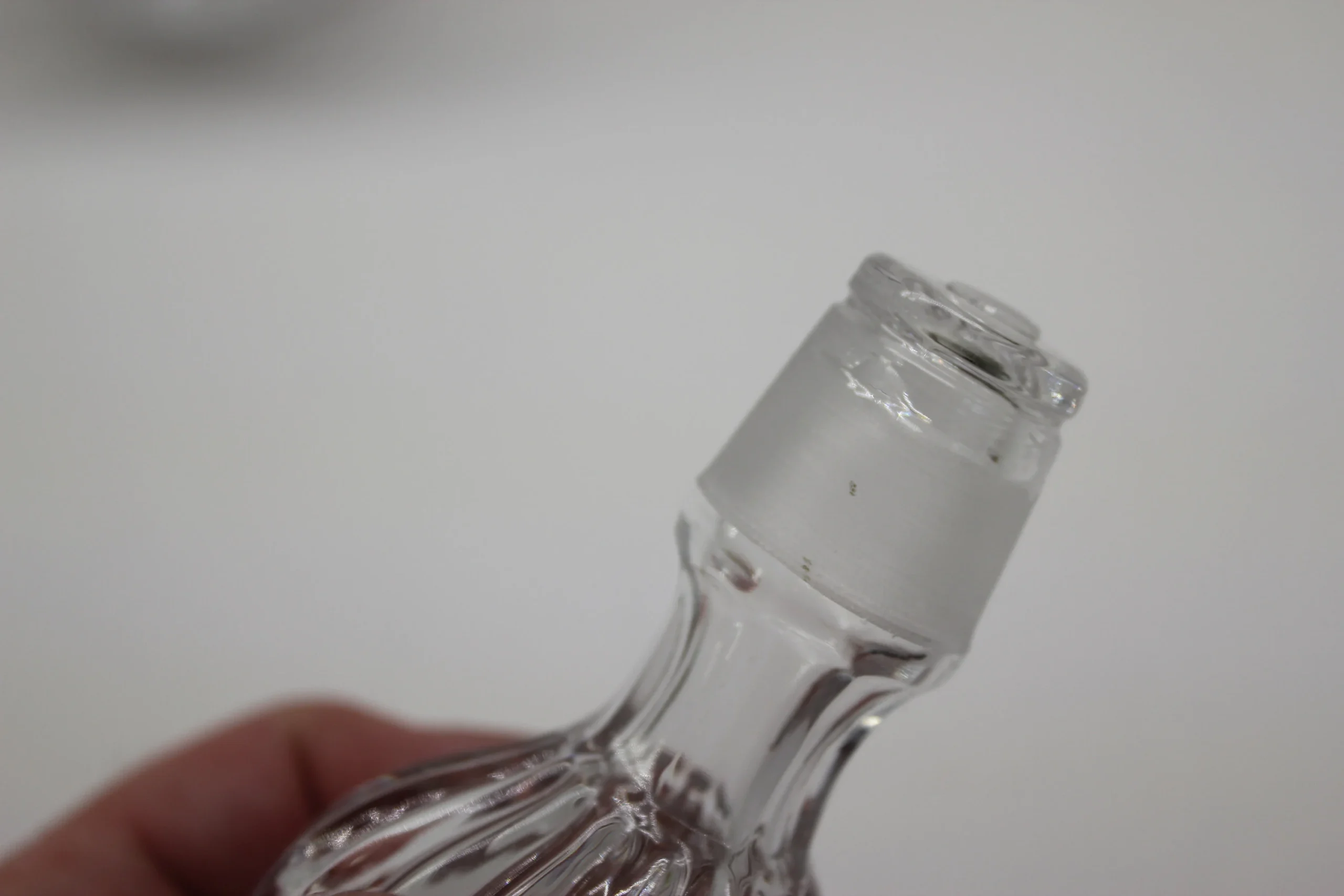 This decanter is in excellent vintage condition. The crystal is clear and brilliant with no significant chips, nicks, or cracks. The stopper fits snugly and securely.