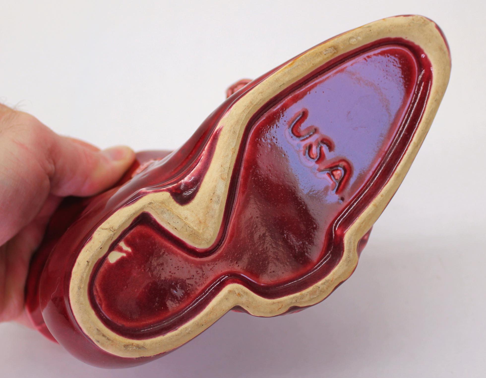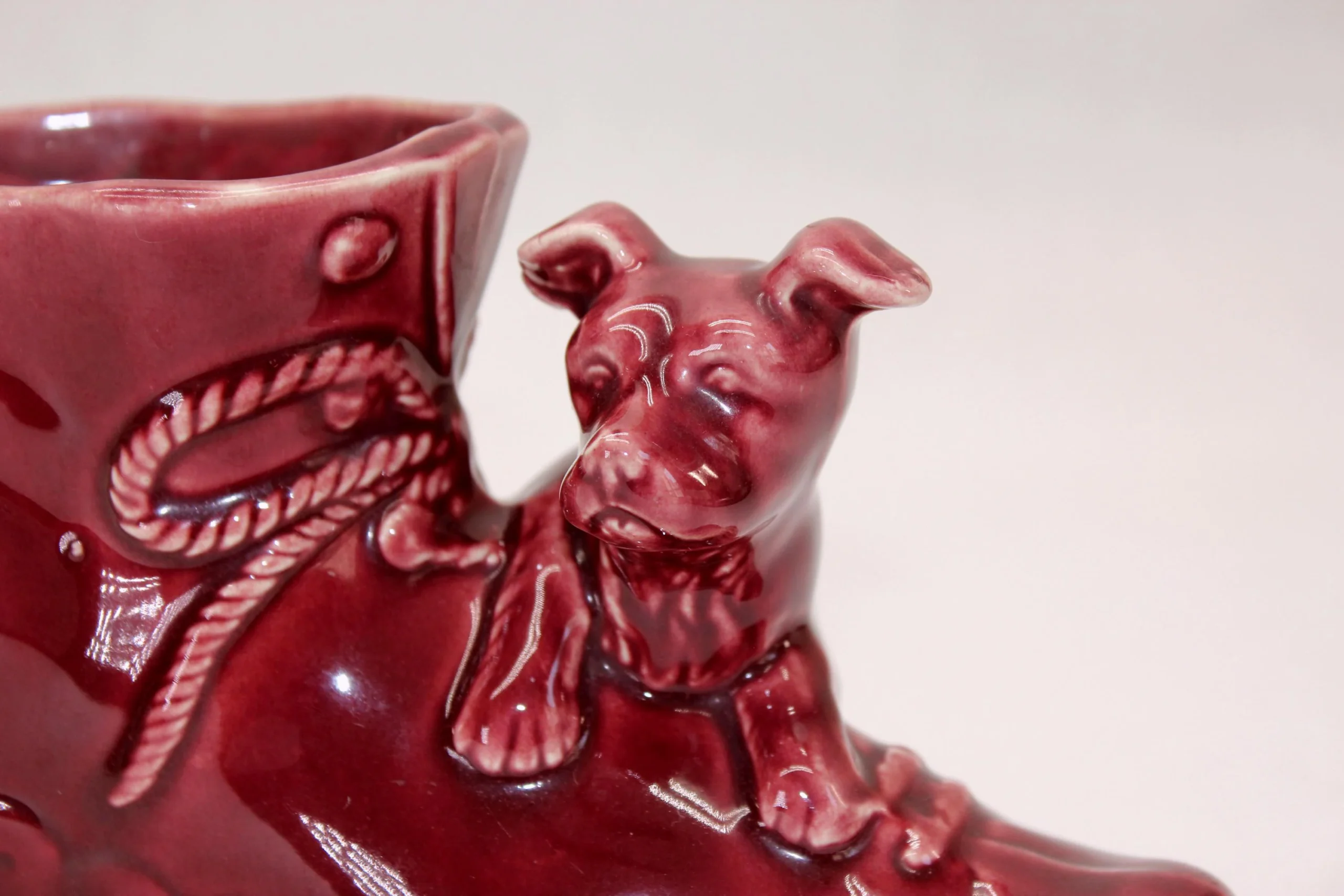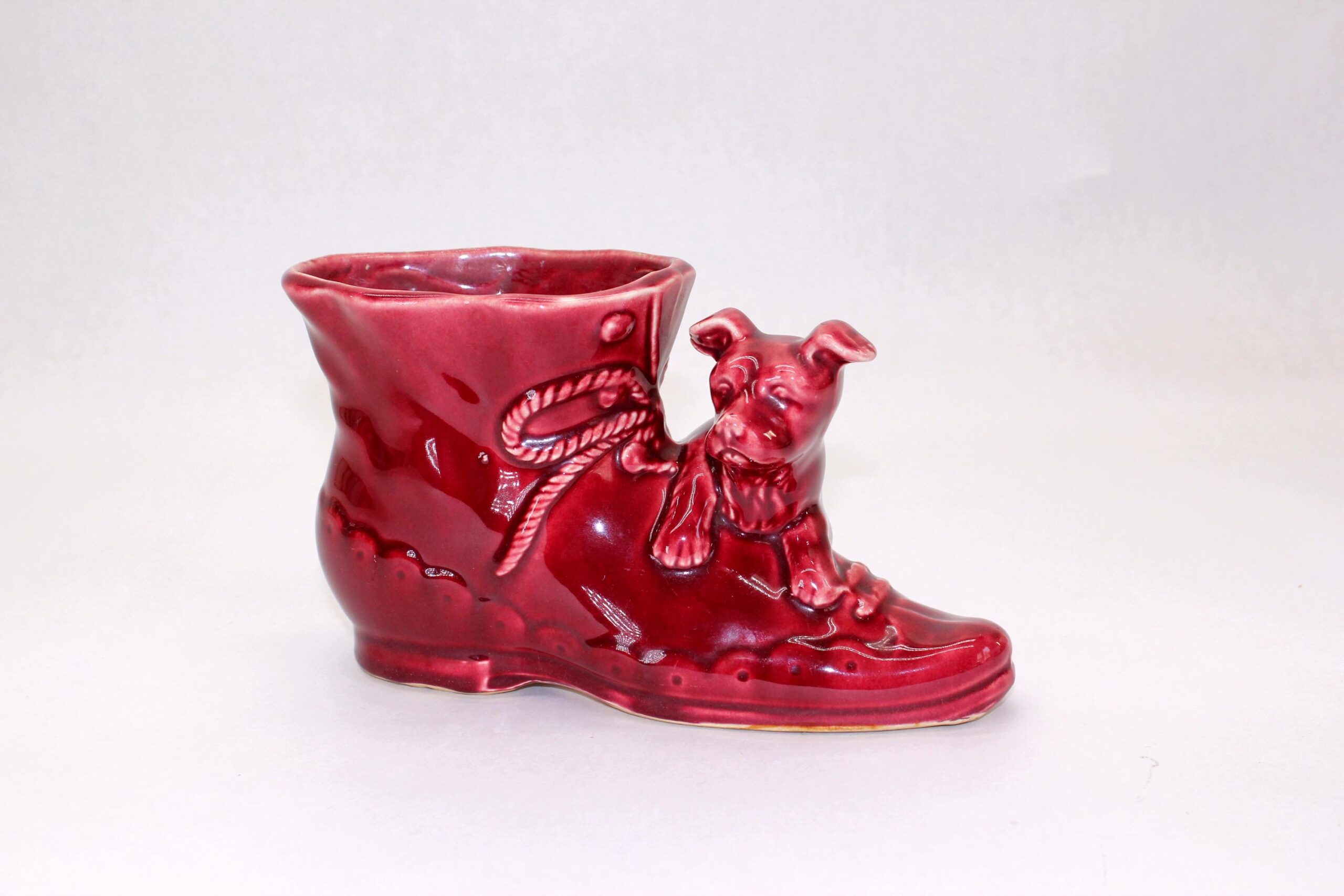 This cute fella peaking over a shoe seems to be trying to figure out if he’s on trouble… but who could be mad at that little rascal?! The shoe is about 8″ long and 4-1/2″ tall, in a rich burgundy color. It’s in great shape with no chips cracks or crazing. There is a very slight residue at the water line on the inside. Ships free in the continental US.