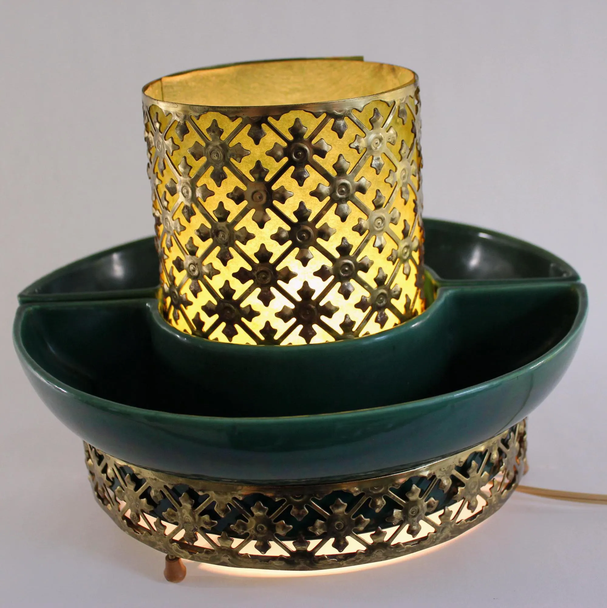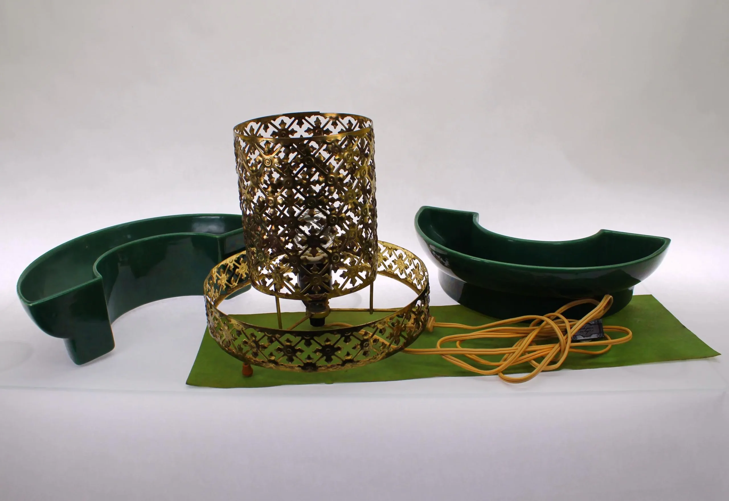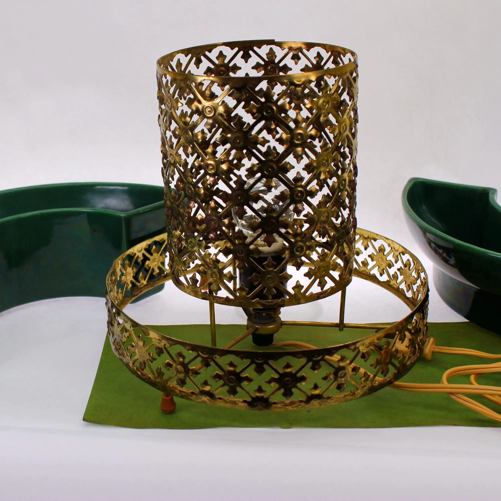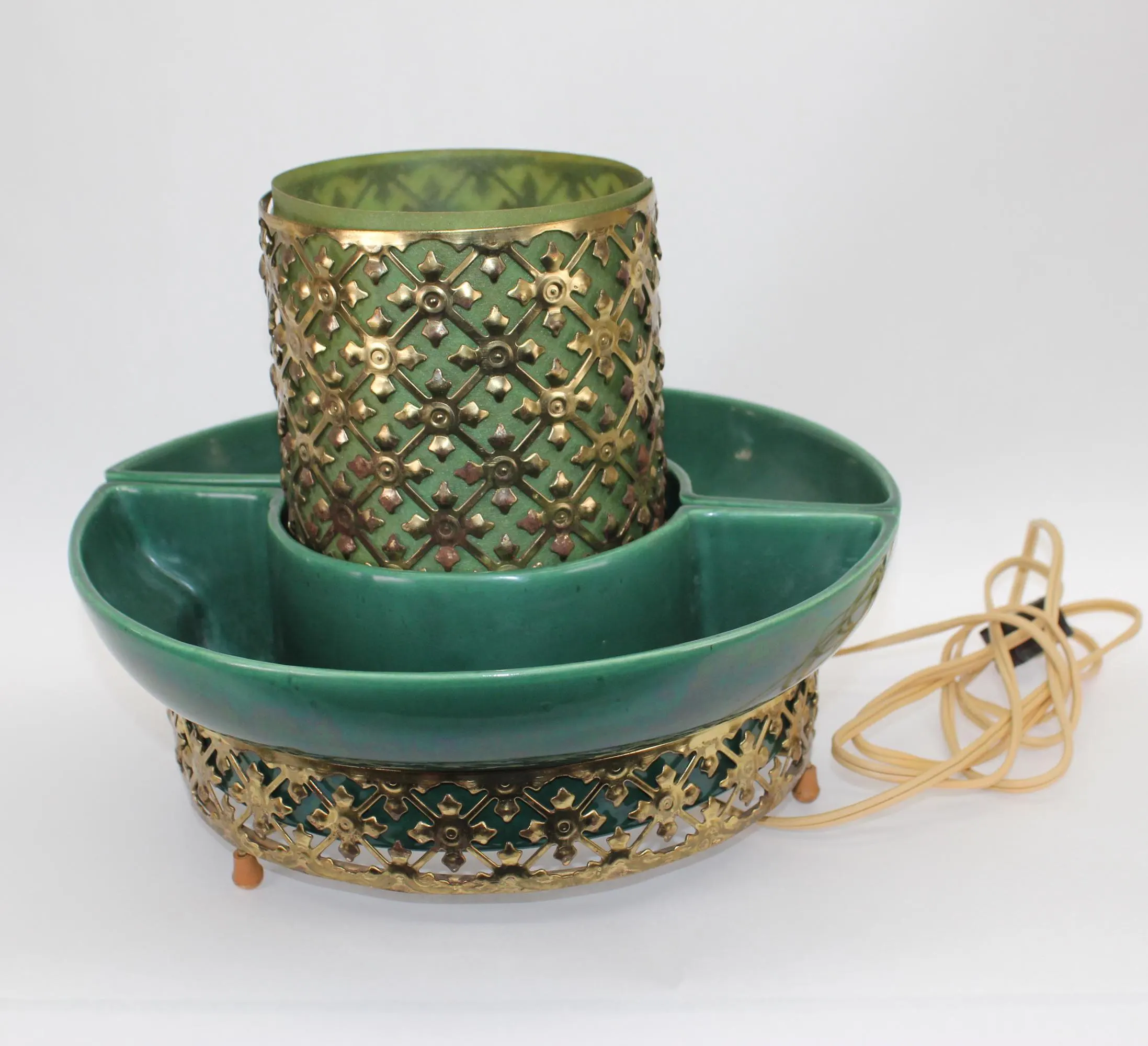 This beauty consists of 2 pottery dishes that sits firmly into the bottom part of the cage. Both pieces are in excellent condition with no chips, cracks, or crazing. The center of the cage rises through circle formed by the vessels, and is lined with a green-colored fiberglass material. The fiberglass has been carefully cleaned of grime; there is some slight discoloration where the parts that were hidden from light by the metal cage have faded less that the parts exposed to daylight, but it can’t be seen when the piece is in place. The metal cage has been cleaned of dust and grime. It shows some rust spots where the gold-tone finish has failed; I’ve left that untouched, for fear of reducing value for collectors. The electrical component is intact and in great condition with a new bulb. The switch works perfectly and there’s no damage to the cord. It measure 10″ in diameter and stands 7″ tall.