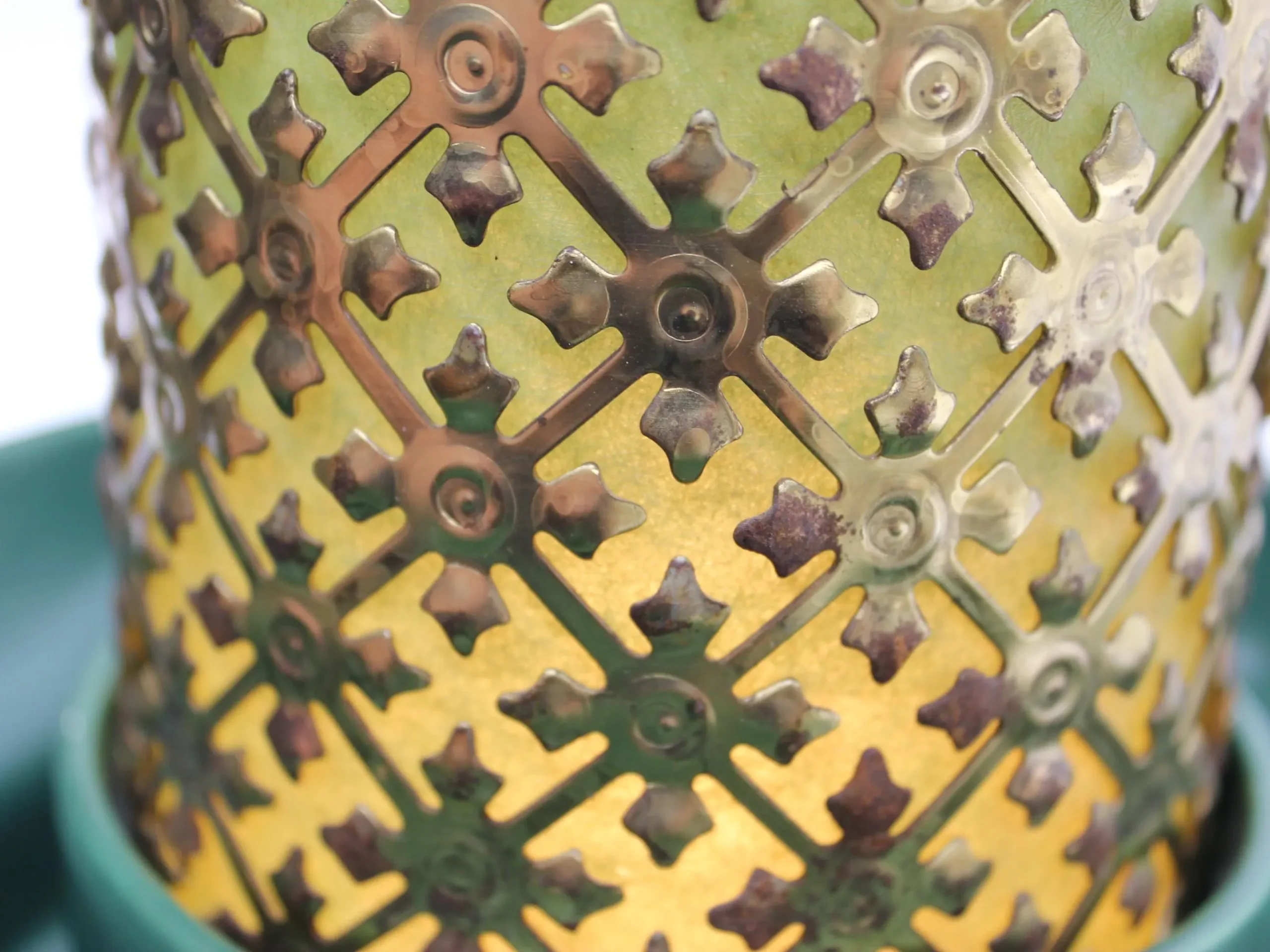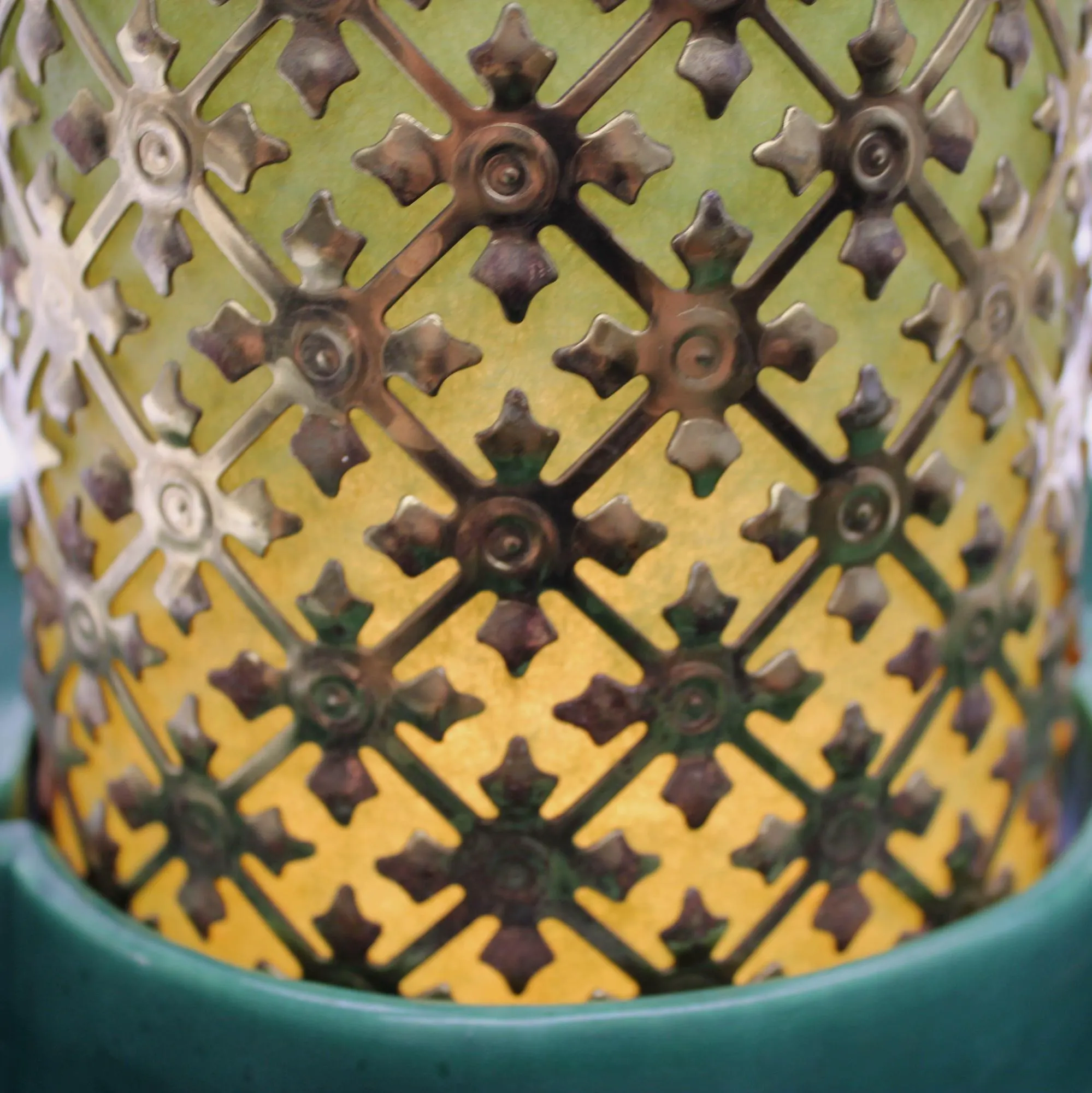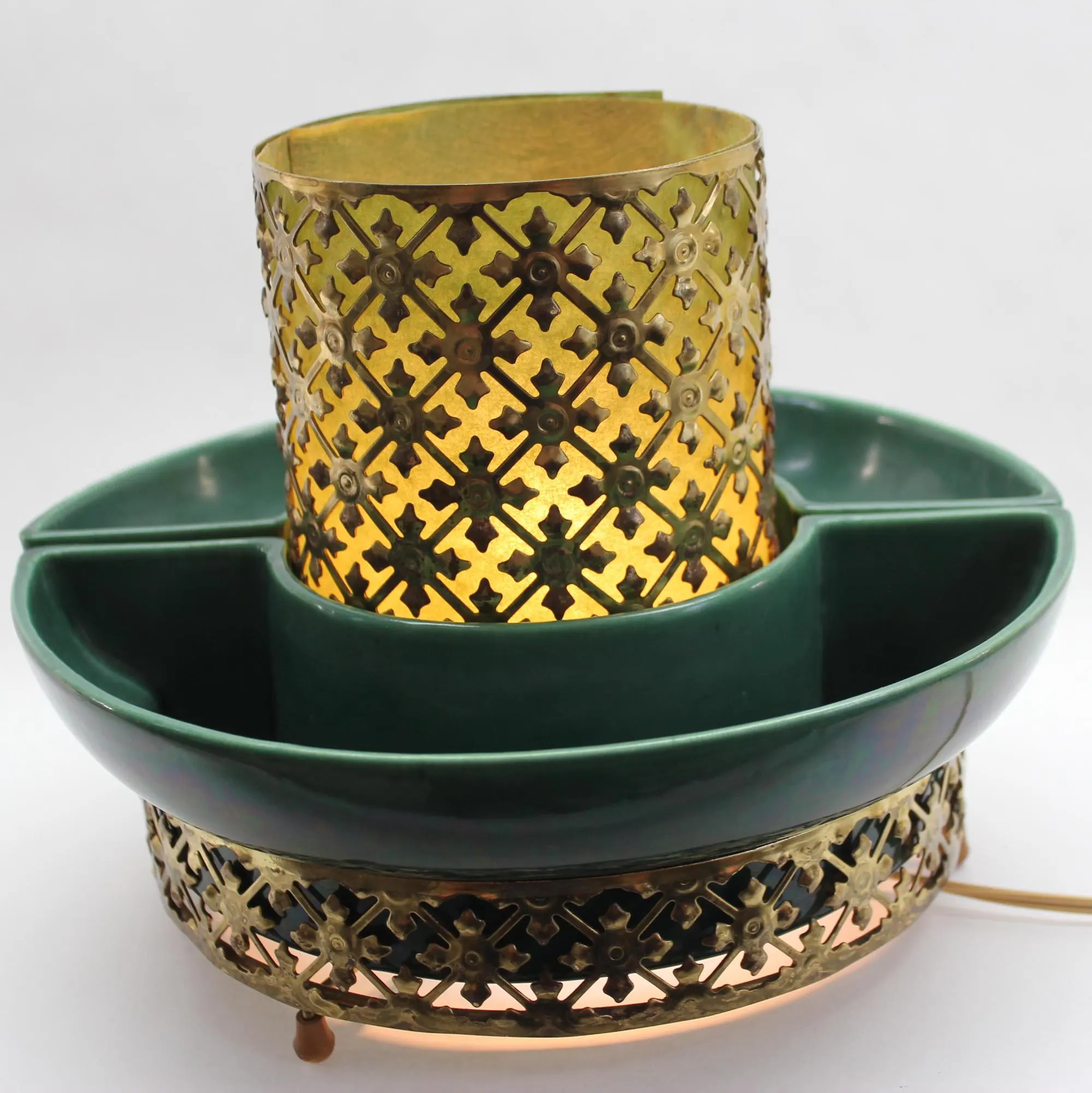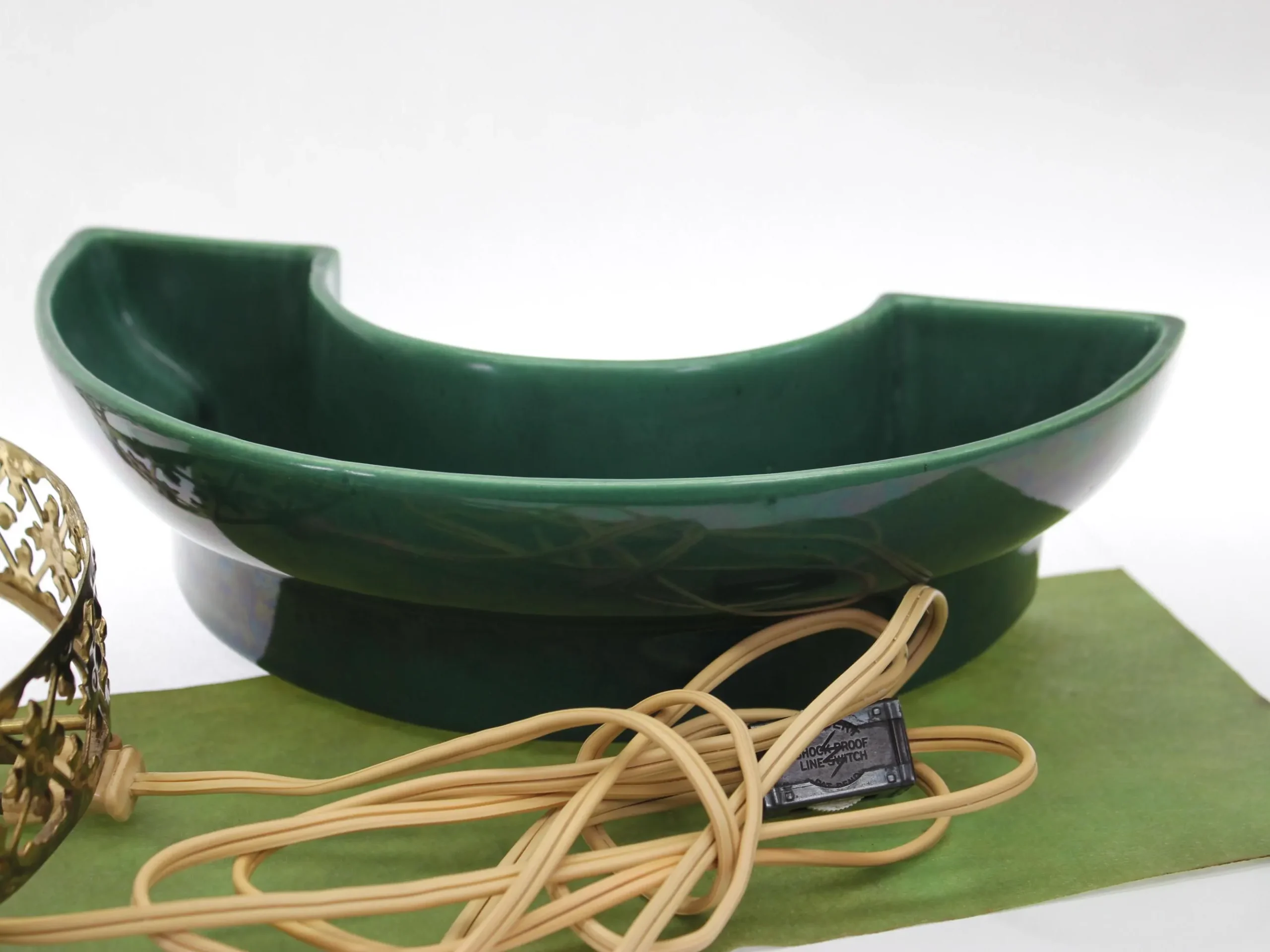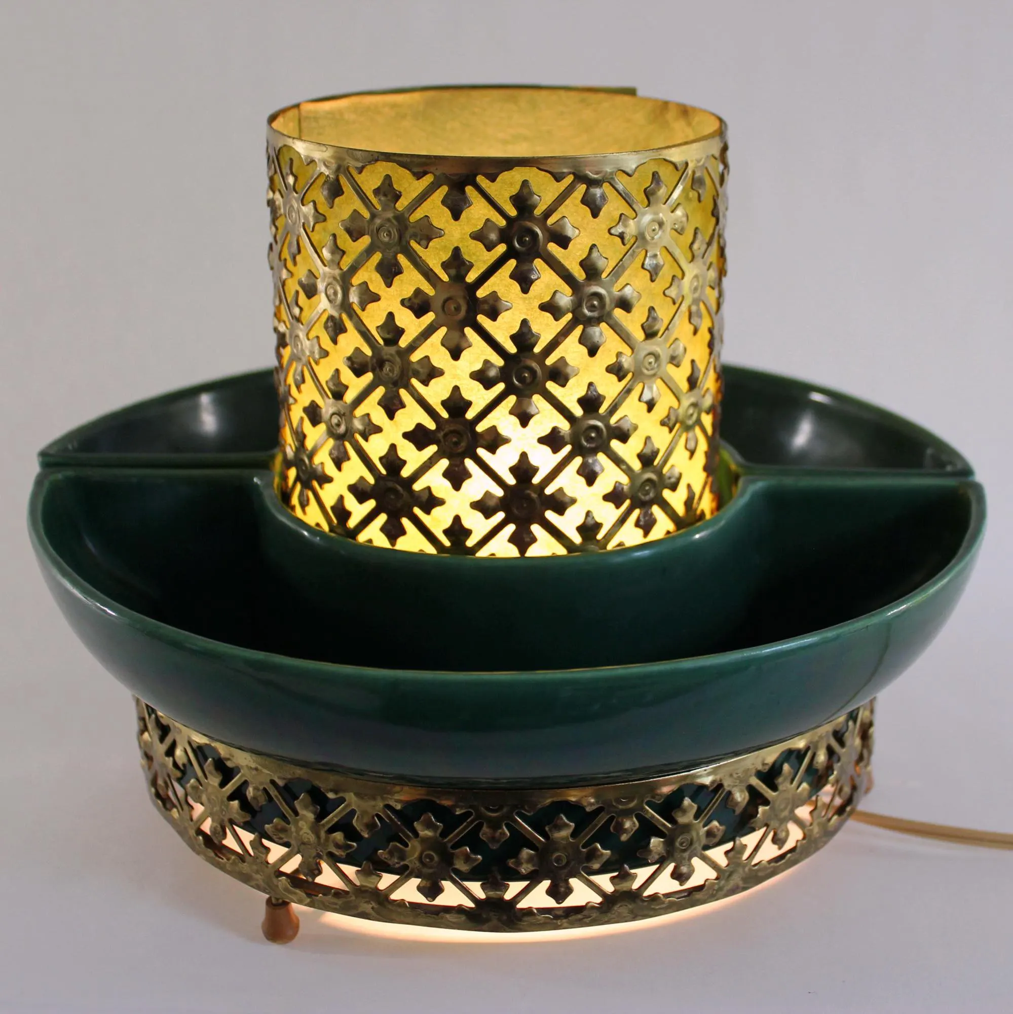 This beauty consists of 2 pottery dishes that sits firmly into the bottom part of the cage. Both pieces are in excellent condition with no chips, cracks, or crazing. The center of the cage rises through circle formed by the vessels, and is lined with a green-colored fiberglass material. The fiberglass has been carefully cleaned of grime; there is some slight discoloration where the parts that were hidden from light by the metal cage have faded less that the parts exposed to daylight, but it can’t be seen when the piece is in place. The metal cage has been cleaned of dust and grime. It shows some rust spots where the gold-tone finish has failed; I’ve left that untouched, for fear of reducing value for collectors. The electrical component is intact and in great condition with a new bulb. The switch works perfectly and there’s no damage to the cord. It measure 10″ in diameter and stands 7″ tall.