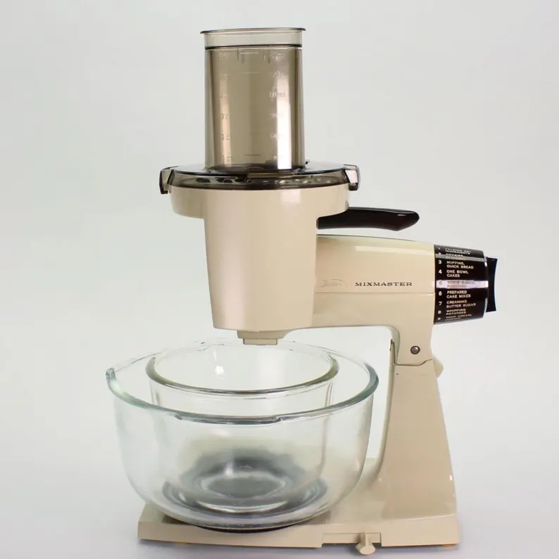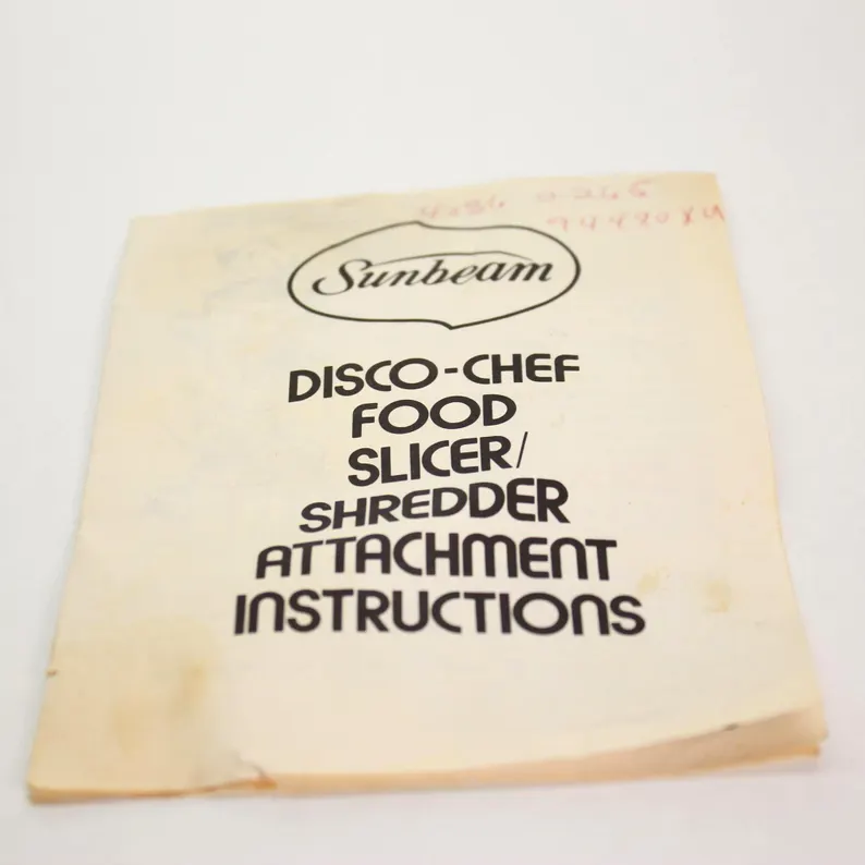 🥕 Slice, Shred, and Disco – This is the official Sunbeam Disco-Chef Food Slicer/Shredder, made to fit any Sunbeam Mixmaster with a topside accessory hub. Shown here mounted on “Bianca” (sold separately), this 1980s original was Sunbeam’s answer to the food processor boom—and she’s ready to spin!