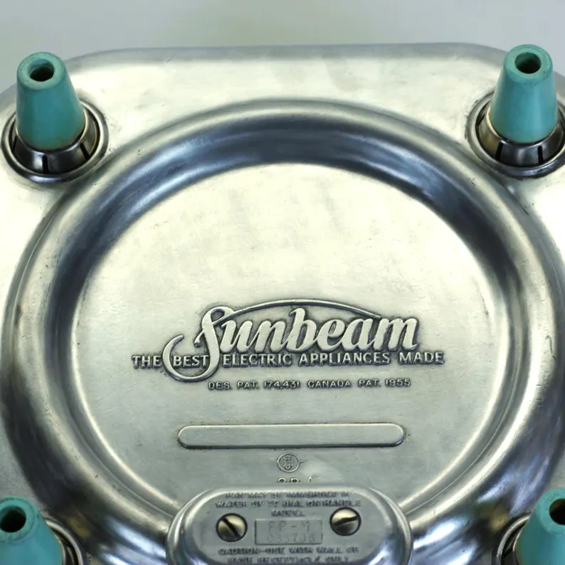 Polished aluminum base with crisp Sunbeam βThe Best Electric Appliances Madeβ logo