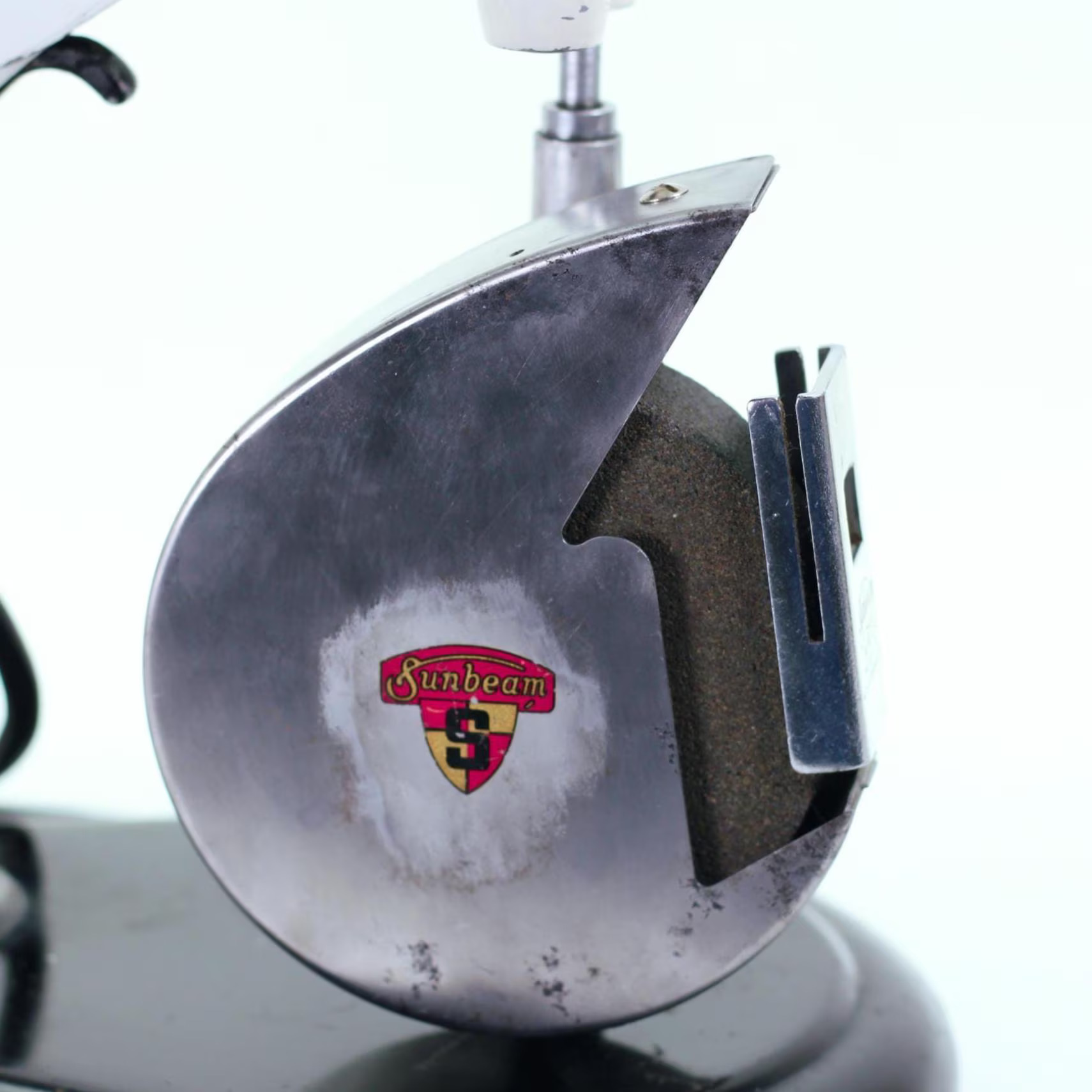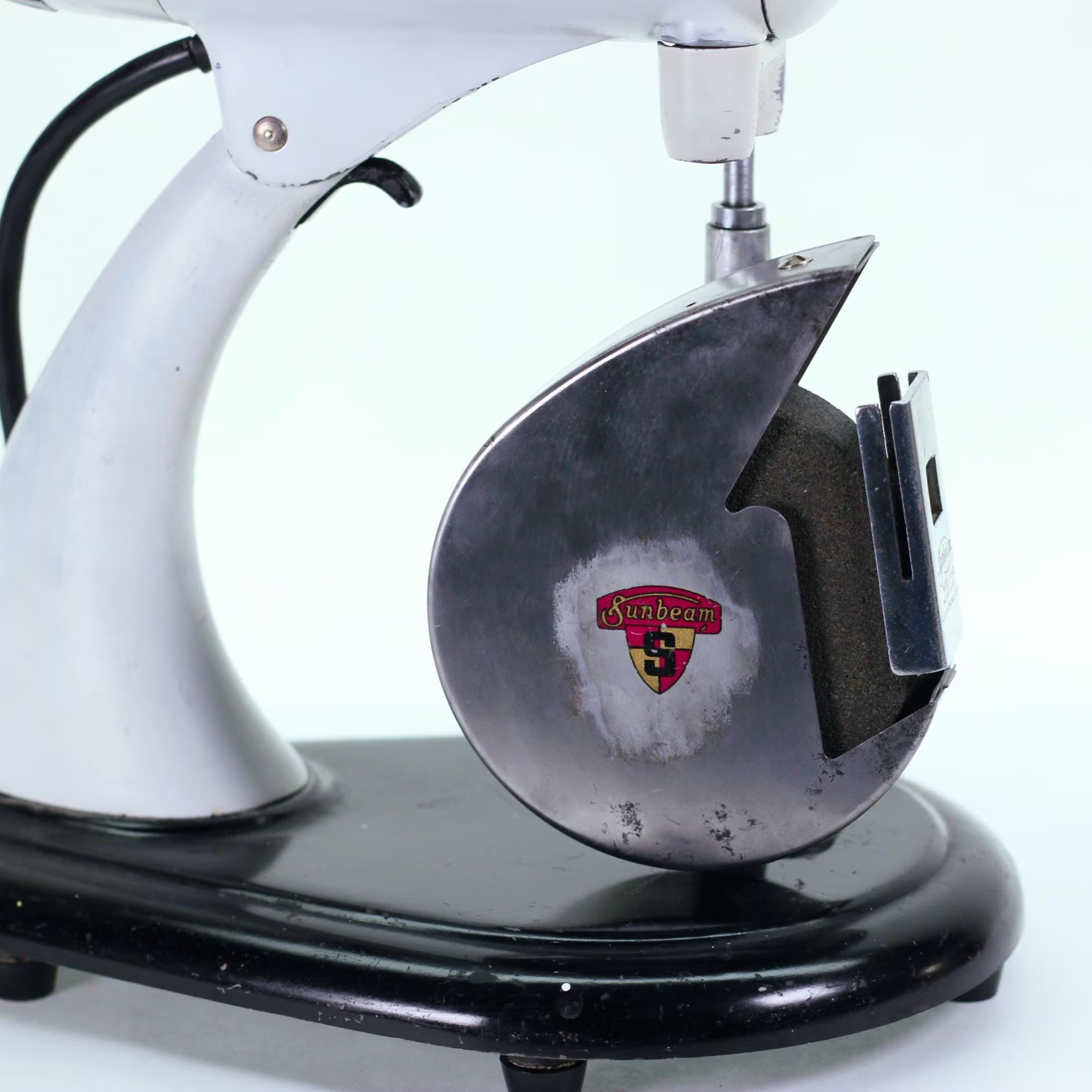 A rare Mixmaster accessory from the 1940s, designed to convert your stand mixer into a precision knife-sharpening tool. The Sunbeam KS-2 mounts directly to the Mixmaster’s power-take-off port, using the motor to spin a fine sharpening stone housed in a compact chrome-finished casing.