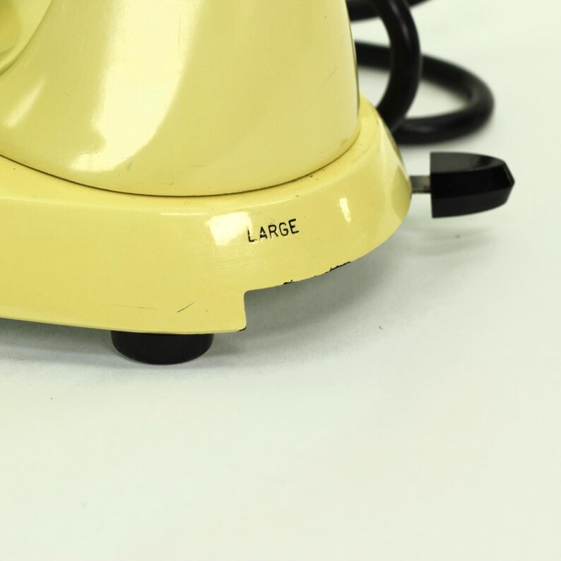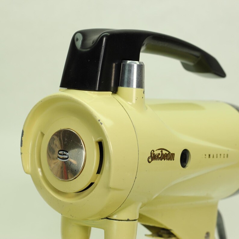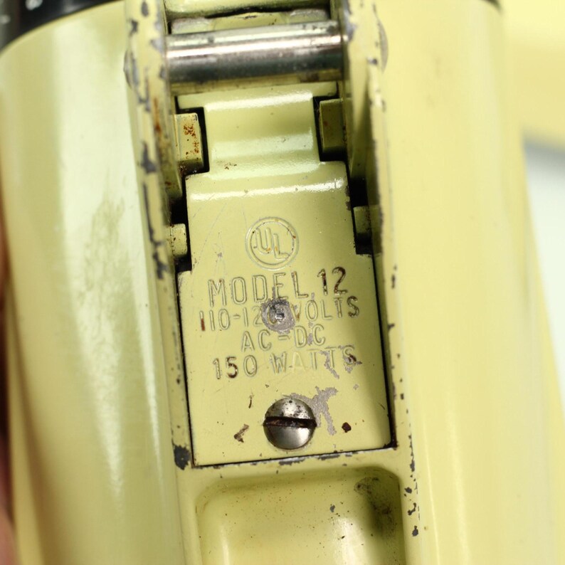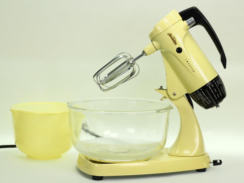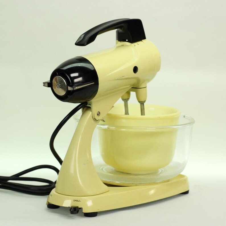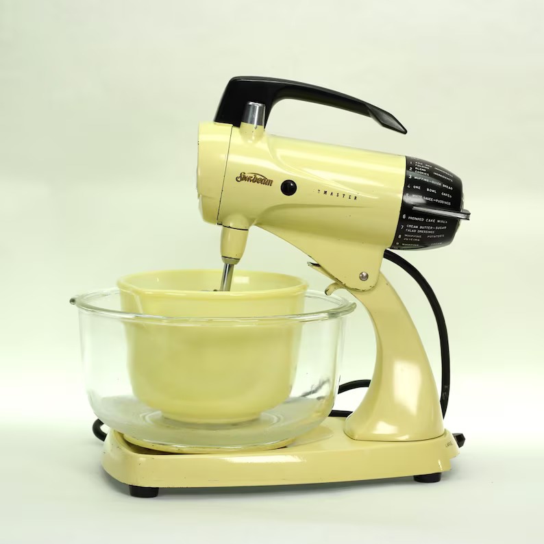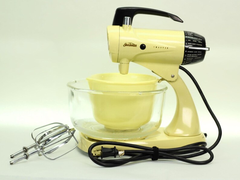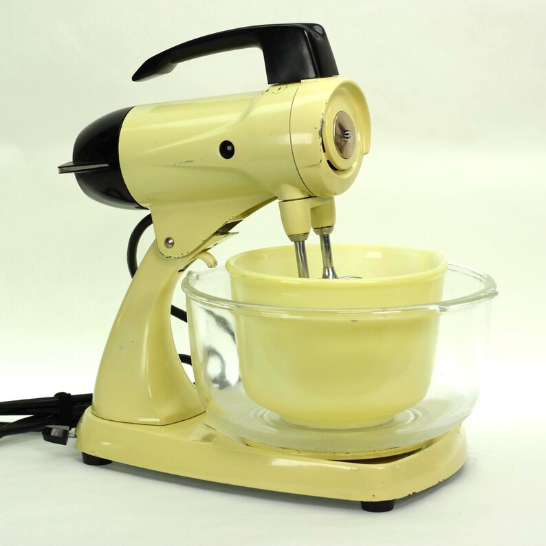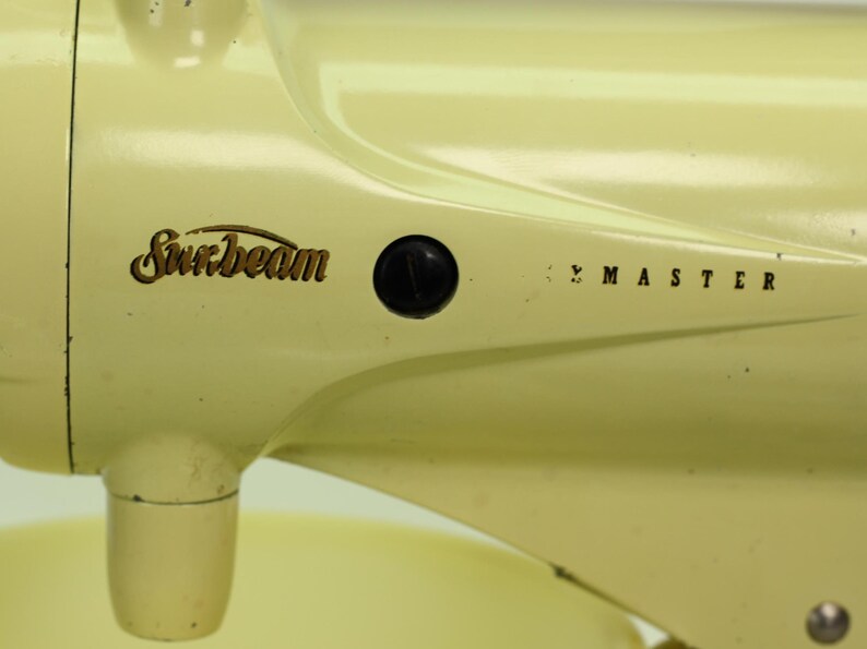 Here’s a rare treat for the Sunbeam collector: a vintage Sunbeam Mixmaster Model 12 in its original and highly desirable Buttercream Yellow finish. This sunny, pastel yellow was a popular color in the 1950s, and finding one in such excellent, original condition is a thrill. Not only does it look beautiful, but it has also been fully rebuilt to perform like new.