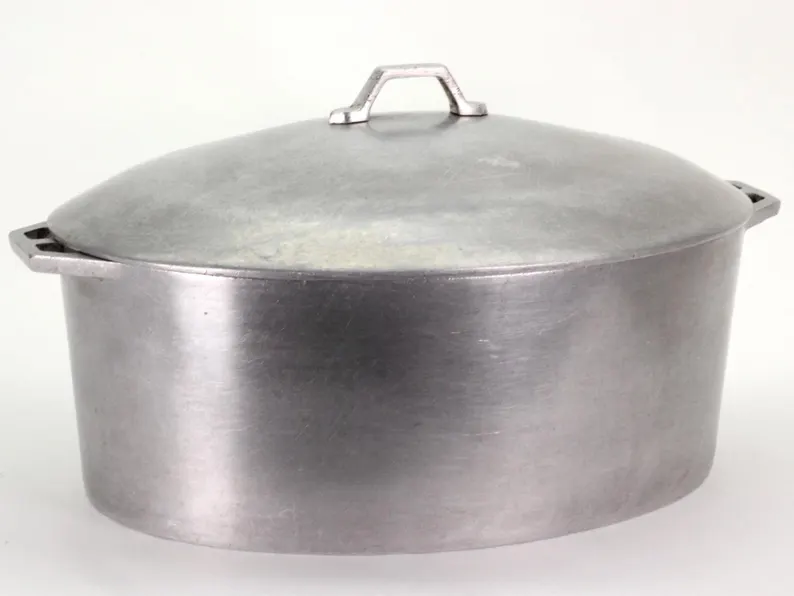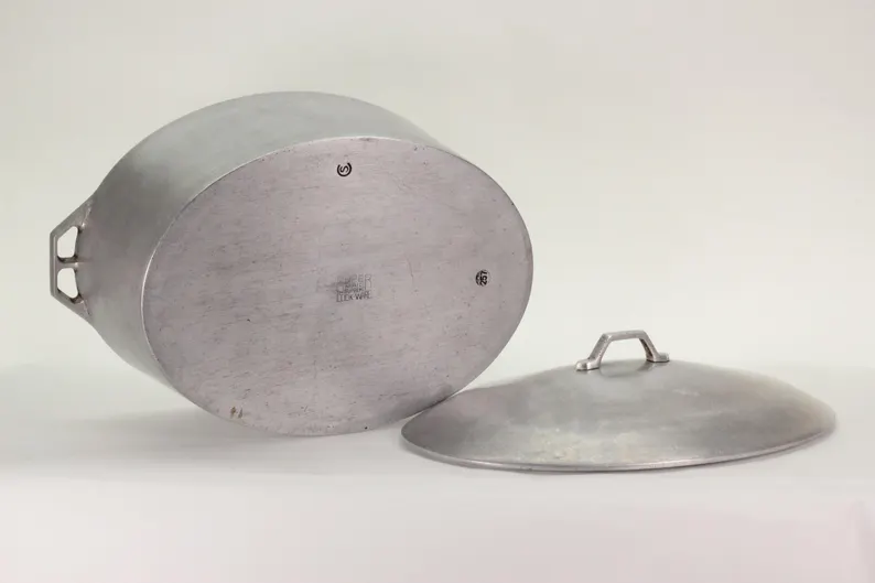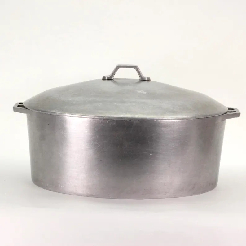 Made in the 1940s or early 1950s, this thick-walled aluminum roaster delivers the same solid weight and heat retention as its more famous cousins — without the high-maintenance mirror finish. Its matte brushed aluminum exterior is easier to care for, and the sleek tab handles and domed lid add timeless mid-century charm.