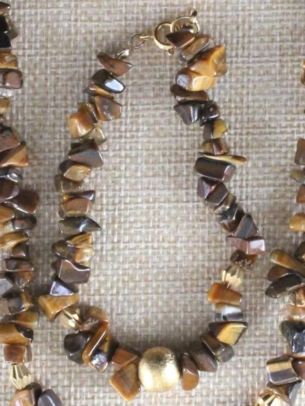 Earthy elegance meets golden glam in this striking vintage tigers eye set, featuring a necklace, bracelet, and matching drop earrings. Each piece is strung with richly variegated tigers eye gemstone chips, known for their protective properties and mesmerizing chatoyancy. Bright gold-tone metallic accent beads add a bold, mid-century flair.