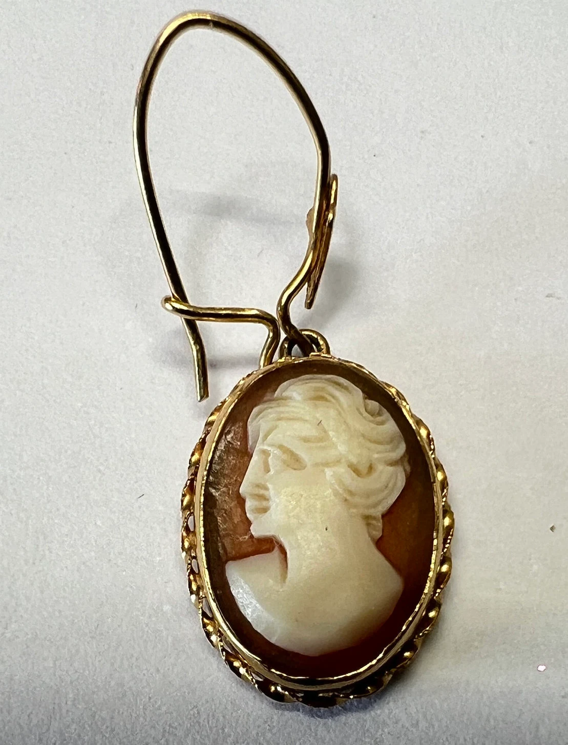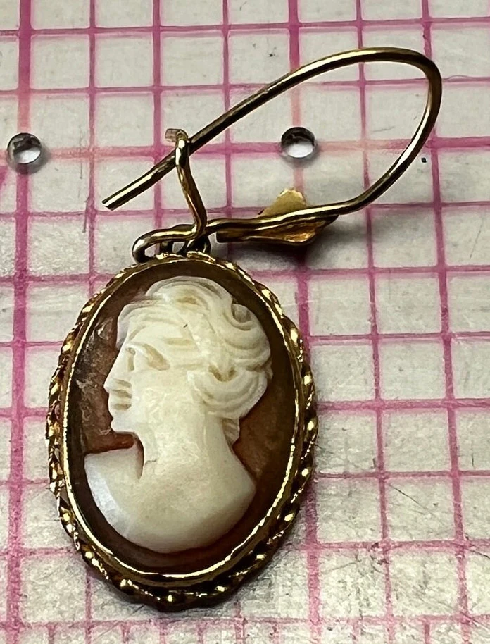 What can you do with a single cameo earring? Heck if I know- I sure a hell don’t have a use for it. It could go onto a charm bracelet- do people still wear those? Maybe you could make a pendant or a broach for a baby doll? This lady is not even all that pretty- she’s got a big nose, bad hair, and a crooked smile. But I don’t need her, and you might, so I’m pricing her accordingly!