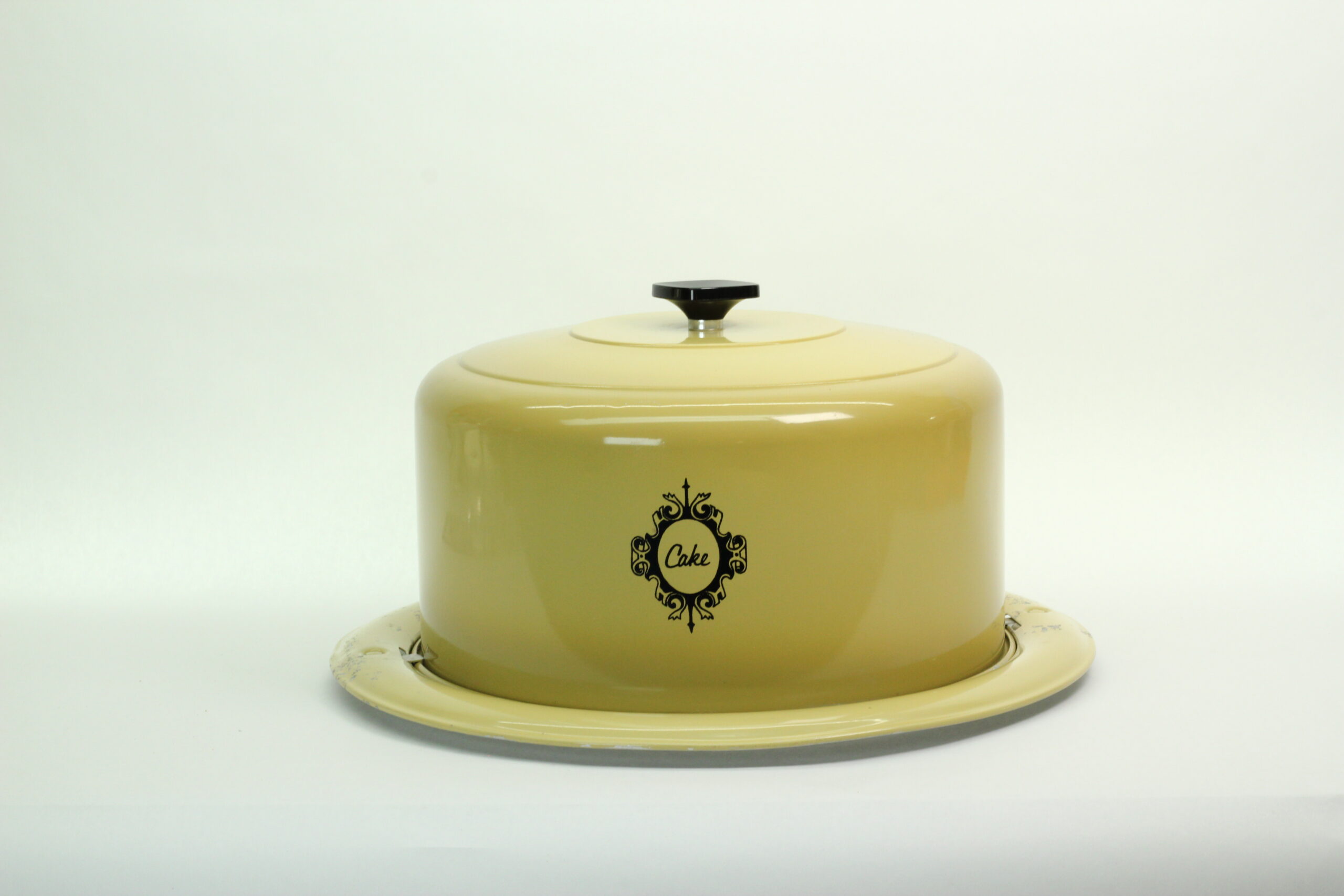 This vintage West Bend cake carrier is the definition of mid-century kitchen charm — a buttery yellow dome with bold black “Cake” medallion, complete with its original serving tray base.