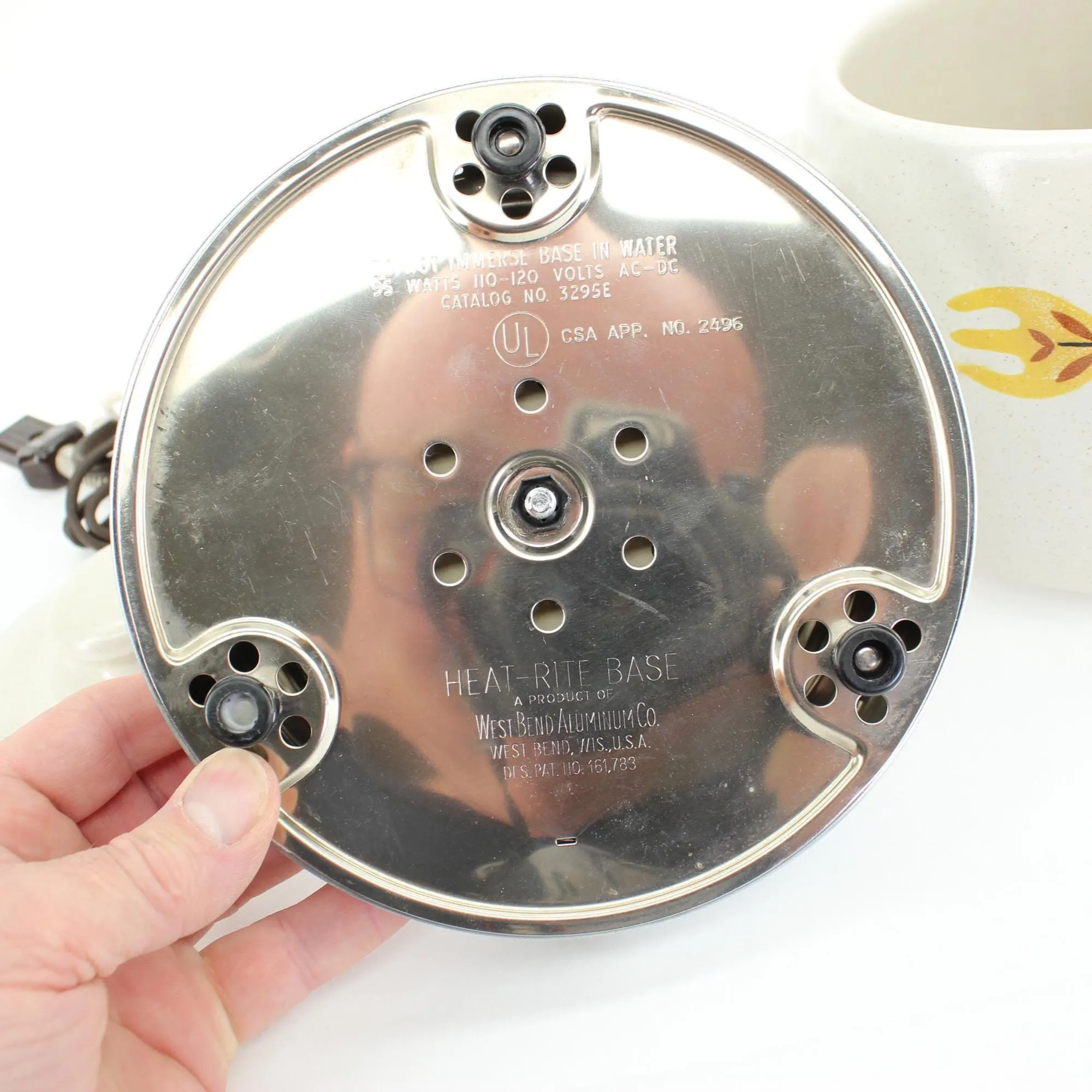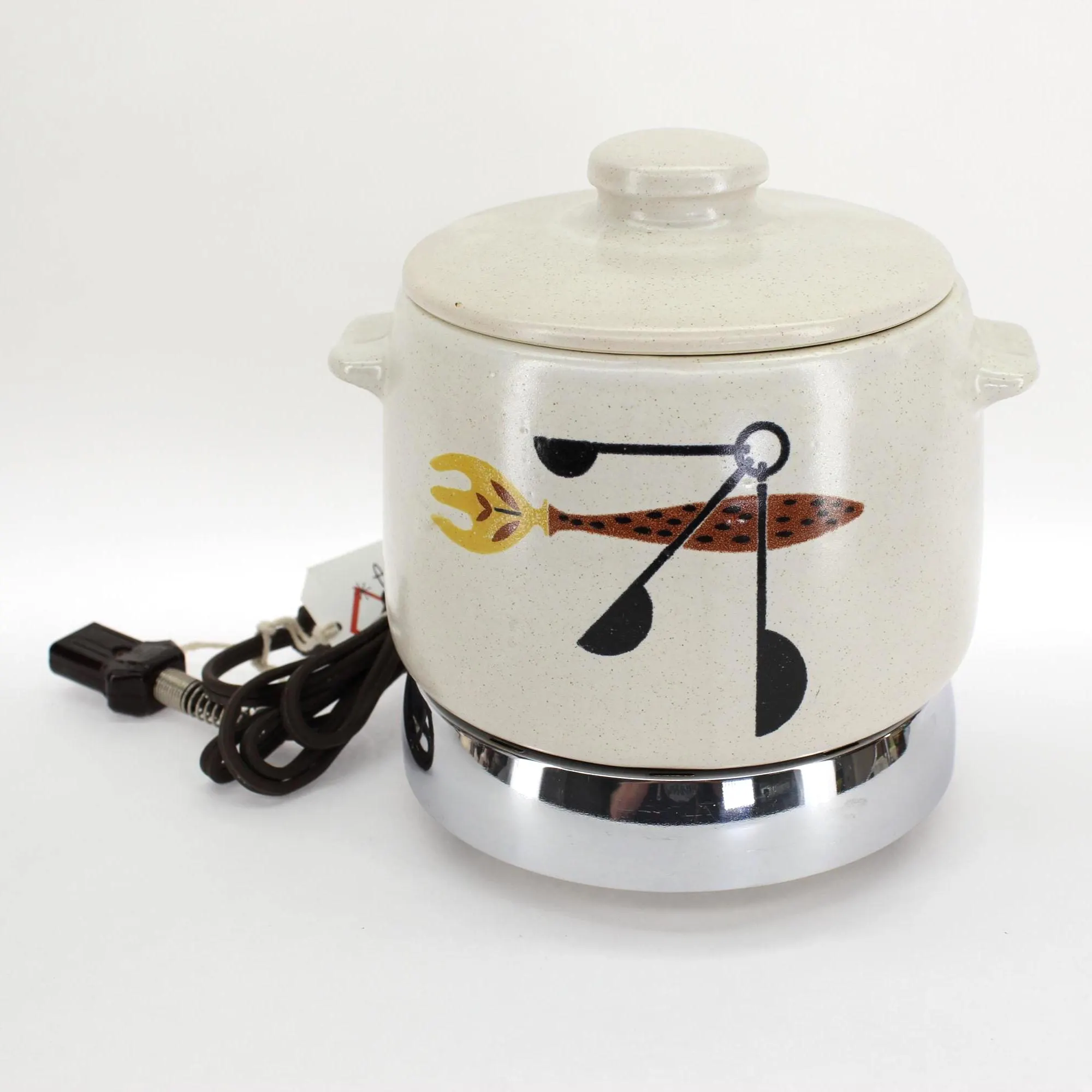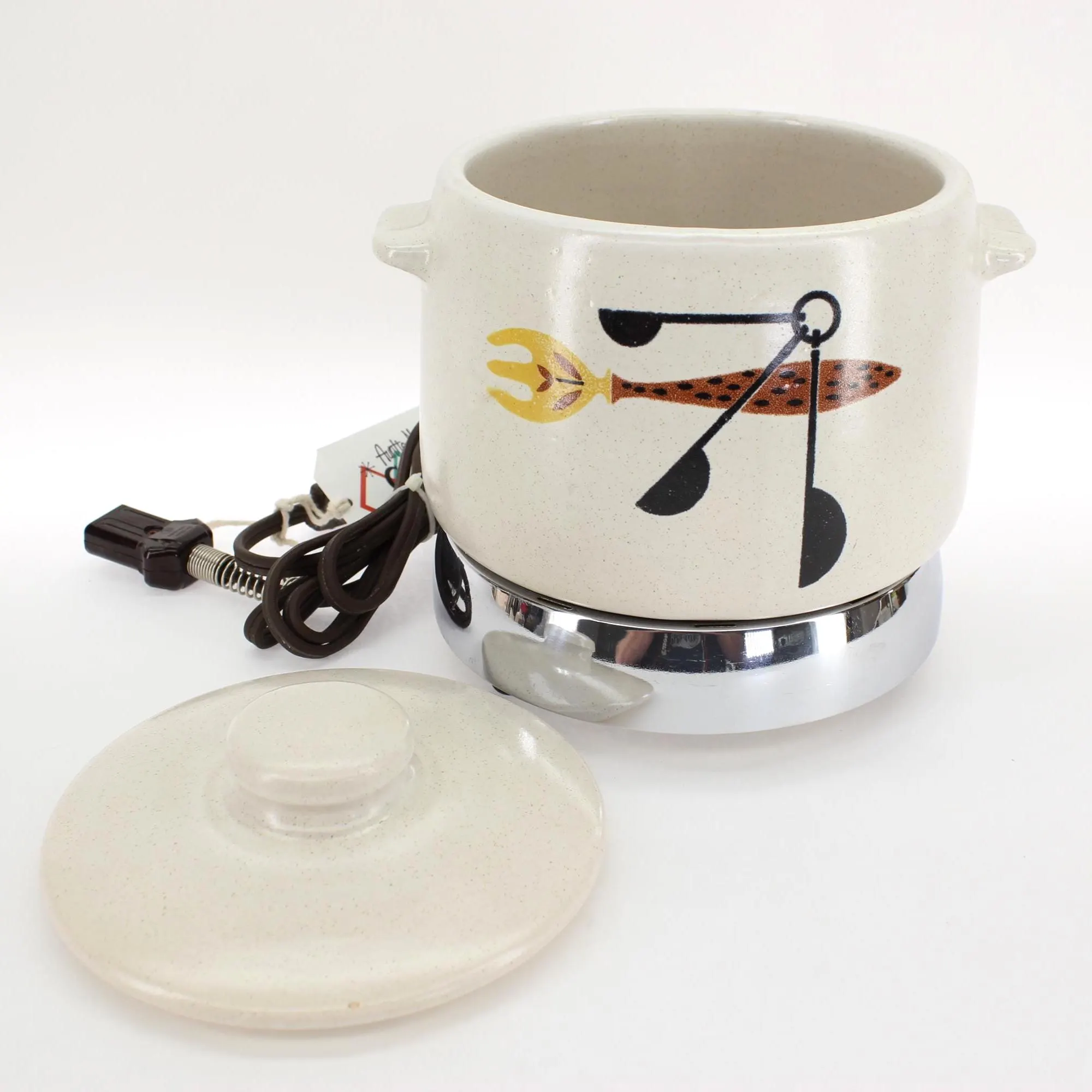 Channel your inner retro chef with this fabulous vintage West Bend electric slow cooker, straight out of the Atomic Age! This stoneware bean pot features the iconic mid-century “Atomic Kitchen Utensils” design — complete with abstract measuring spoons and a stylized fork motif — set against a warm speckled ivory ceramic base. Finished with a glossy chrome heating element and original cord, it’s a perfect blend of form and function.