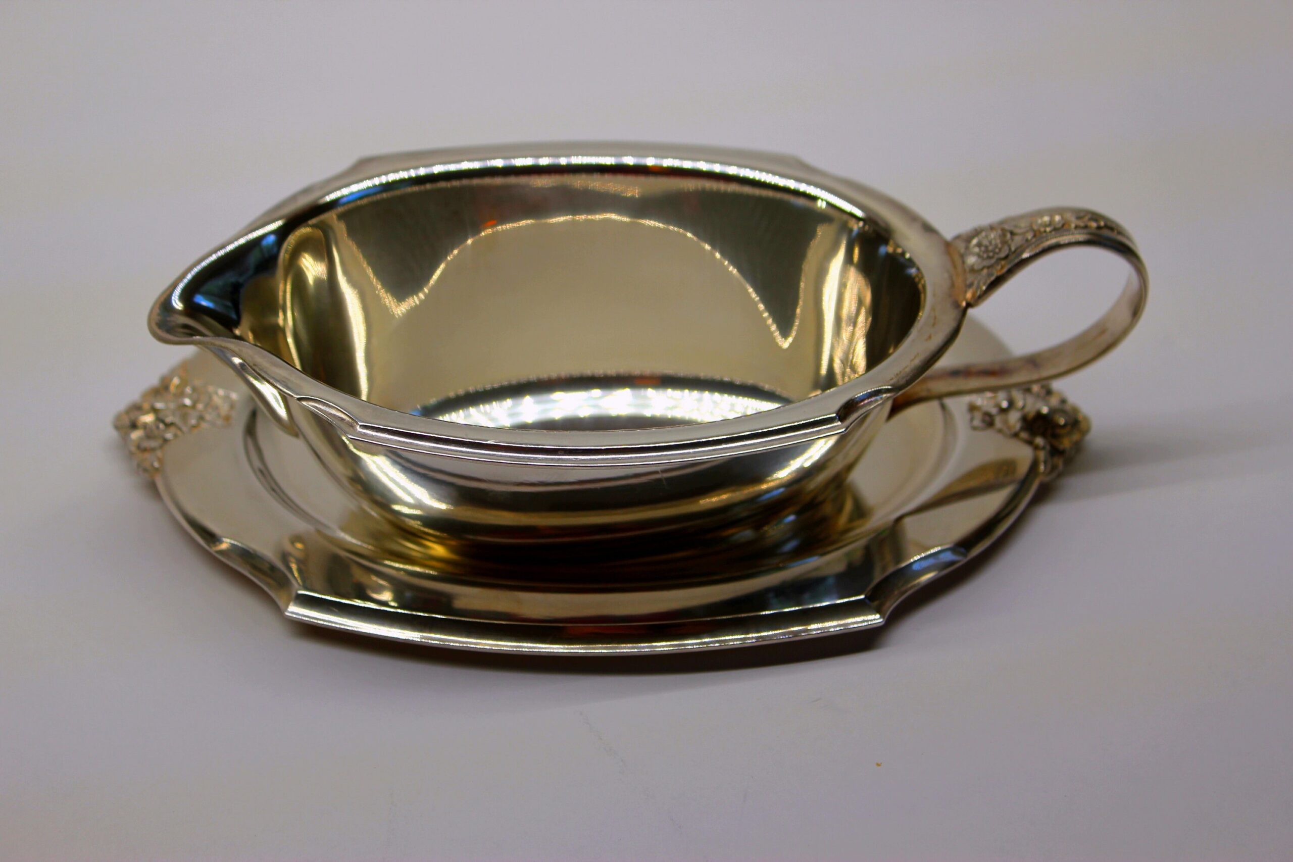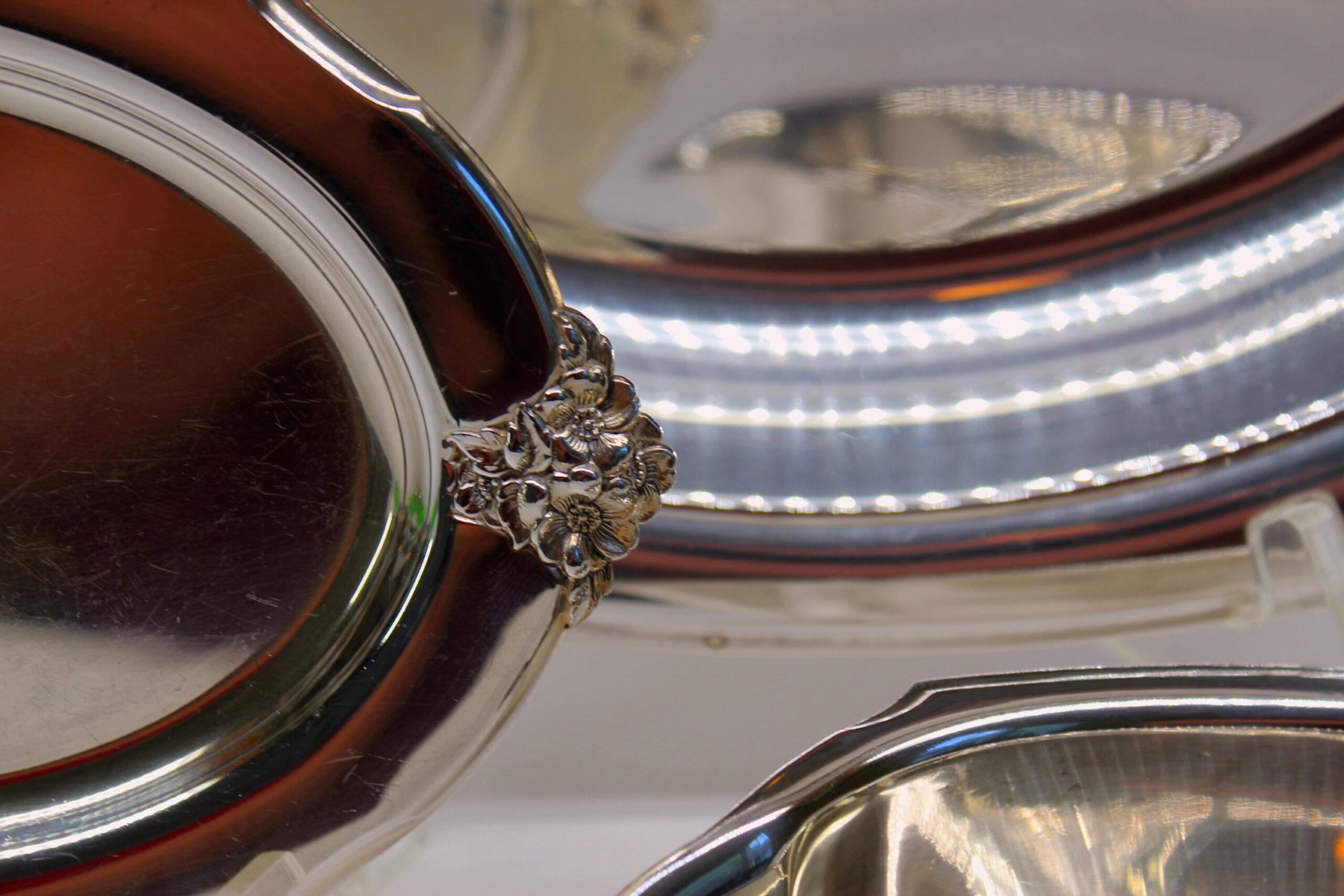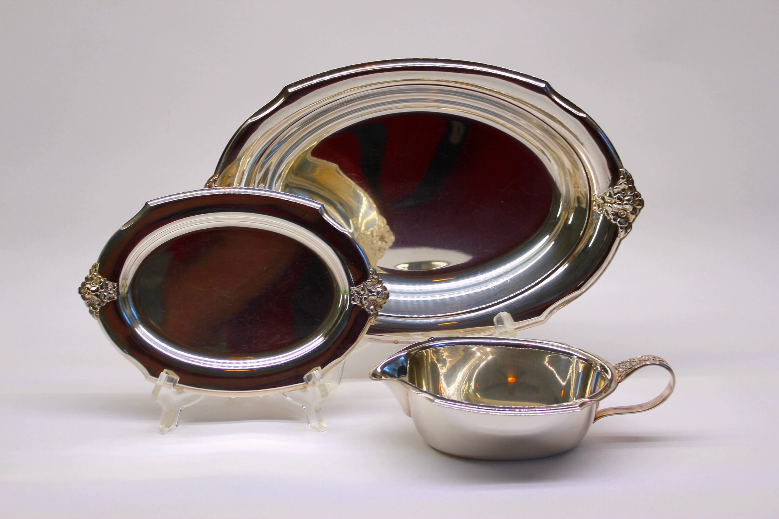 This vintage silver-plate serving set sat in Aunt Nen’s curved-front china cabinet for years- never touched, rarely polished. When it came to Momma’s, I probably polished it once, then it was relegated to the bottom of her china cabinet, which moved with me. It’s now once again polished to shining perfection and ready to become part of your silver-plate collection! The gravy boat is 8″ from handle to spout, 4″ across, and 2.5″ high at the tallest point, which is the top of the handle. The tray for the gravy boat is 5.5″ by 8″, and does show a bit of hazy light scratches as it’s had a metal boat sitting on it for 75 years! The serving bowl is 12″ long and 10″ across, and about 1.75″ deep. They are all made of silverplate on a substantial base and polish up beautifully!